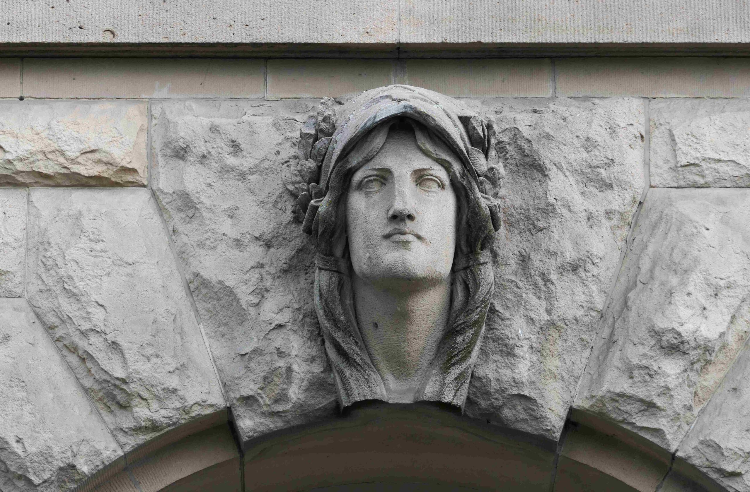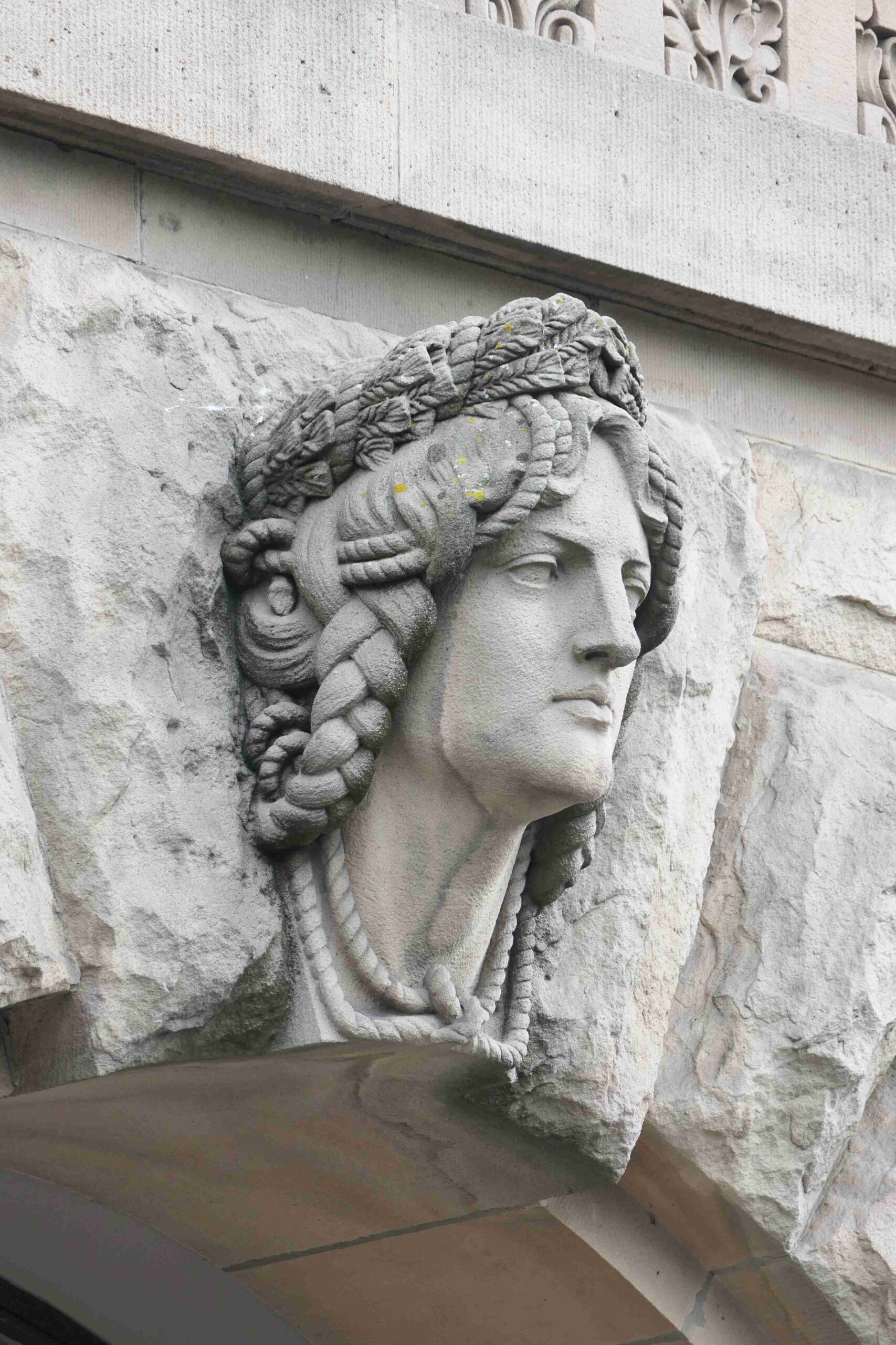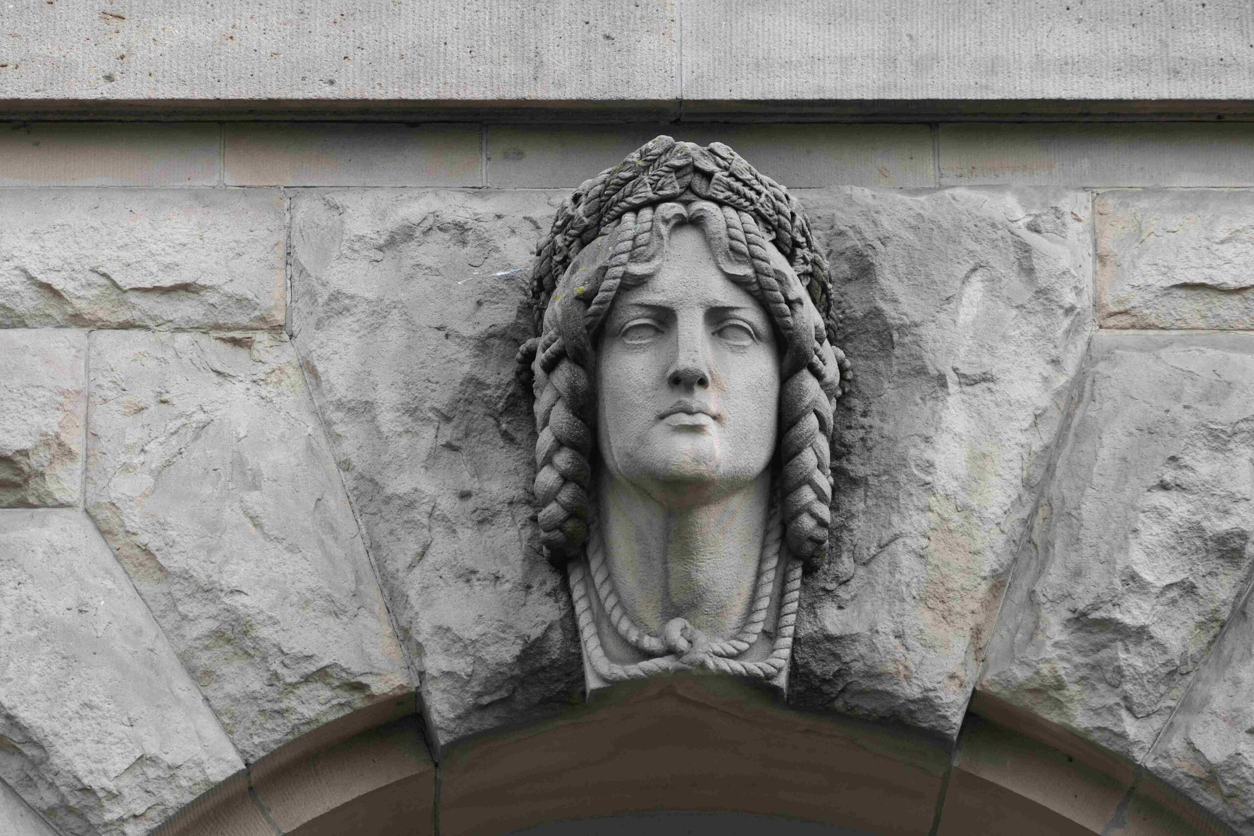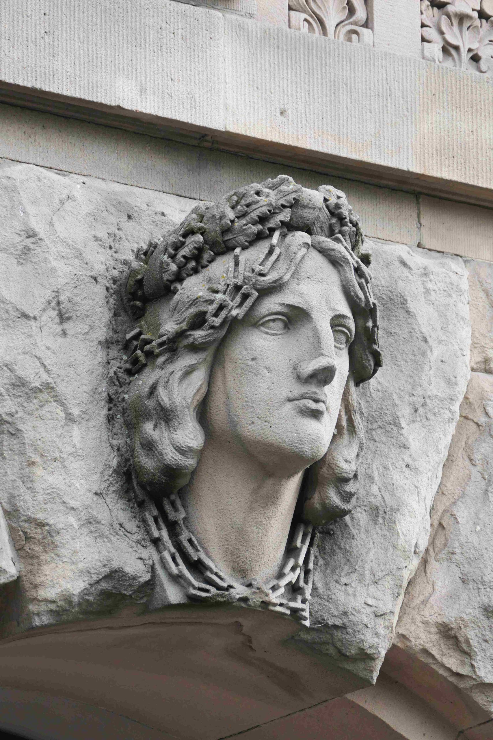 Der rechte Frauenkopf trägt einen Eichenkranz im Haar und ist vermutlich als Germania zu deuten. Der mittlere Kopf trägt einen korinthischen Helm, daneben sind Lorbeerzweige erkennbar, so dass es sich vermutlich um Athena, die Göttin der Weisheit handelt. Das Haar des rechten Kopfes ist mit einem Ährenkranz bedeckt, was auf Demeter, die Göttin der Ernte, hinweist (Nicola Vösgen).