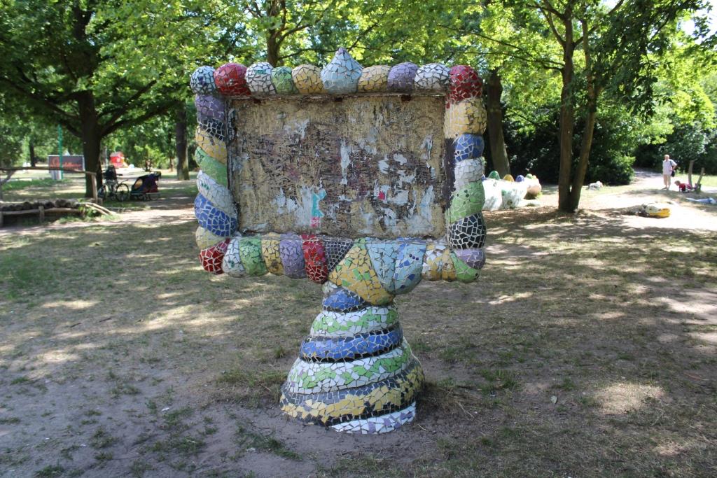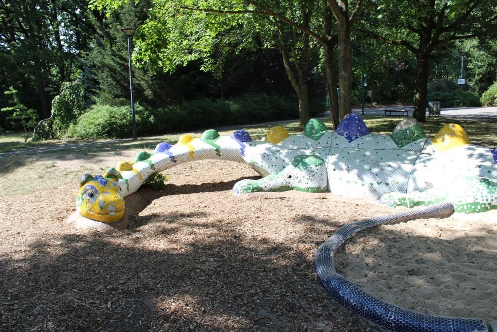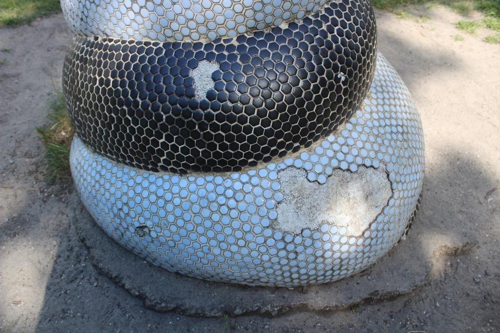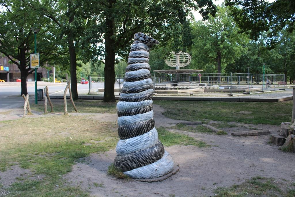 Die Zementplastik steht direkt auf dem sandigen Boden einer Art Spielplatz. Sie ist Teil eines künstlerischen Ensembles, zu dem noch eine Tafel, zwei Drachen und ein Obelisk zählen. Die fünf Objekte stehen in unmittelbarer Nähe und weisen zudem ähnlich gefertigte Oberflächen aus Mosaiken oder Mosaikplatten auf. Vor allem einer der zwei Drachen dient besonders als Spielgerät für Kinder und umgibt einen kleinen Sandkasten. Die Plastik ist überlebensgroß und verjüngt sich nach oben durch mehrere aufeinanderliegende Segmente. Diese sind mit abwechselnd hellgrauen/hellblauen und dunkelgrauen Keramikplatten bestückt und ergeben so ein sich nach oben windendes Kunstwerk. Dieses trägt zwar die Bezeichnung „Schnecke“, erinnert jedoch eher an ein abstrahiertes Schneckenhaus. Auffällig ist das obere Ende der Zementplastik, welches mit einem plateauartigen, abgeschrägten Segment wie abrupt endet. Durch die unterschiedlich großen und schlangenartigen Partien wirkt die Plastik zwar ansatzweise organisch, ähnelt allerdings kaum den Proportionen einer Schnecke. Insgesamt erscheint diese Plastik gegenüber z.B. dem einen, komplett sichtbaren, Drachen relativ unspektakulär. Denn der Drache fällt nicht nur durch seine Größe und die Verwendung von mehr Farbigkeit mehr auf, sondern ist auch mit einzelnen Mosaiksteinchen versehen (Nele Metzig).
