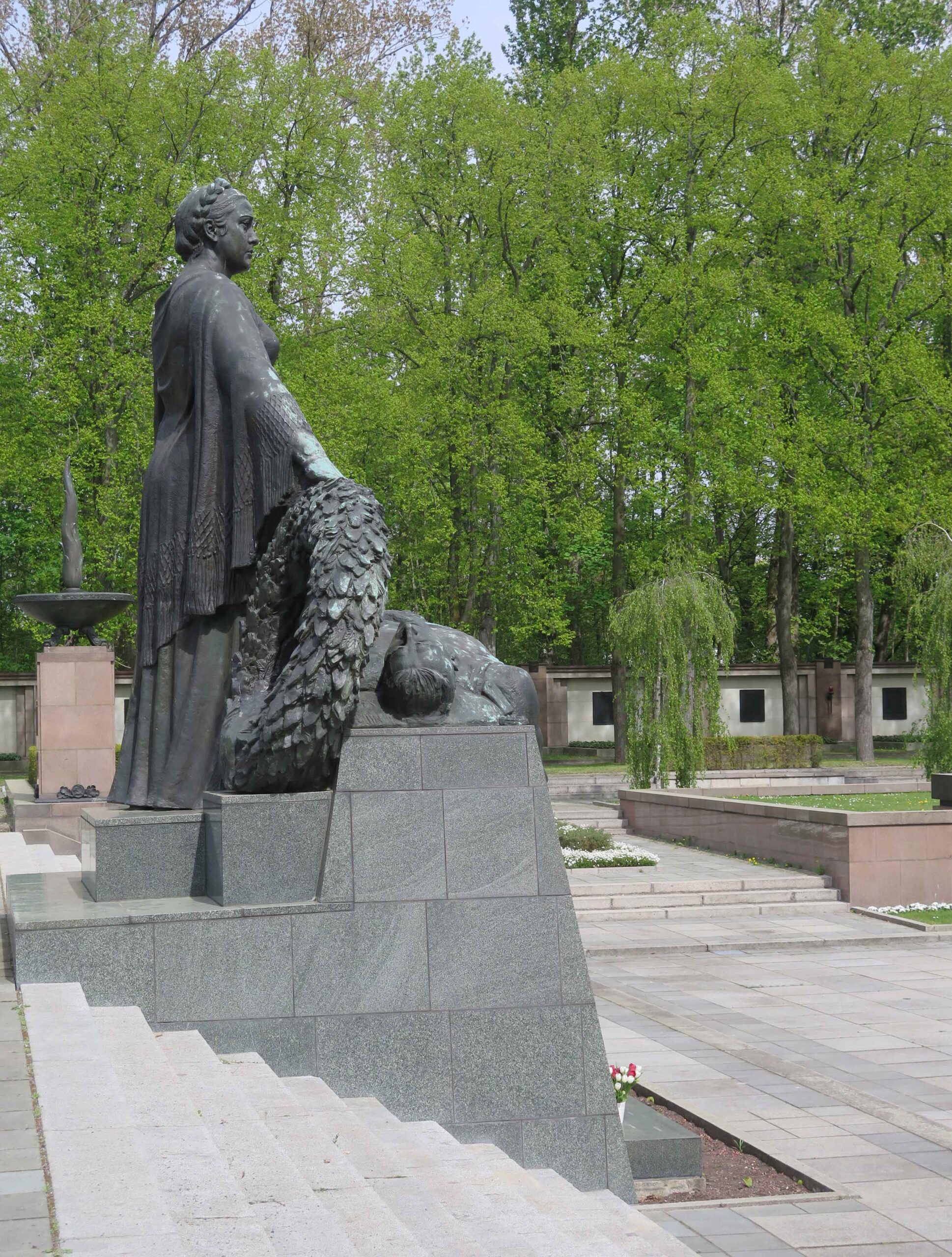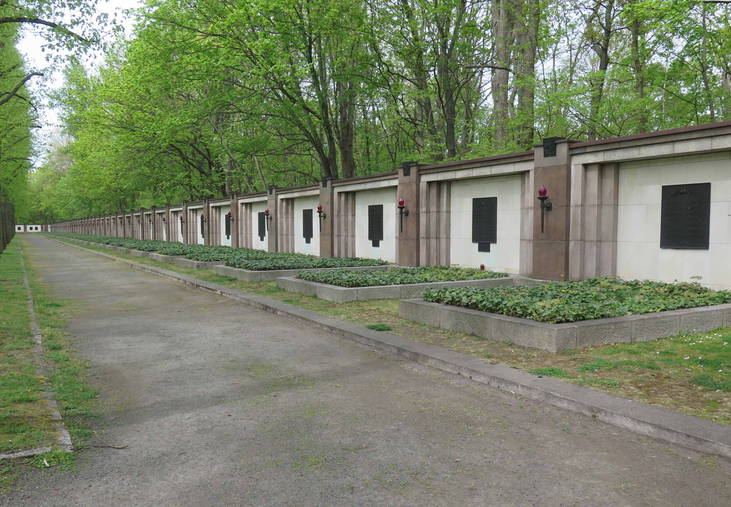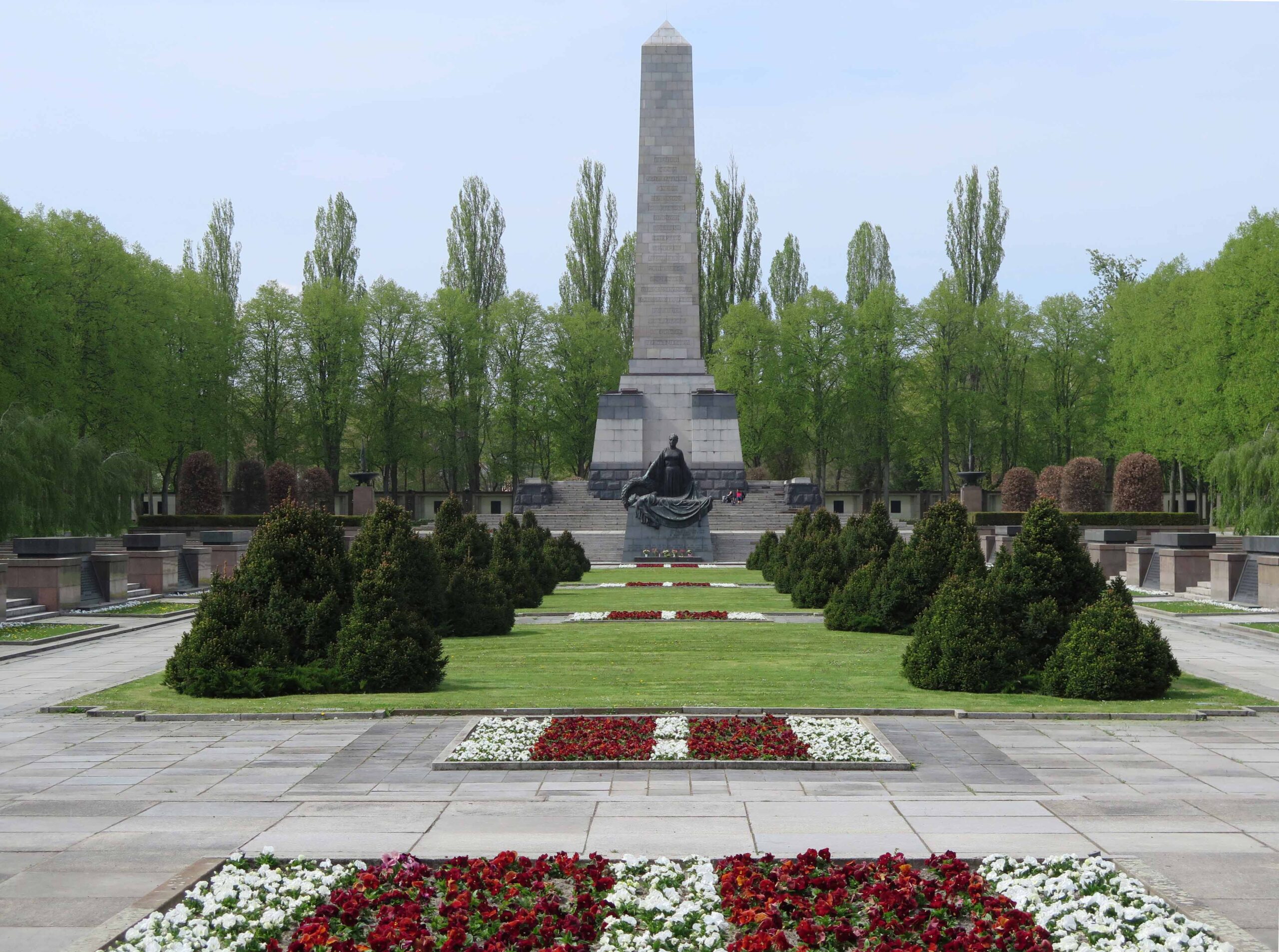 Auf mehr als drei Hektar Fläche, im Hauptbereich umfasst von einer 230 Meter langen Mauer, erstreckt sich das Ehrenmal der Sowjetischen Gefallenen im Volkspark Schönholzer Heide. „Das streng axial aufgebaute sowjetische Ehrenmal (…) gliedert sich in drei Bereiche: die Zugangsallee, den Vorplatz mit Torbauten und den von einer Mauer umgebenen Friedhof mit Obelisk. Der Haupteingang an der Germanenstraße wird von Granitpfeilern mit Bronzeschalen, in welchen das ewige feuer als stilisierte Bronzeflamme lodert, markiert. Lindenalleen rahmen die hier beginnende etwa 80 Meter lange Zufahrt und fokussieren den Blick auf die im Hintergrund gelegenen Torbauten und den in der ferne aufragenden Obelisk. Am Ende der Allee öffnet sich der weite, mit Mosaikpflaster und Granitplatten befestigte Vorplatz, auf welchem die Torbauten den eigentlichen Eingang bilden. Die sich nach oben verjüngenden, mit rotem Granit verkleideten Pfeilerstümpfe erinnern an ägyptische Sepulkralarchitektur. (…) Die von Norden zugänglichen Innenräume der Torbauten sind als offene Gedenkhallen konzipiert und nehmen jeweils Bronze-Urnen sowie Vitrinen mit Orden auf. Oberlichter aus farbigem Kunstglas, die das Staatswappen der Sowjetunion darstellen, belichten die (…) Räume. Daran schliessen offene säulenhallen an (…). Das anschliessende Plateau ermöglicht den Überblick über den Soldatenfriedhof, der sich über drei Ebenen erstreckt. (…) Die (…) Figurengruppe der trauernden Mutter Heimat mit dem vor ihr aufgebahrtem gefallenen Sohn stellt den bildhaften Abschluss der Achse dar. Über stufen gelangt man (…) auf die obere Ebene, in deren Zentrum sich das Monument des Obelisken über gestuftem Unterbau erhebt. (…) Das (…) Bauwerk (…) wird von schwarzen Porphyrquadern gefasst, an welchen 42 Bronzetafeln die Namen der gefallenen Offiziere verzeichnen. (…) Die mittlere Ebene (…) erstreckt sich beiderseits der tiefliegenden Mittelachse (…). Hier befinden sich jeweils acht Sarkophage, die in ihrer Gesamtzahl die 16 Republiken der damaligen Sowjetunion versinnbildlichen. Die Gemeinschaftsgräber wurden als große Stahlbetongruften ausgeführt (…). An Vorder- und Rückseite (…) führen je drei Stufen auf die untere Ebene beziehungsweise zum Umgangsweg, von dem man über eine weitere Treppenanlage auf die am höchsten gelegene äußere Ebene gelangt. Die obere Stuftenfolge wird durch lehnenlose Steinbänke unterbrochen (…). Die von Torbau zu Torbau reichende, fast 230 Meter lange Umfassungsmauer bildet den äusseren Rahmen, an dem sich 43 Nischen mit davor gelegenen Grabflächen aufreihen. Die Achsmitte der rückwärtigen Mauer kennzeichnet der gedenkstein für die Sowjetischen KZ-Opfer, zu dessen beiden Seiten wiederum je sieben Nischen mit Gemeinschaftsgräbern anschließen (…). (vgl. R. Eckert, in: Gartendenmale in Berlin: Nachkriegszeit, Berlin 2018, S. 297-303).