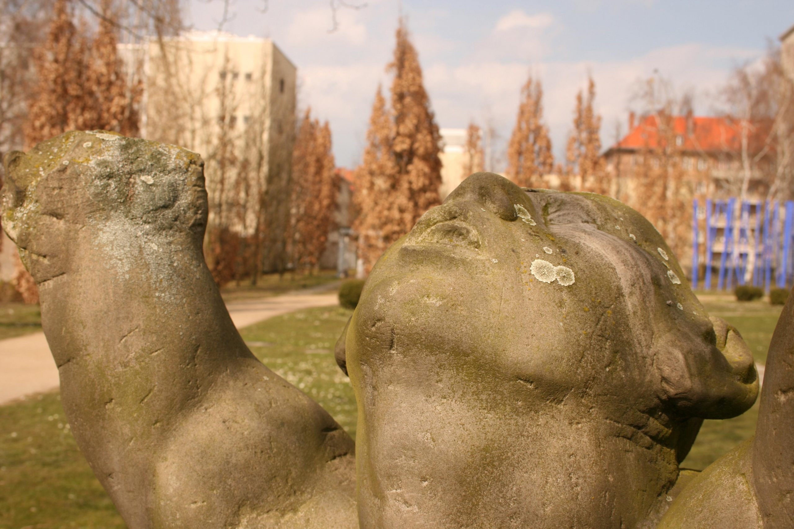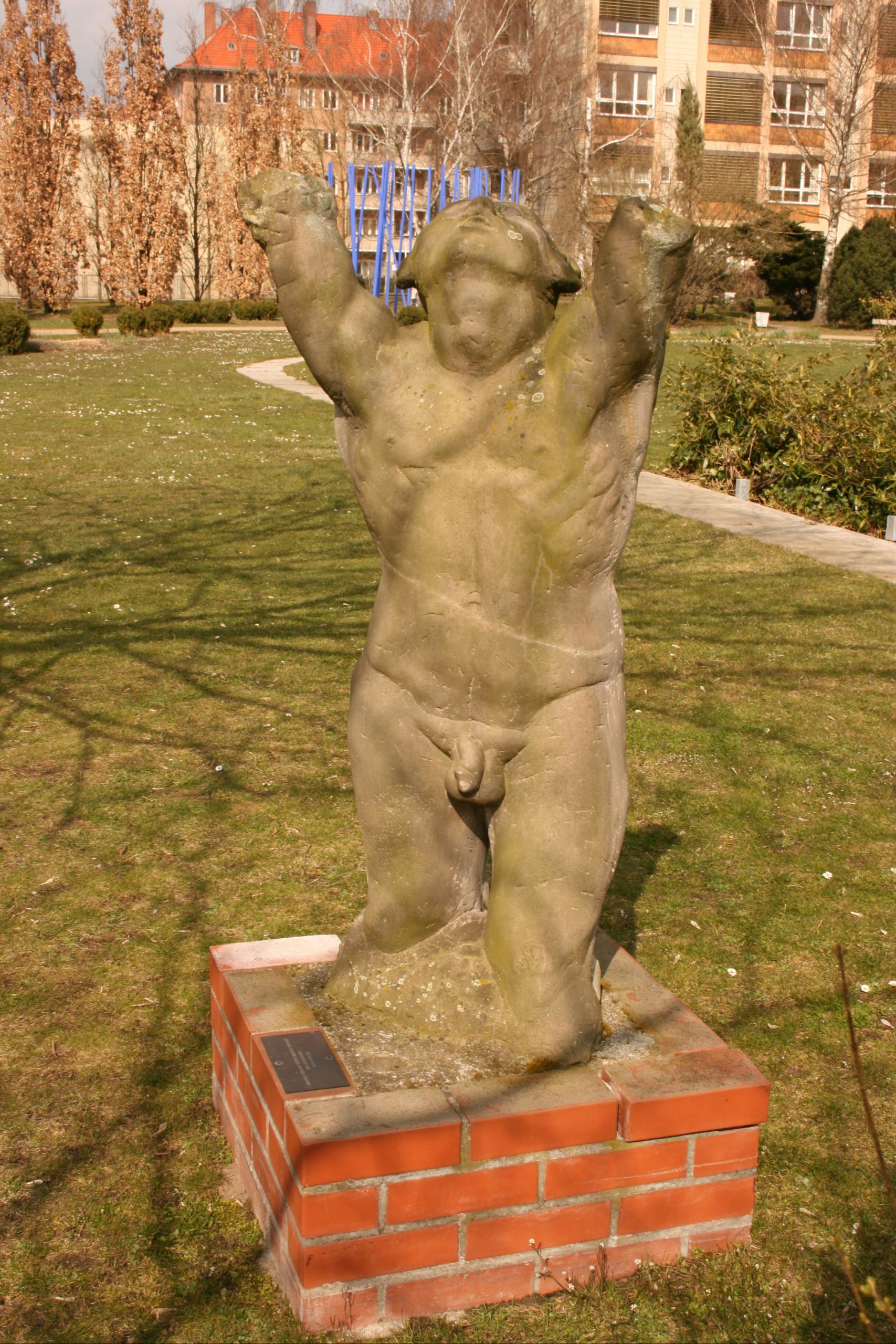 Im nordwestlichen Bereich des Skulpturengartens steht auf einem aus roten Ziegelsteinen gemauerten Sockel ein männlicher nackter Torso aus Sandstein, von den Knien aufwärts dargestellt, mit emporgereckten Armen (Schulteransätze und Teile der Oberarme vorhanden). Der muskulöse Mann steht in Schrittstellung, das Gesicht ist zum Himmel gerichtet, der Mund geöffnet. Die Oberfläche ist mit Kratzern strukturiert. Dargestellt ist mit dieser expressiven Skulptur der Aufschrei als menschliche Grunderfahrung des Leidens (Jörg Kuhn, Susanne Kähler).