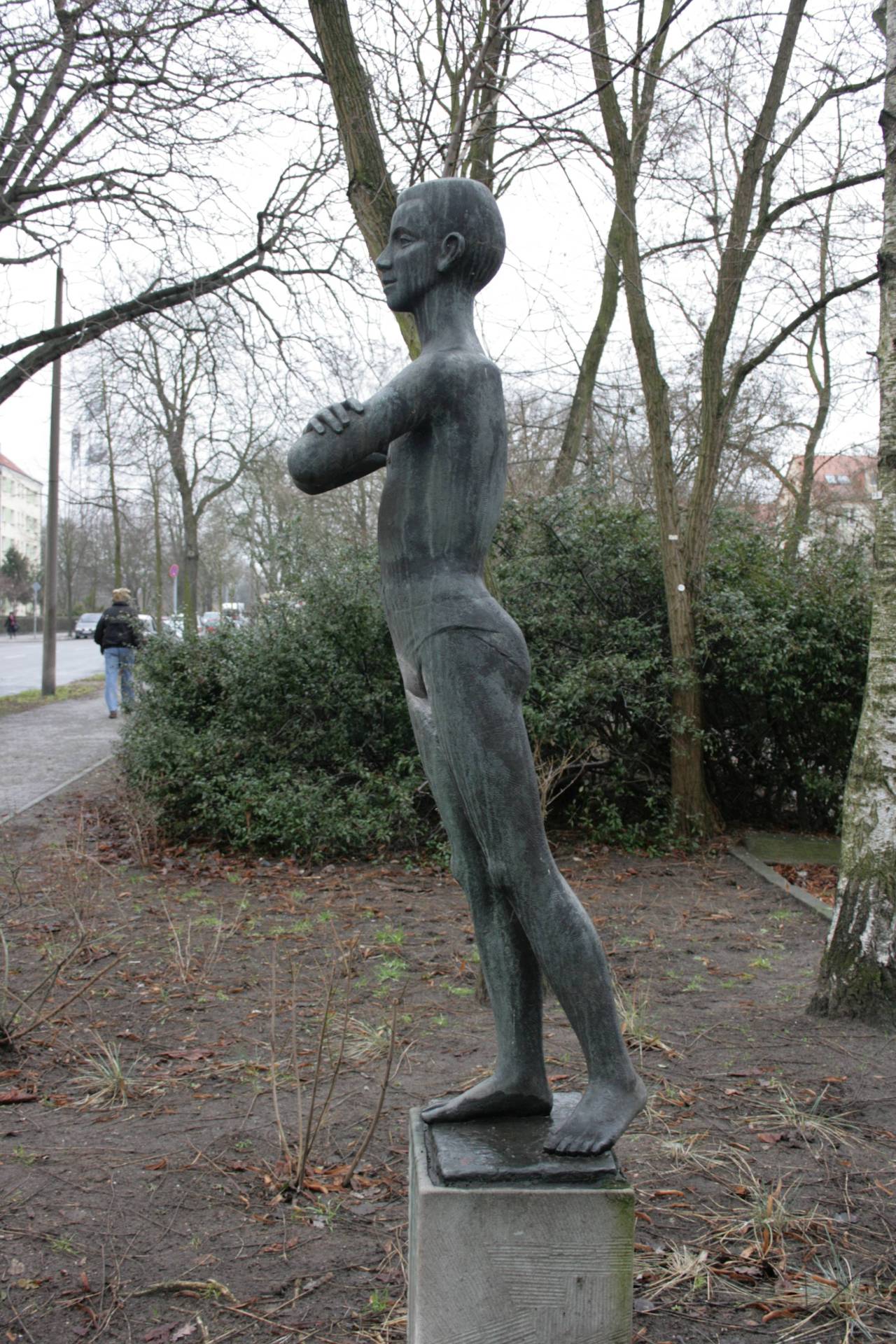 Auf einem niedrigen, rechteckigen Kalksteinsockel mit vertiefter Inschrift auf der Front stand bis zum Diebstahl und der Zerlegung der Plastik durch den später gefassten Dieb eine Knabenfigur aus Bronze. Der bis auf die Badehose unbekleidete, etwa 12-13 Jahre alte Knabe steht im Kontrapost, den Blick frontal ausgerichtet. Die Arme hat er vor der Brust verschränkt. Das noch kindliche Gesicht unter dem Bürstenhaarschnitt zeigt ein selbstbewusstes Lächeln (Jörg Kuhn).