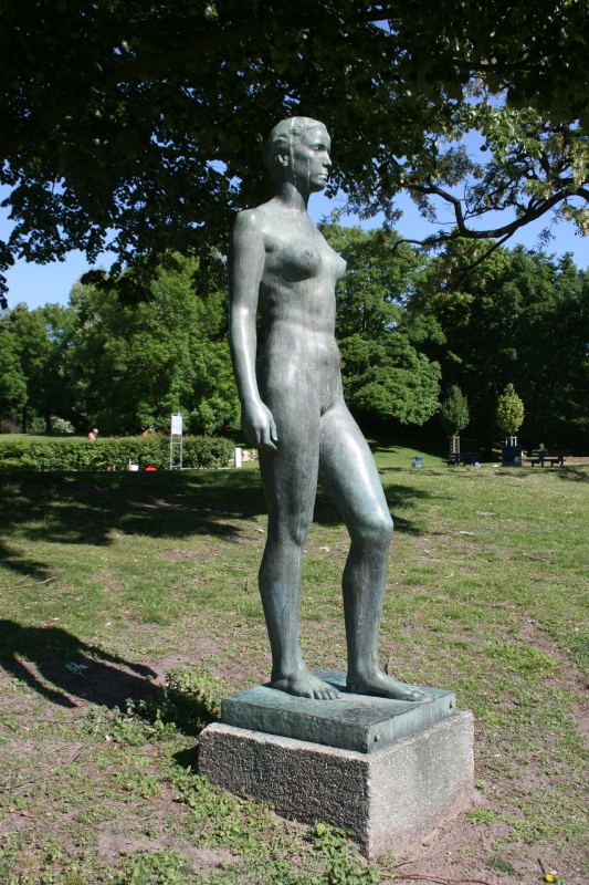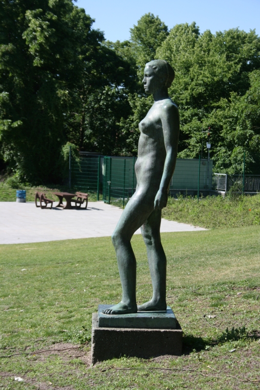 Standfigur einer Schwimmerin auf rechteckiger Plinthe, montiert auf einen rechteckigen Sockel. Der Kopf mit kurzem, fest anliegendem Haar ist gerade nach vorne gerichtet. Die Arme sind gerade nach unten geführt. Es scheint, als ob sie sich gerade auf den Sprung ins Wasser vorbereitet (Susanne Kähler).