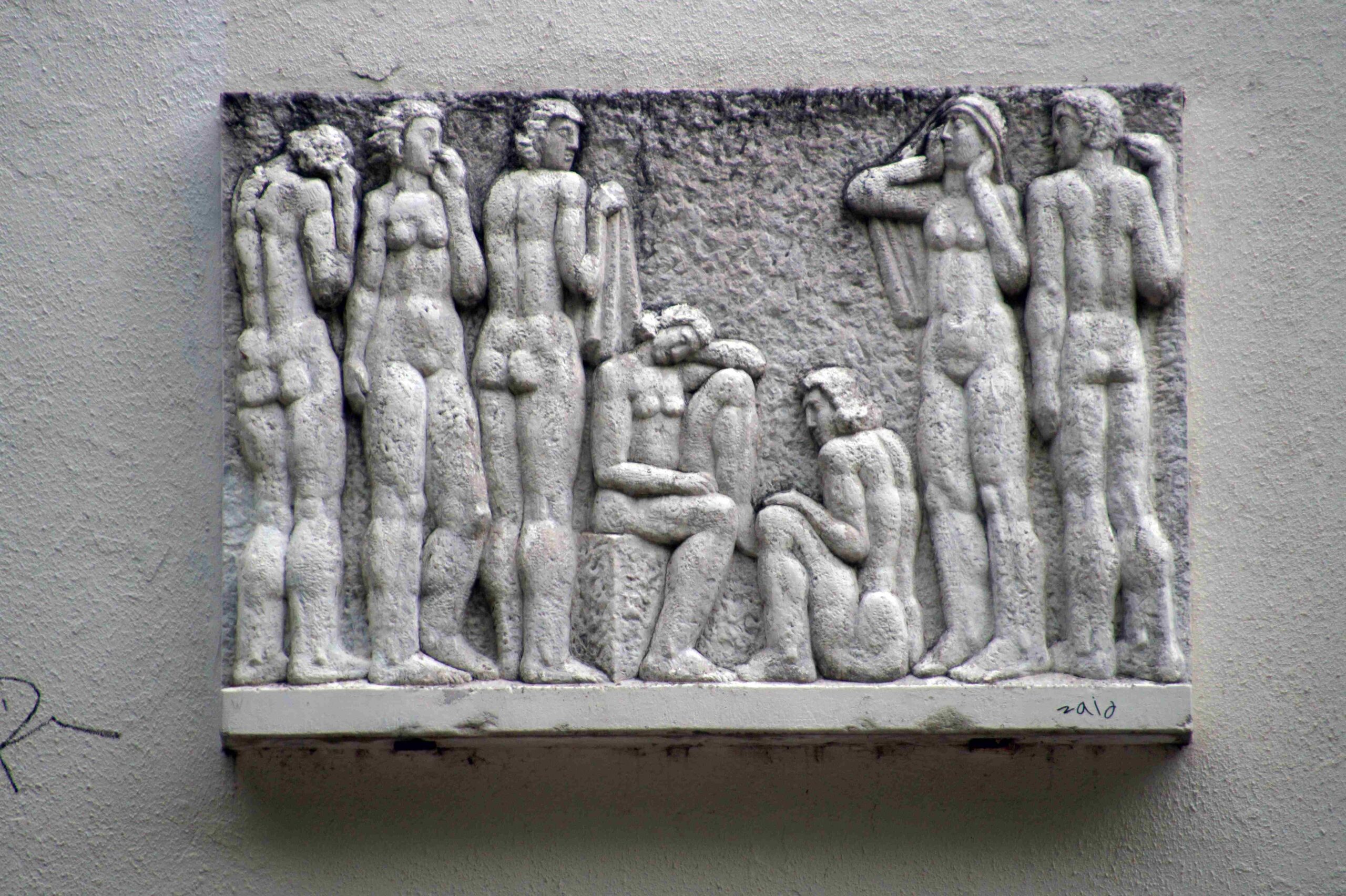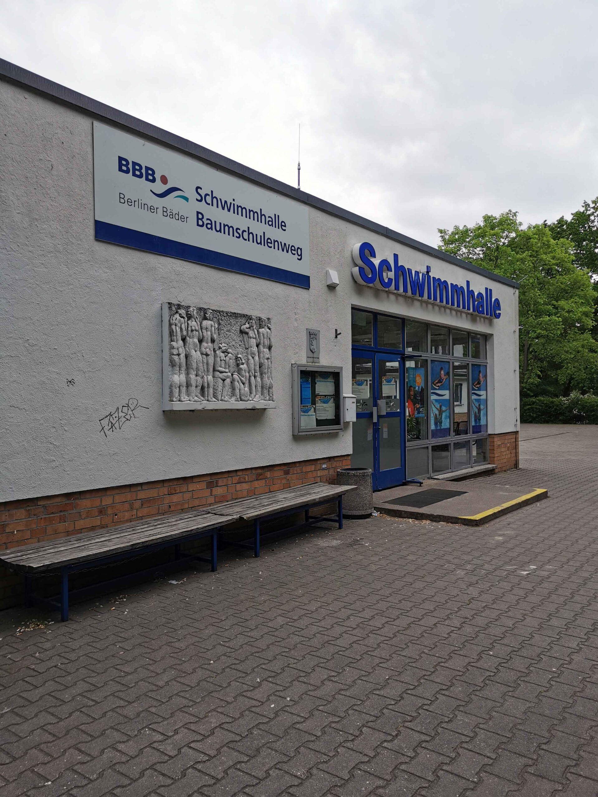Die Planungen für die Errichtung einer Schwimmhalle „in der verlängerten Baumschulenstraße“ wurden Anfang 1978 angekündigt (Neues Deutschland, 13.01.1978, S. 8). Die Eröffnung, das offizielle Anbaden, fand am Sonnabend, den 02. Februar 1979 statt (Berliner Zeitung, 02.02.1979, S. 8). Das Marmorrelief von Berndt Wilde mit dem Titel „Badende“ gehört zur ursprünglichen Ausstattung der Schwimmhalle und wurde 1978/79 geschaffen. Die Schwimmhalle Baumschulenweg war die neunte Schwimmhalle, die seit 1971 in der Hauptstadt gebaut wurde, und zugleich die erste im Stadtbezirk Treptow (Layla Fetzer).