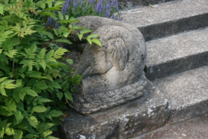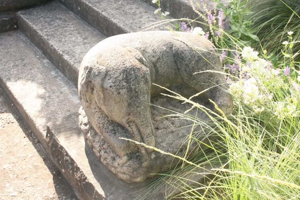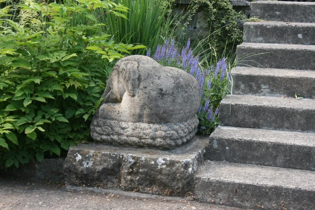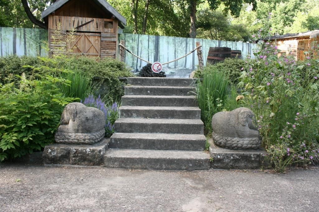Die drei kurzen Treppenzugänge zur Bühne vom Zuschauerbereich aus werden jeweils von einem antithetisch angeordneten Paar liegender elefanten auf den Treppenwangen flankiert. Die Tiere liegen halbkreisförmig eingerollt, was ihnen leicht die Anmutung von großen Hunden gibt. Die Stoßzähne, die trommelartigen Füße und die großen lappigen Ohren lassen aber keinen Zweifel aufkommen, dass es sich hier um Dickhäuter handelt (Jörg Kuhn).