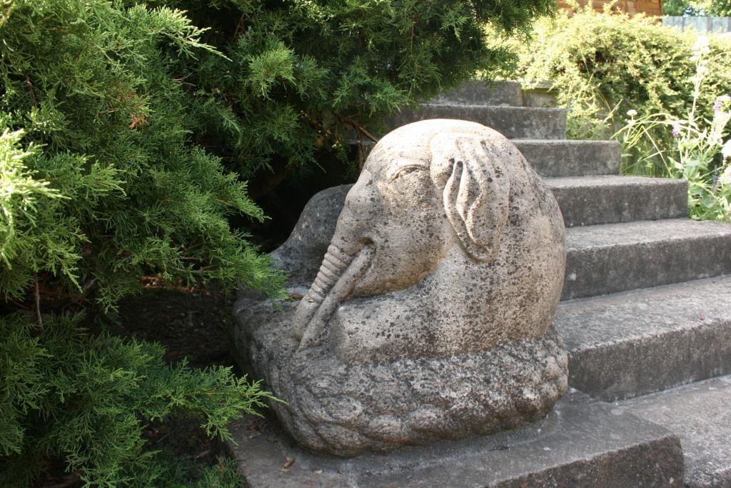 "Unbekannter Herkunft sind (...) die liegenden Elefanten, die die Treppenaufgänge vom Publikum zur Bühne flankieren. Zwei erhielten wir als Geschenk, vier ließen wir von Bela Kajdi (Potsdam-Babelsberg) aus Kalkstein nachschlagen. Es fällt uns schwer, die Originale von den Nachbildungen zu unterscheiden. Wir haben damit den 1969 fertiggestellten Kinderzirkus 1972, wie wir glauben, etwas schmucker gemacht" (Heinrich Dathe, 1980, S. 46). Die zwei älteren Tierfiguren stammen vielleicht aus einer jener legendären Filmkulissen der UfA.