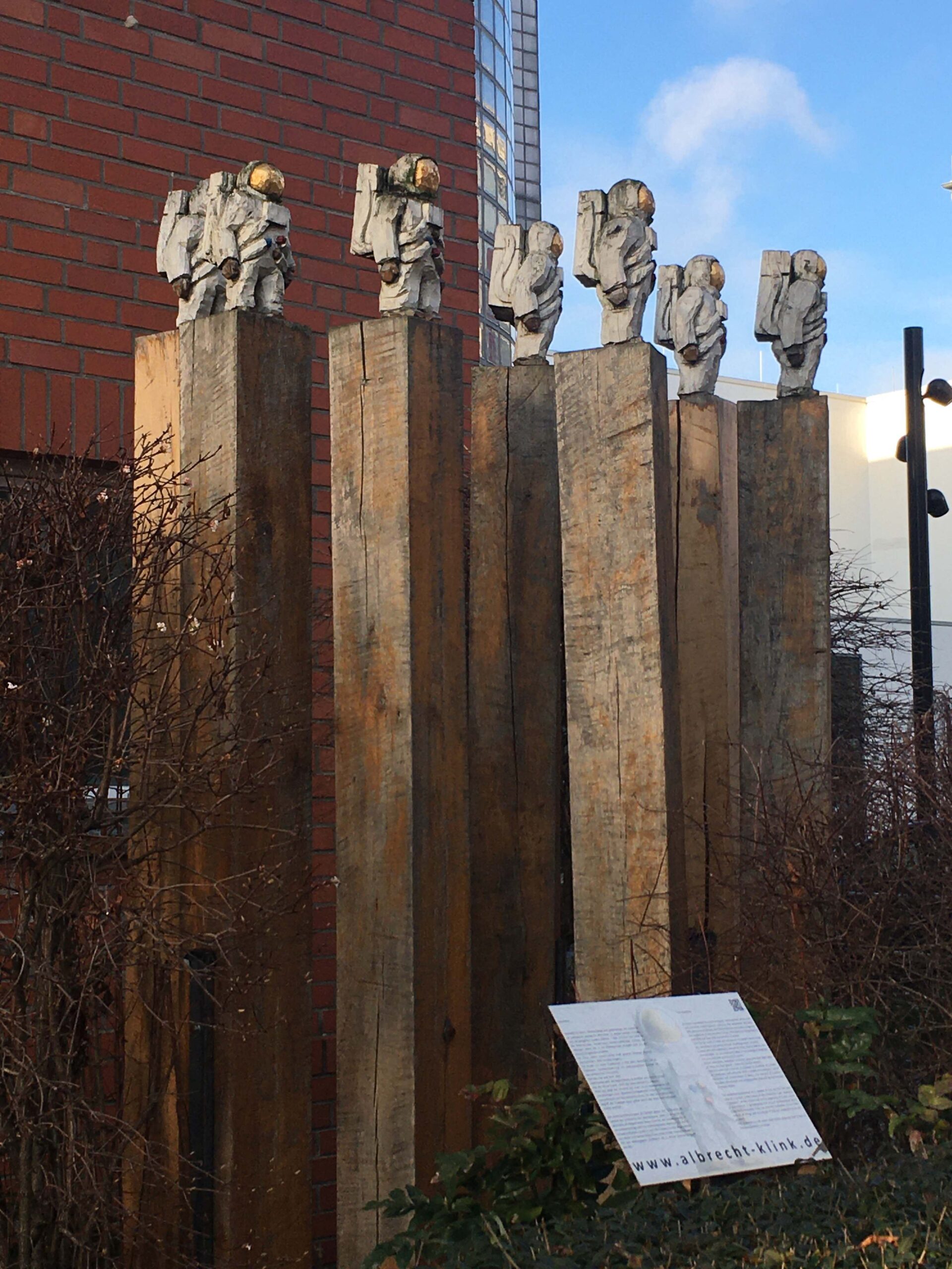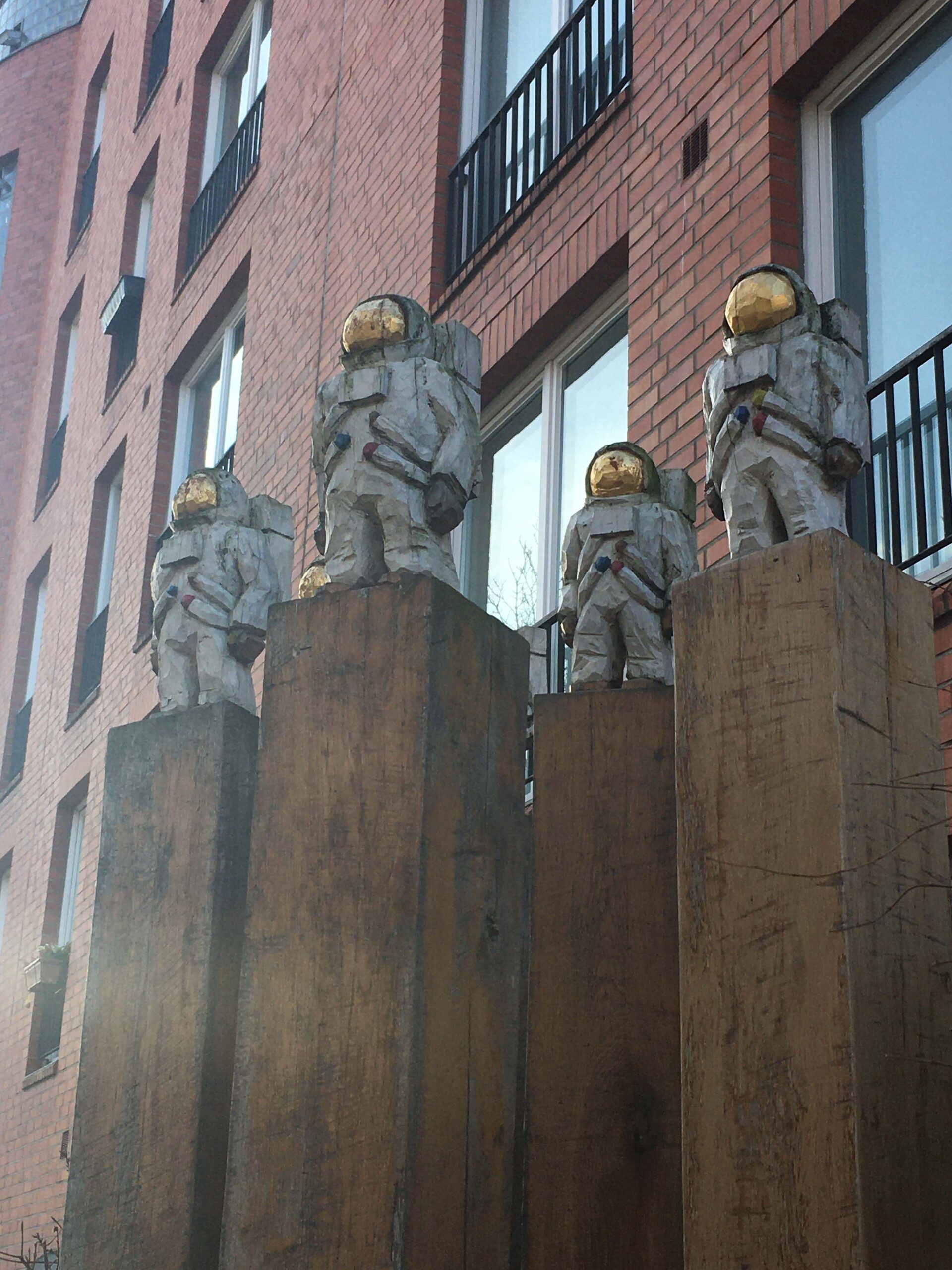 Die sechsteilige Skulptur mit dem Titel Seventies befindet sich im Vorgarten eines Miethauses in der Alten Jakobstraße in unmittelbarer Nähe zur Berlinischen Galerie. Aus dem Boden scheinen sechs, am Grund montierte, Eichenstämme zu wachsen, auf denen kleinformatige Astronauten in weißen Raumanzügen und Gold schimmernden Helmvisieren stehen. Besonders ist, dass Figur und Stamm jeweils aus einem Stück Eiche gefertigt sind. Die Skulpturen stehen leicht versetzt zueinander, scheinen schwerelos taumelnd, sodass der Eindruck entsteht, als seien sie soeben gelandet. Vor der Skulptur ist eine Informationstafel aufgestellt, die Aufschluss über die Interpretation des Künstlers gibt (Layla Fetzer).