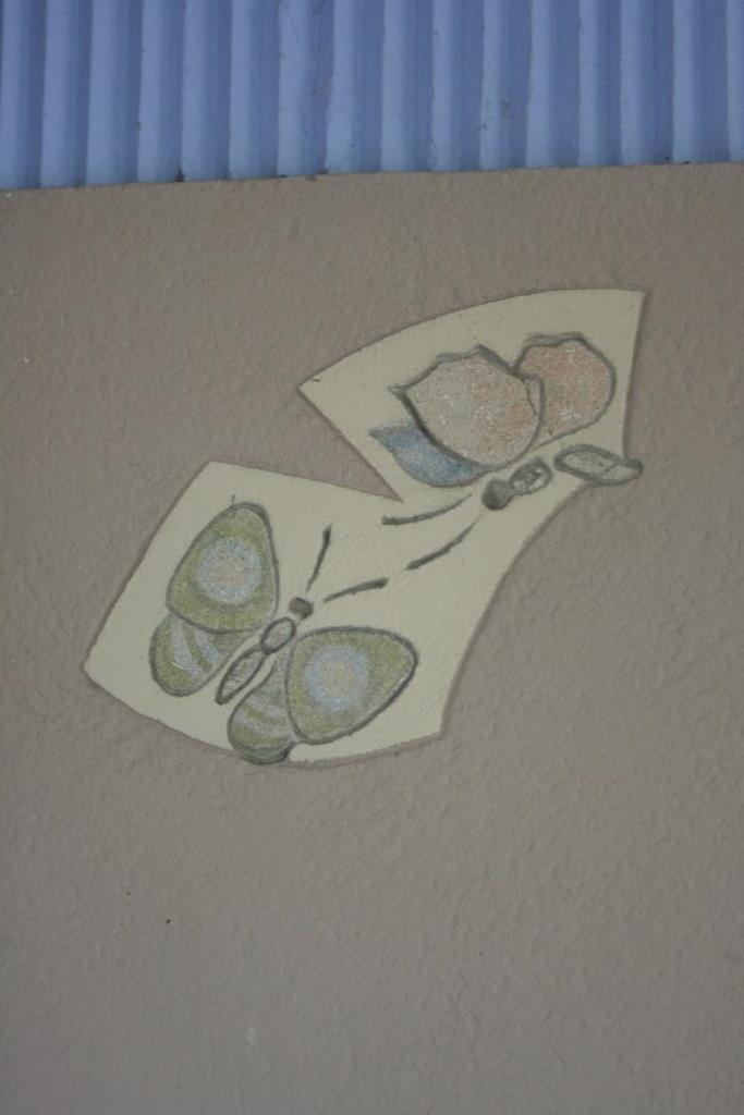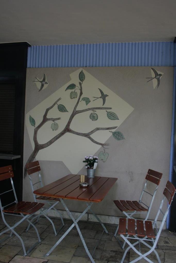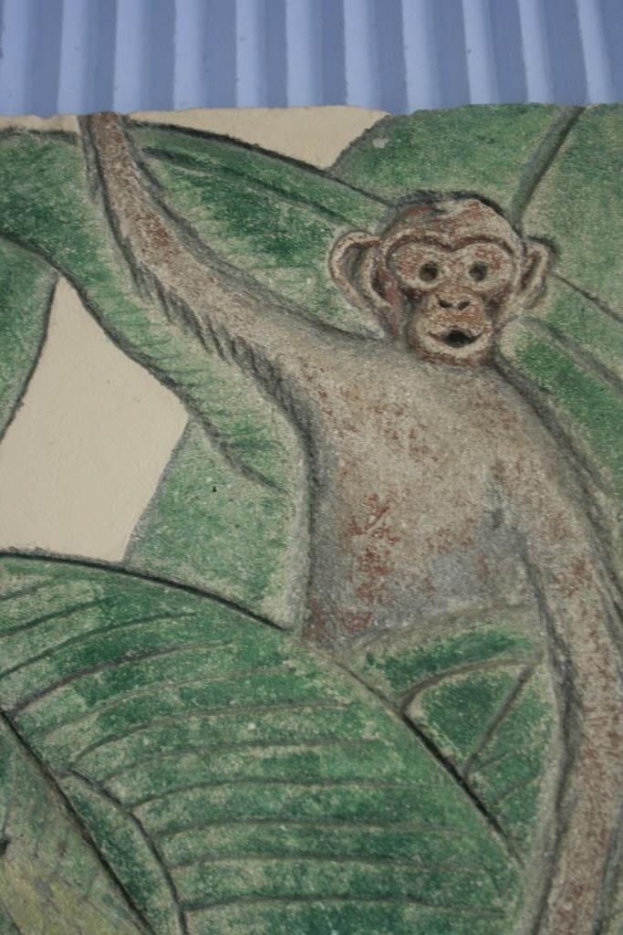 Wandgestaltung im Kindercafé links und rechts der Speisenausgabe an der Rückwand der überdachten Restaurantterrasse. In Hartputz in Sgraffitotechnik gearbeitete, abstrahierende Darstellung einer Palme mit gewaltiger Bananenstaude und Affe, Schmetterlingen und Schwalben im Flug. Zurückhaltende Farbigkeit in weiß, creme, grün, braun und gelb. Die Bananenstaude ist naturwidrig falsch herum dargestellt.
