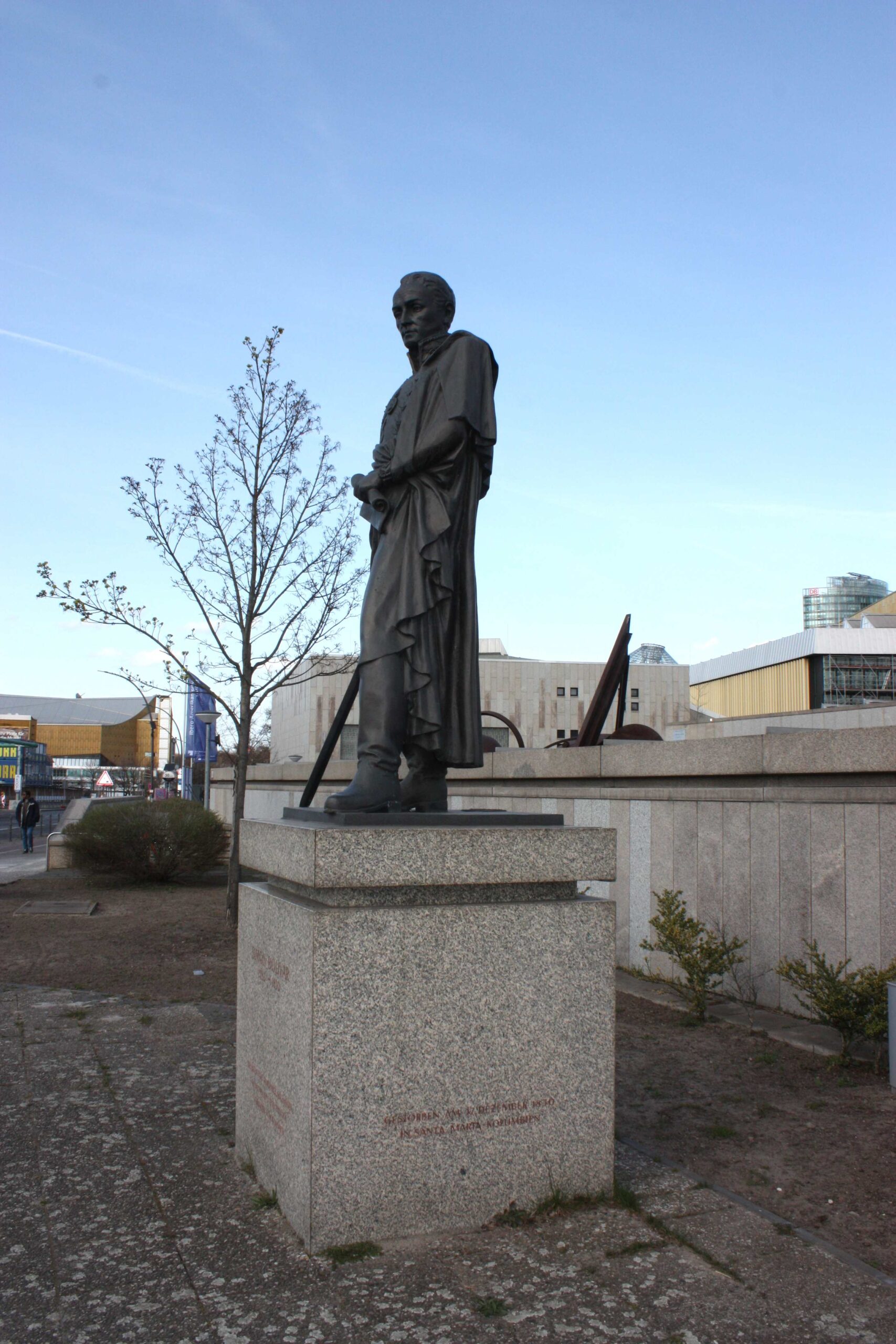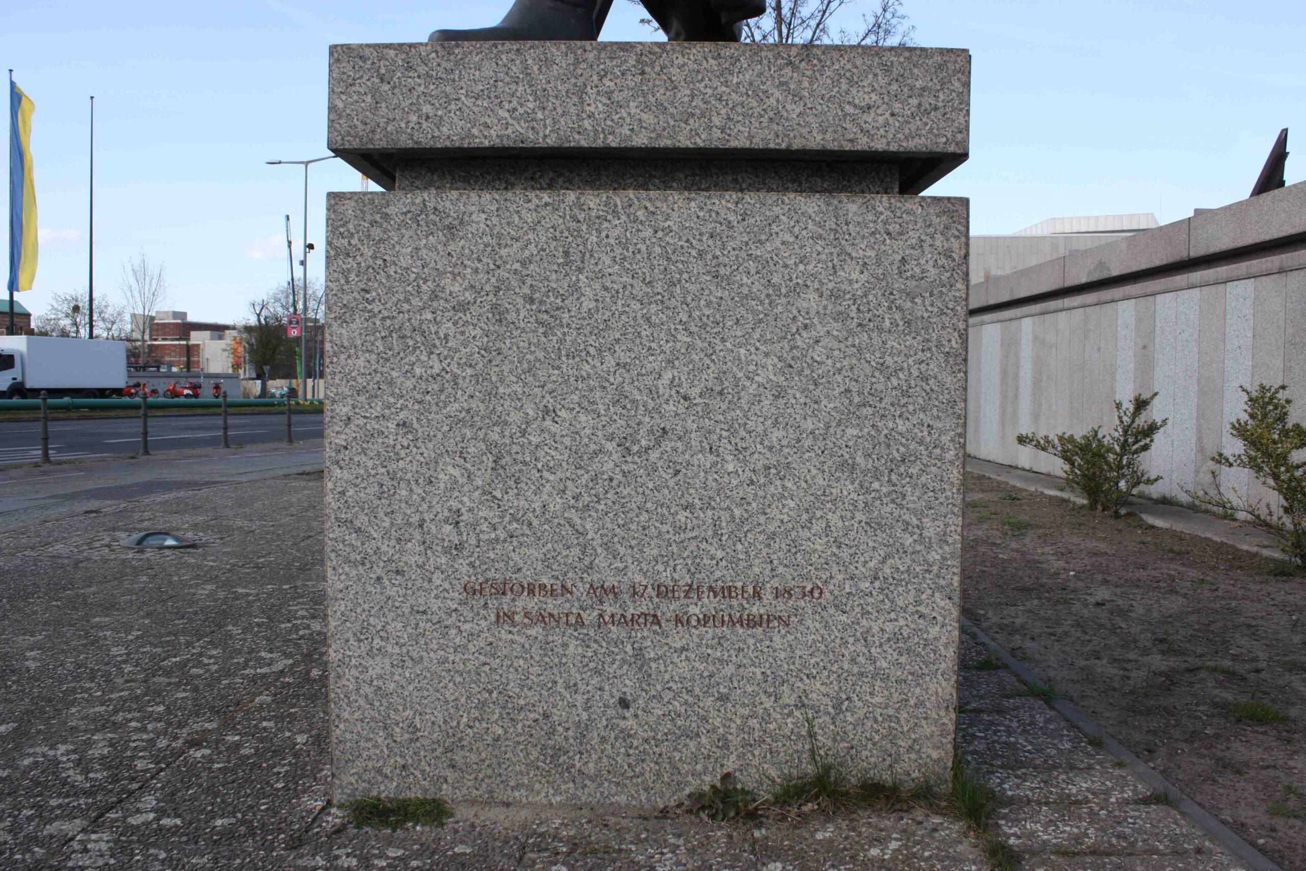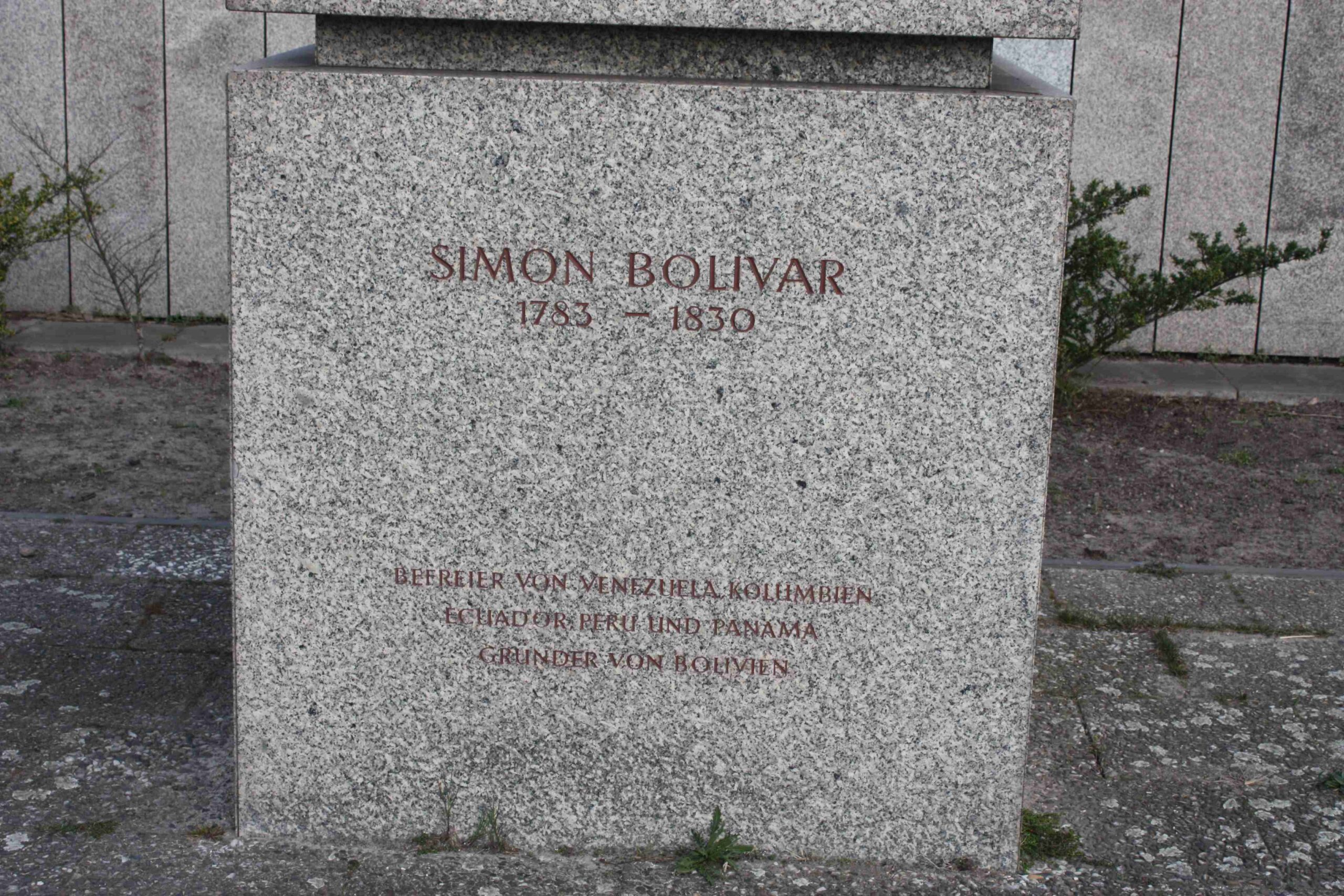 Statue des südamerikanischen Freiheitskämpfers und Staatsgründers Simon Bolivar (1783-1830). In Berlin steht eine 1997 von Martin Toledo in Venezuela angefertigte Kopie der Originalplastik, die vom italienischen Bildhauer Pietro Tenerani stammt und 1846 auf der Plaza de Bolívar in Bogotá aufgestellt wurde. Von Toledo angefertigte Kopien der gleichen Statue stehen u.a. noch in Havanna und Ottawa (Ontario). Mit Dank an Klaus-Rüdiger Arndt für hilfreiche Informationen (Marc Wellmann). Das 1997 von der Gießerei Martin Toledo C.A. in Venezuela gegossene Standbild Simón Bólivars ist eine Kopie des 1842 von Pietro Tenerani (Torano 1798-1869 Rom) geschaffenen Denkmals für Bólivar in Bogotá in Kolumbien. Kopiert wurde nur das Standbild, während die von Tenerani geschaffenen vier Sockelreliefs für das Berliner Denkmal Bólivars nicht mitkopiert worden sind. Das Berliner Denkmal wurde durch Rafael Caldera, Präsident von Venezuela, am 19. März 1998 eingeweiht (Jörg Kuhn).