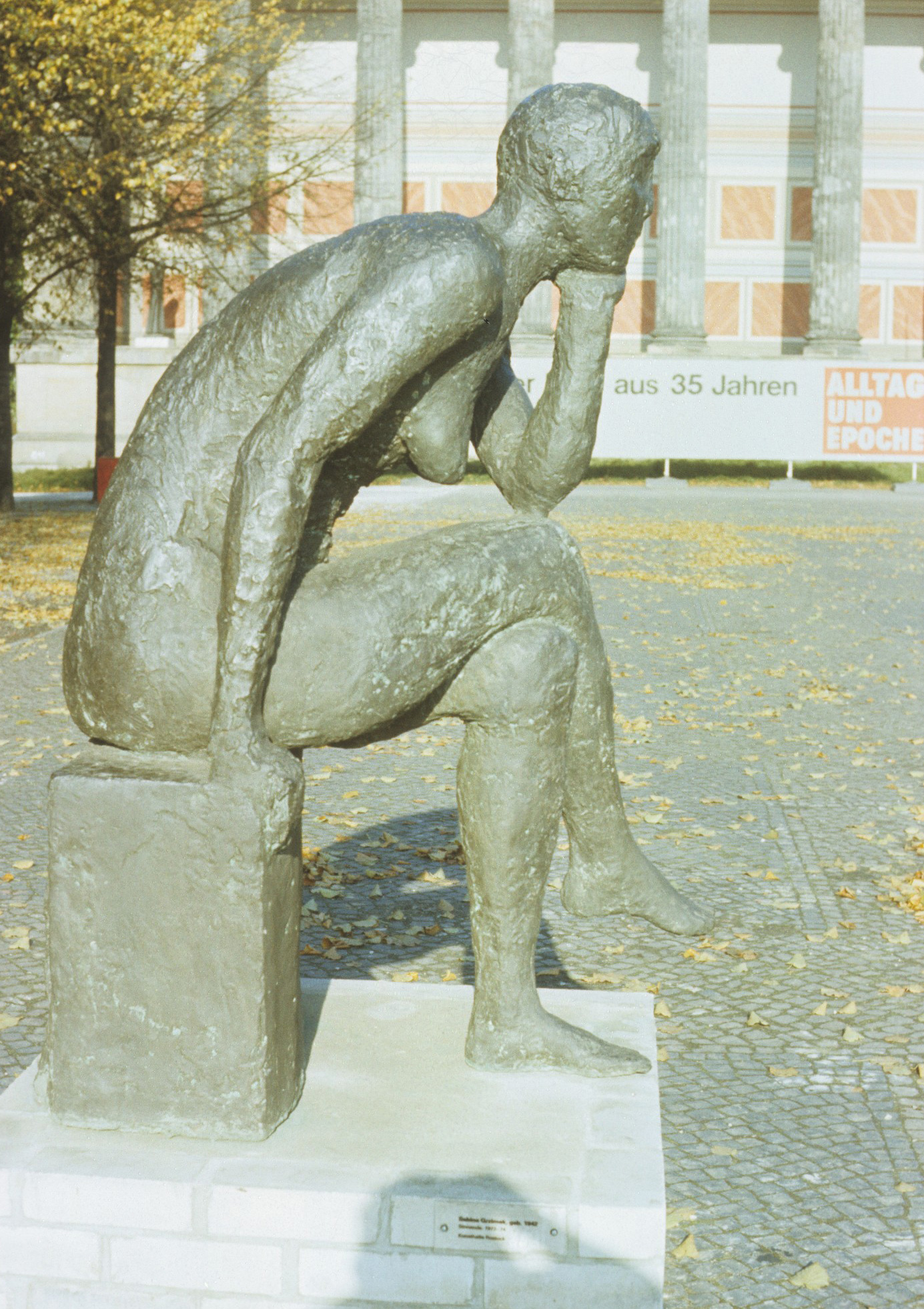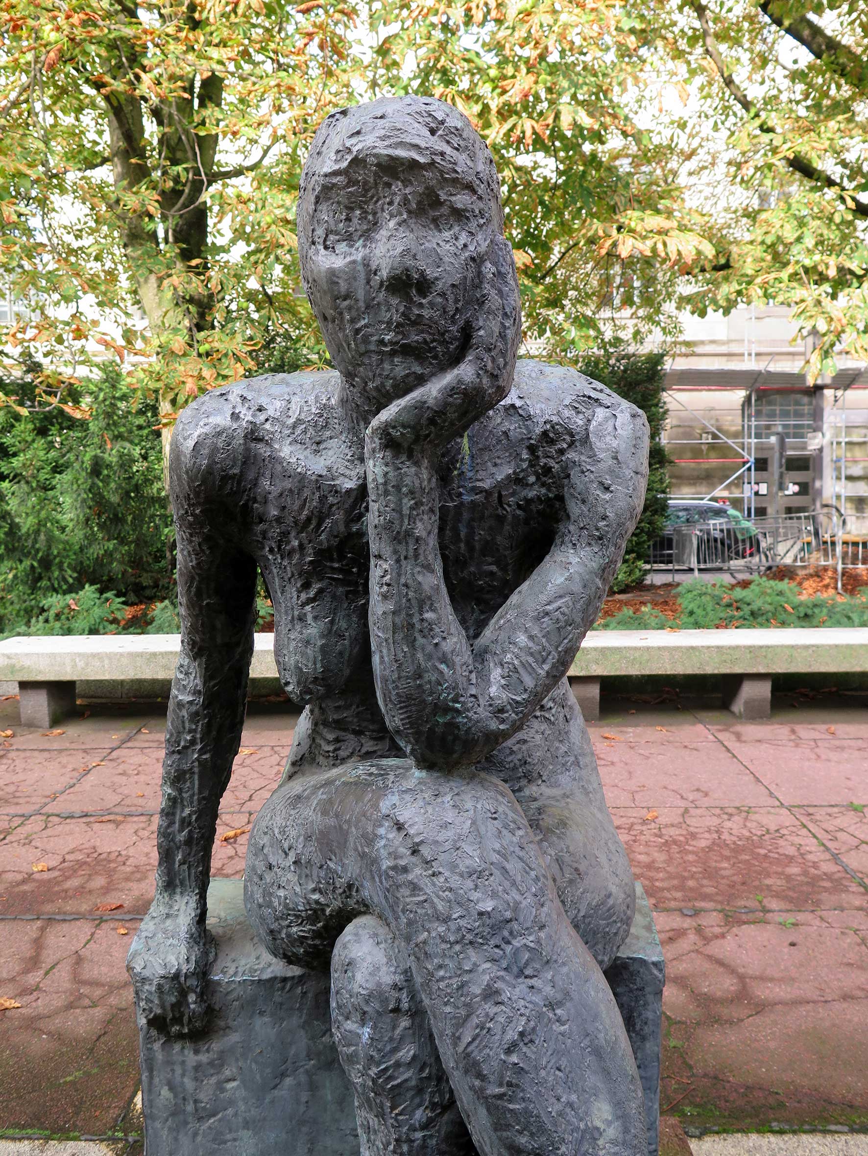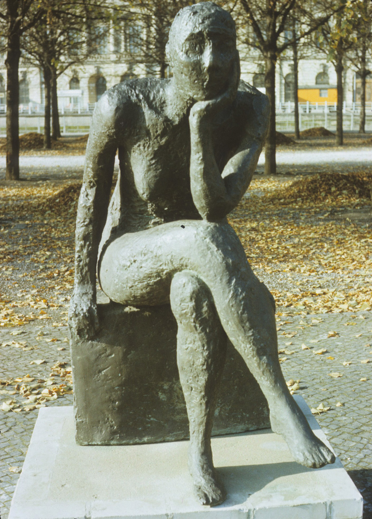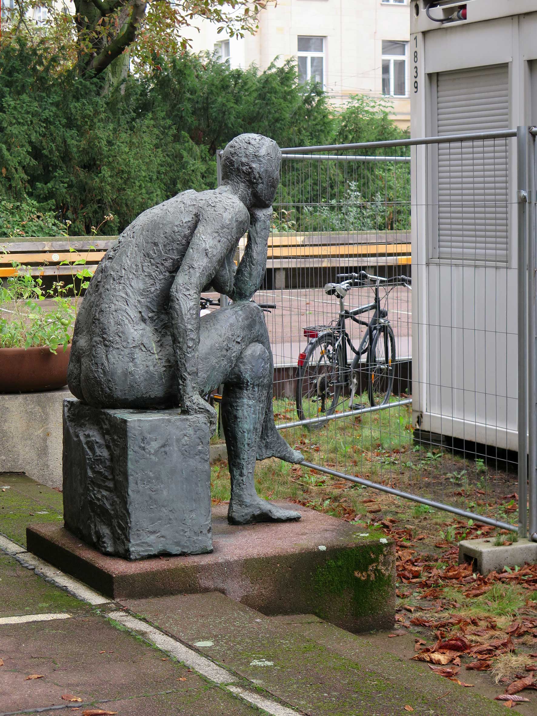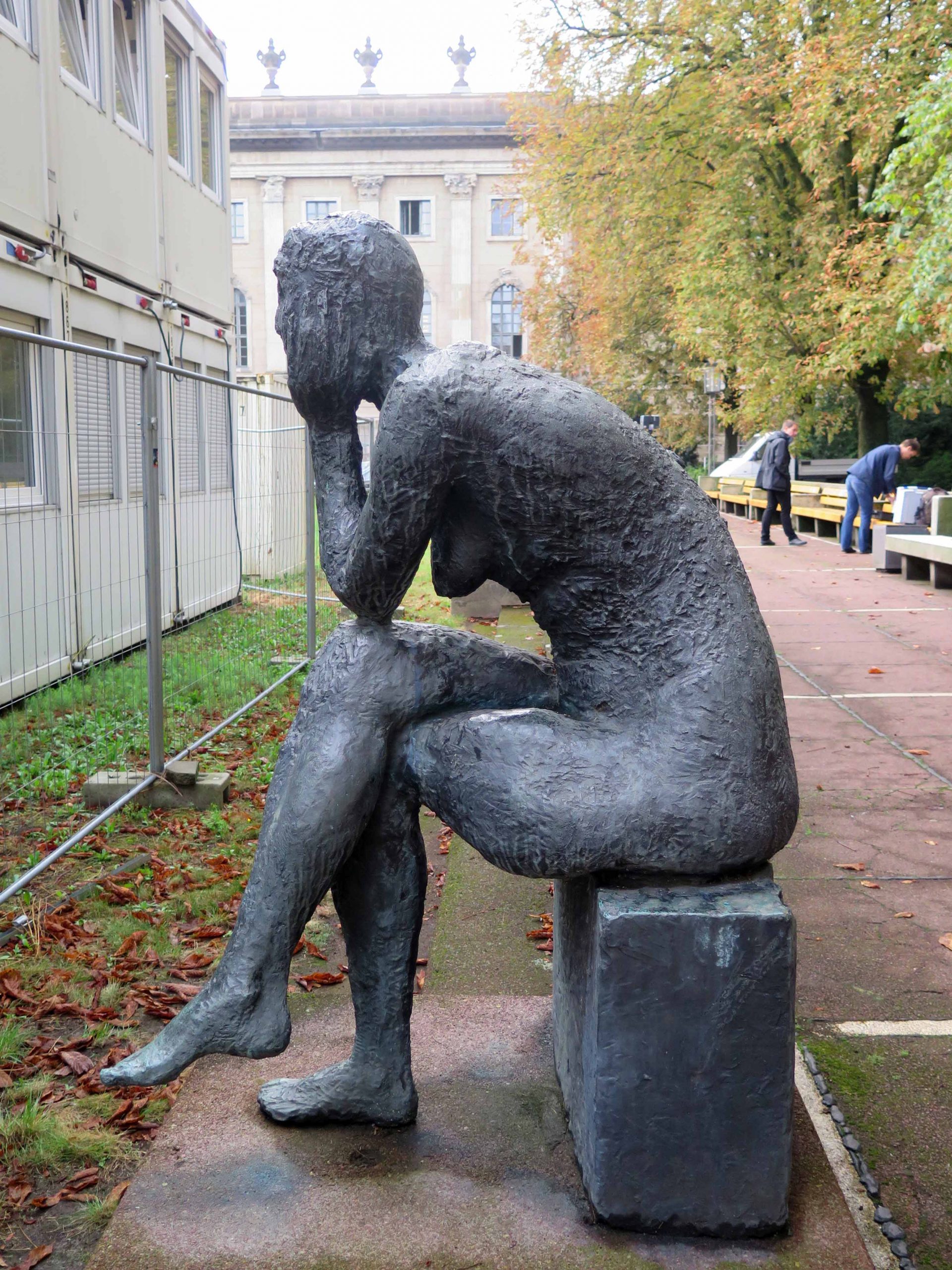 Die Sinnende der Berliner Bildhauerin Sabina Grzimek war eine der ersten größeren Arbeiten der damals gerade 30-jährigen Bildhauerin. Grzimek war 1971 vom Demokratischen Frauenbund Deutschlands (DFD) mit der Schaffung der Plastik beauftragt worden (Archiv der ADK, AdK-O MS 121). Zunächst sollte die 1972 – 1974 geschaffene Sinnende in der Nähe einer Kaufhalle aufgestellt werden, diese Idee wurde jedoch rasch wieder verworfen (Pölkow, Hans: Poesie und stille Empfindsamkeit. Die Berliner Bildhauerin Sabine Grzimek, in: Neue Zeit, 32. Jg., 04.09.1976, S. 10). Christa Reuschel beschreibt die Idee der Künstlerin folgendermaßen: „S. Grzimek ließ sich bei ihrer großen Bronze „Sinnende“ von Walter von der Vogelweides bekanntem Gedicht „Ich sass uff einem Steine … “ anregen und schuf eine Skulptur voller Innerlichkeit, Harmonie und Schönheit.“ Eine Ausführung in Bronze wurde erstmals 1975 in der Ausstellung „ Plastik und Blumen“ im Treptower Park unter der Bezeichnung „Sitzende“ gezeigt, im Herbst 1976 war sie in der Ausstellung „Plastik im Freien“ in Karl-Marx-Stadt zu sehen (Pölkow, Hans: Poesie und stille Empfindsamkeit. Die Berliner Bildhauerin Sabine Grzimek, in: Neue Zeit, 32. Jg., 04.09.1976, S. 10). 1977 war die Sinnende in der Berliner Bezirkskunstausstellung, 1978 nochmals in der Ausstellung „Plastik und Blumen“ im Treptower Park und 1984 in der Berliner Ausstellung "Alltag und Epoche" ausgestellt. Sabina Grzimek schenkte einen (vermutlich den ersten) Abguss 1975 der Humboldt-Universität. Dieser fand zunächst Aufstellung in der Storkower Straße 211-225 in Lichtenberg, im Innenhof des Studentenheims Ferdinand Thomas der Humboldt-Universität. Da diese Gebäude seit Mitte der 1990er Jahre nicht mehr der Universität gehörten, erfolgte 1995 eine Umsetzung in den Gartenhof des Hauptgebäudes der Humboldt-Universität Unter den Linden / Dorotheenstraße (Kunst für die Mensa Süd der Humboldt-Universität zu Berlin. Nichtoffener Kunstwettbewerb. Wettbewerbsdokumentation Teil 1, Auslobung, Berlin 2013, S. 34f.). 977 wurde ein Abguss von der Stadt Karl-Marx-Stadt erworben (seit 1990 wieder in Chemnitz zurück benannt). Er stand zunächst im Rahmen der Ausstellung „Plastik im Freien“ im Stadthallenpark, seit 1980 vor dem Eingang des Chemnitzer Schauspielhauses. Ein dritter Abguss der Sinnenden befindet sich im Schwanenteichpark in Rostock (Nicola Vösgen).