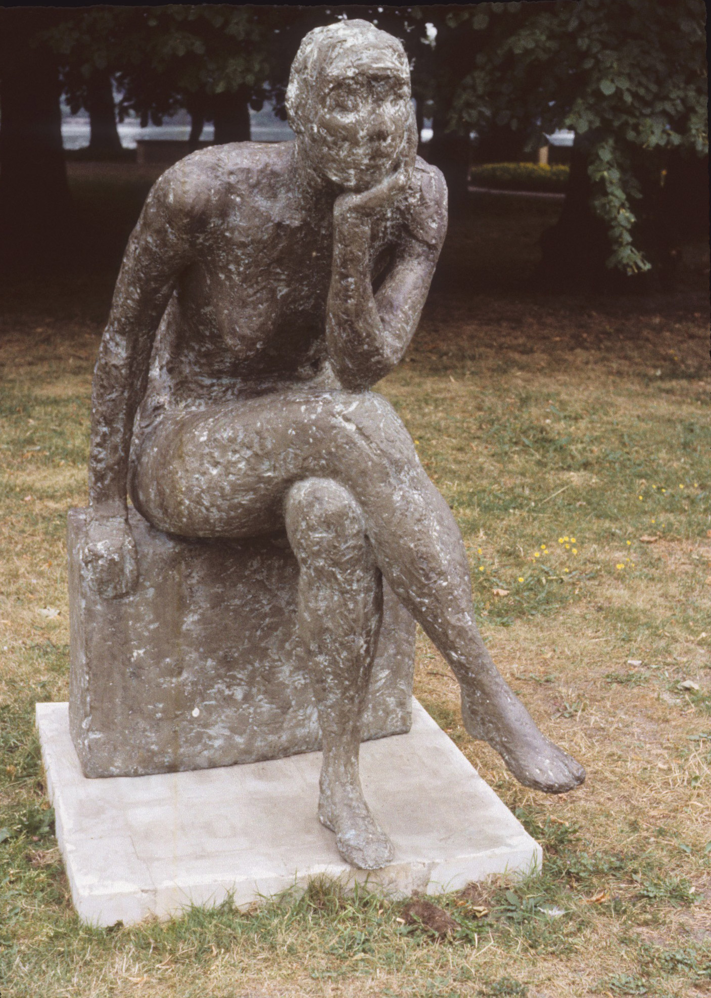 Sehr abstrahiert formulierte Darstellung einer auf einem rechteckigen Kubus sitzenden unbekleideten Frau, deren Oberkörper spannungsvoll nach vorne gebeugt ist. Das rechte Bein ist über den linken Oberschenkel geschlagen, mit der rechten Hand stützt sie sich auf der Sitzfläche ab. Der linke Arm ist auf das linke Knie gestützt, in der geöffneten Hand ruht der Kopf mit dem sinnend nach vorne gestreckten Gesicht.