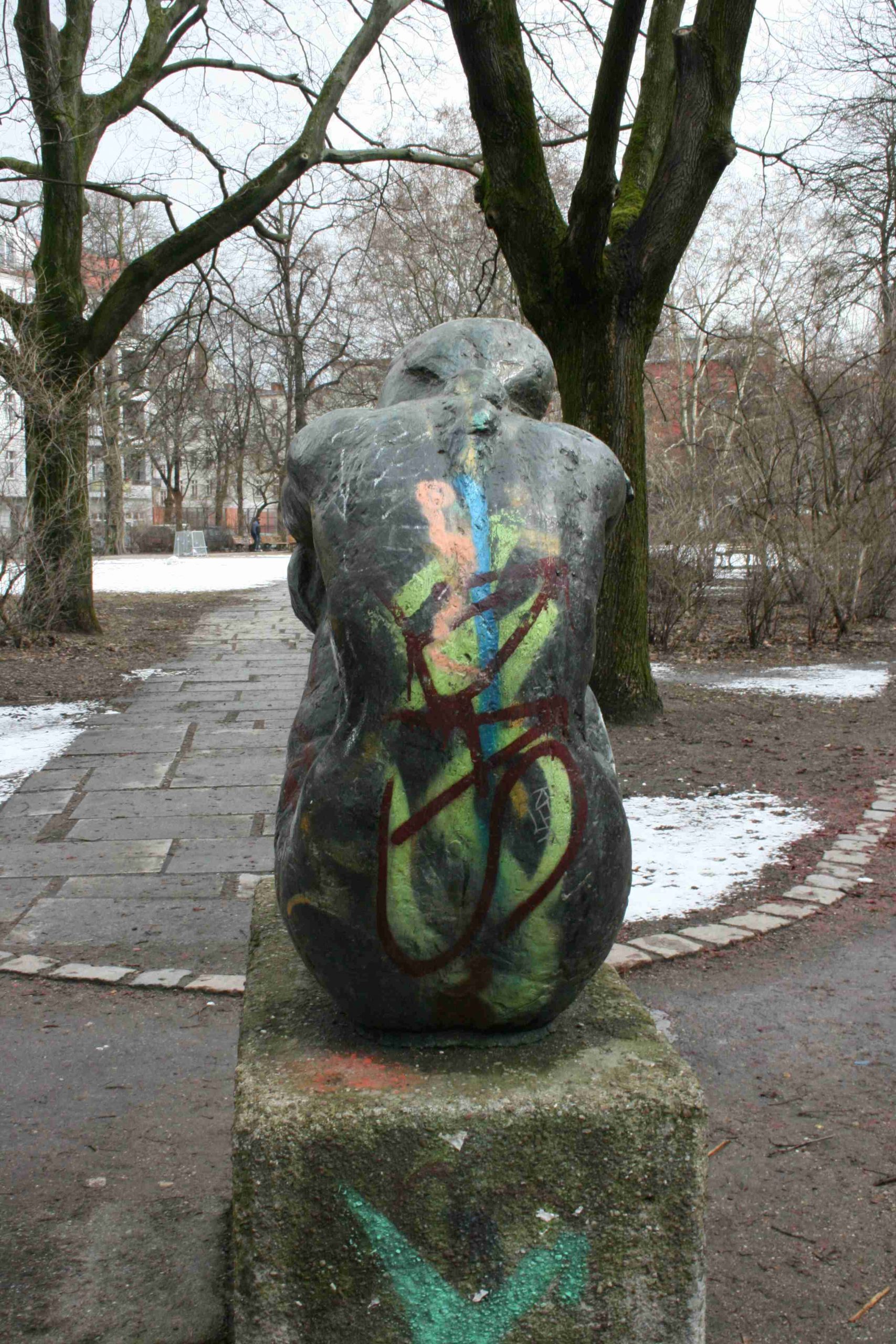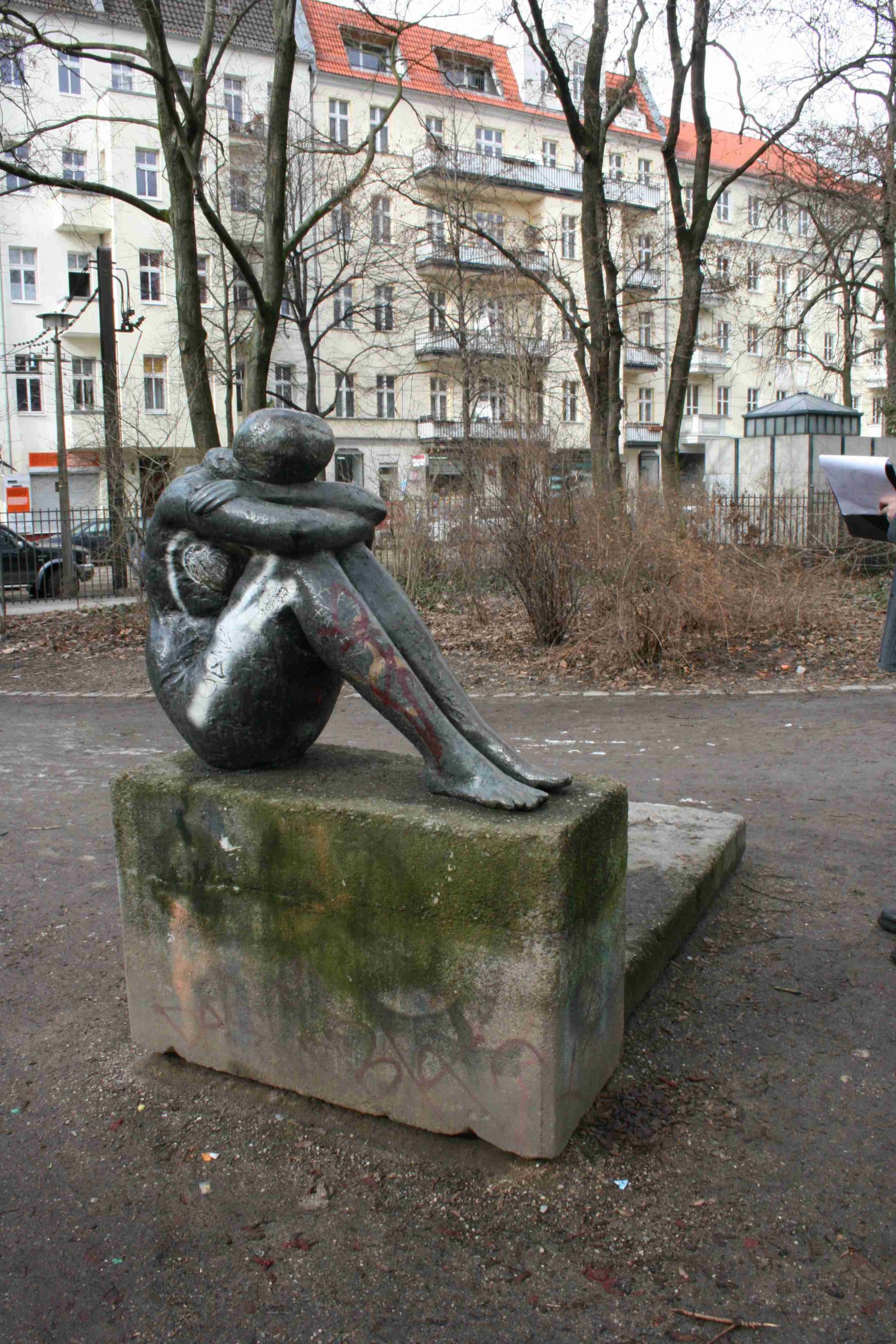 1975 zusammen mit dem Gitarrenspieler als Gruppe “Singebewegung“ aufgestellt. Die Plastik Gitarrenspieler wurde später – nach 1990 - entfernt und deponiert (Skulpturendepot des Grünflächenamtes im Volkspark Friedrichshain, Landsberger Allee 23). Im März 2024 wurden beide Plastiken nach einer Reinigung wieder gemeinsam am Traveplatz aufgestellt (Susanne Kähler, Rieke Fender).