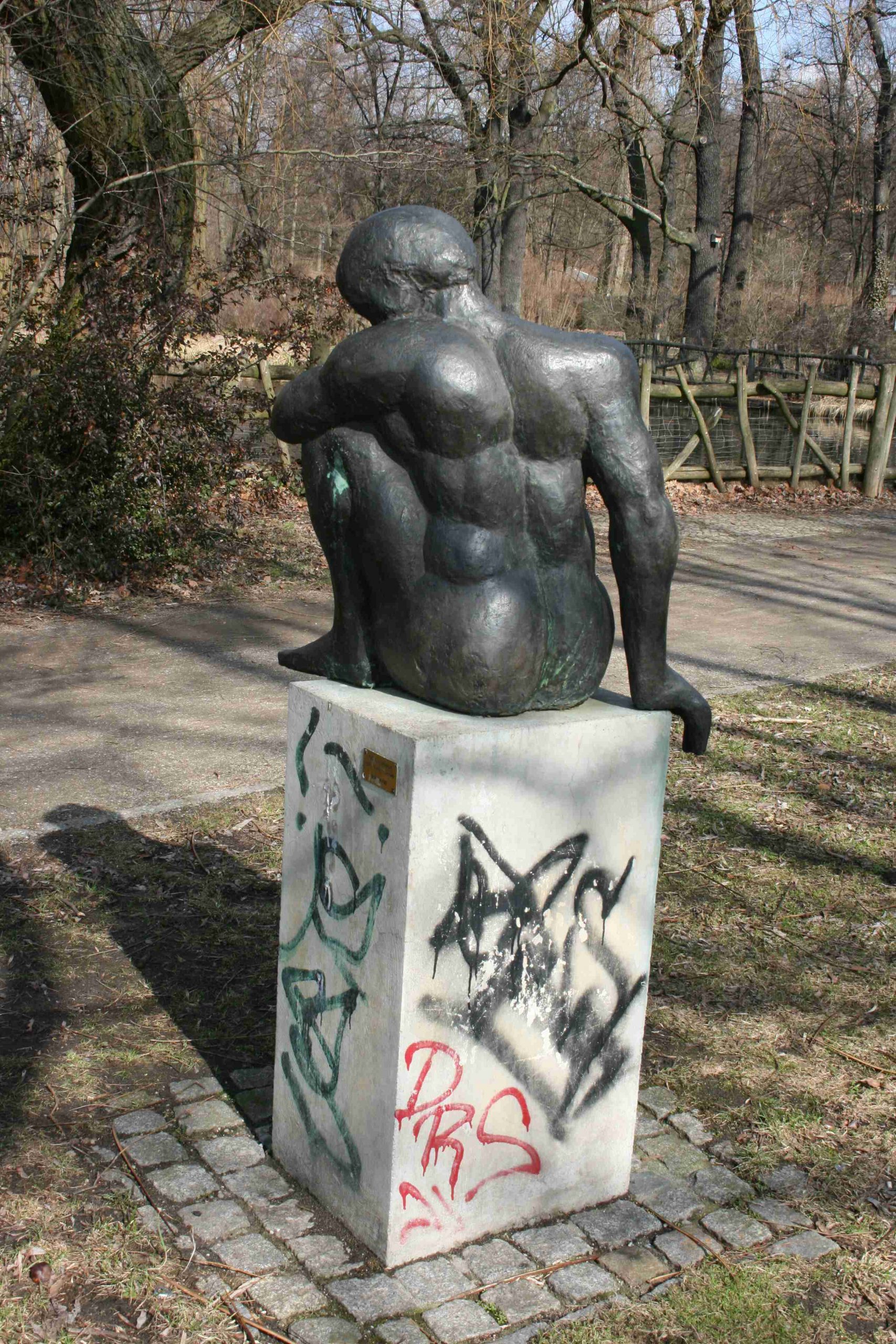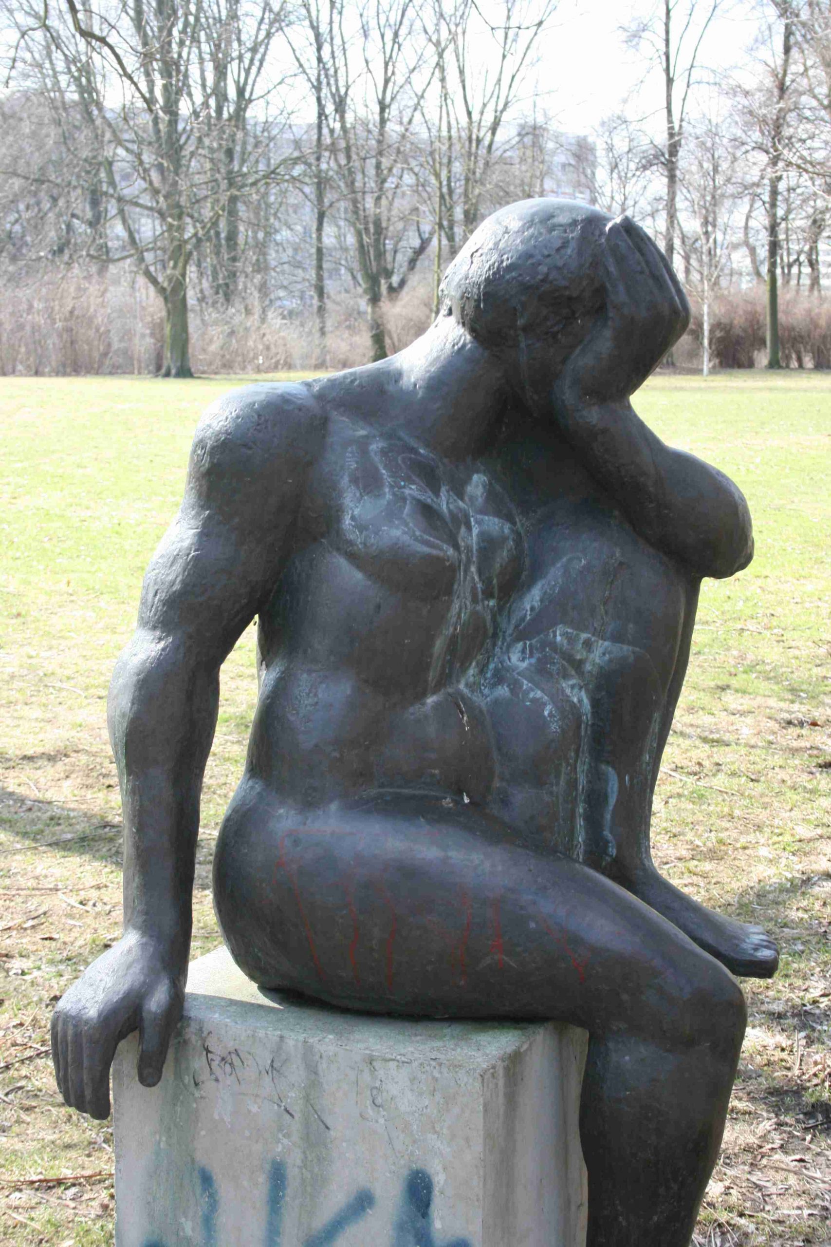 Auf einem rechteckigen Botonsockel wurde die etwa lebensgroße dunkelgrünlich patinierte Figur, ein sitzender weiblicher Akt, platziert. Das rechte Bein hängt herab, das linke ist aufgestellt. Der linke Arm ist auf dem Knie des linken Beins aufgestützt, in die linke Hand der Kopf gelegt. Die rechte Hand stützt sich hinten auf dem Sockel ab. Während die Haltung der Figur sehr realistisch wiedergegeben wurde, sind die einzelnen Körperformen abstrahiert wiedergegeben. Dadurch, dass die Figur ihr Gesicht in die Handfläche gelegt hat, entsteht der Ausdruck von Niedergeschlagenheit und Verzweiflung (Susanne Kähler).