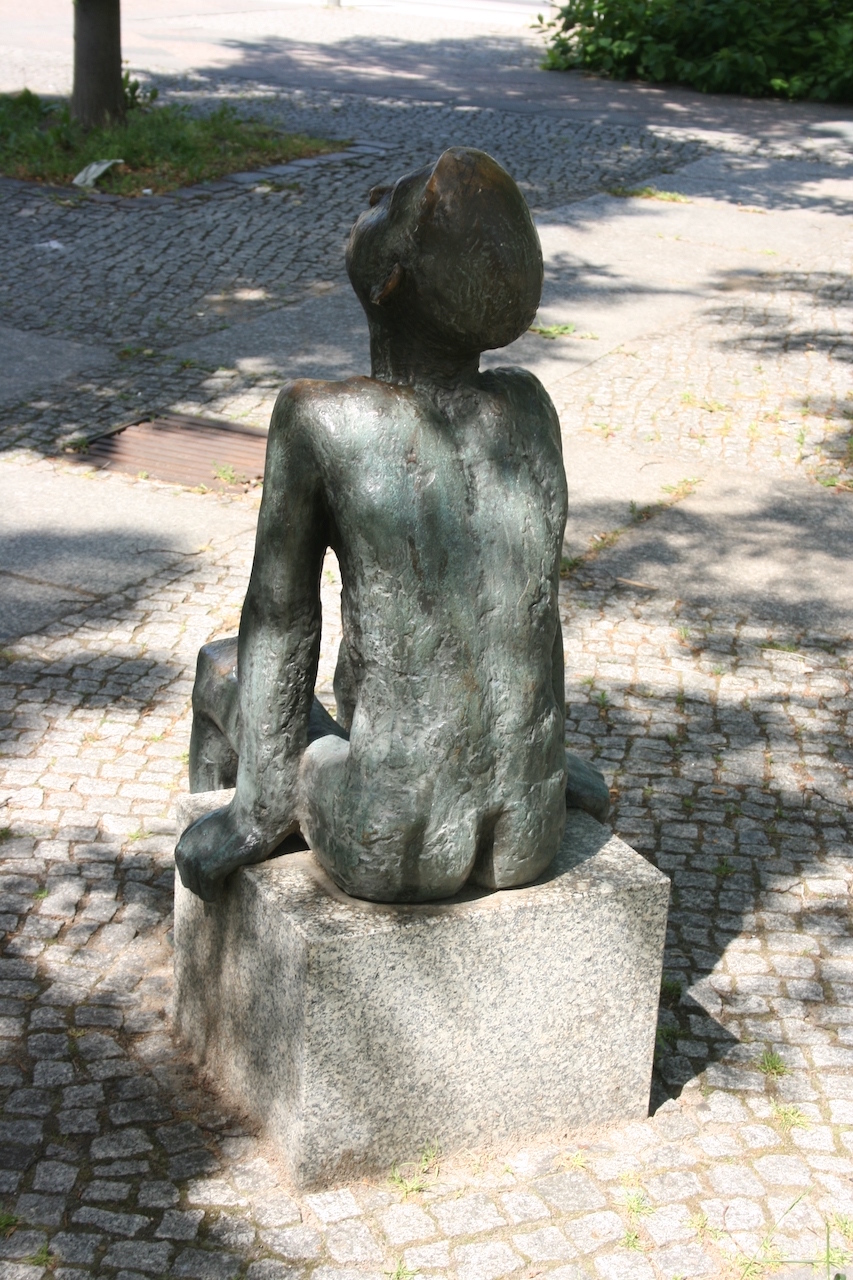 Innerhalb einer kleinen Platzanlage sind in kreisförmiger Anordnung Granitbänke aus grauem Material aufgestellt. In diesen Ring eingebunden ist ein würfelförmiger Granitblock, auf dem ein nackter Knabe sitzt. Er hat die Füße vor sich gerade angeordnet aufgestellt und stützt sich mit beiden Händen an der Sitzfläche ab. Den fein durchgearbeiteten Kopf hat er in den Nacken gelegt und das Gesicht dem Himmel zugewendet (Susanne Kähler, Jörg Kuhn).