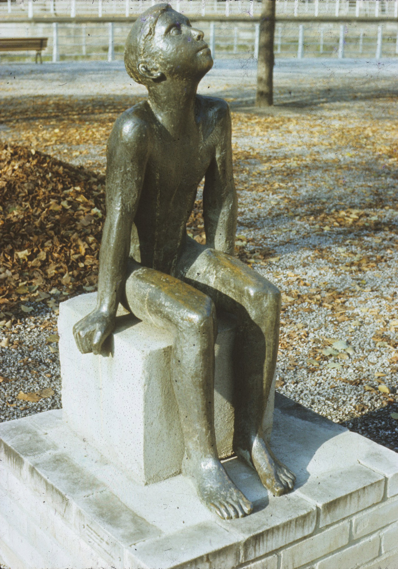 Innerhalb einer kleinen Platzanlage sind in kreisförmiger Anordnung Granitbänke aus grauem Material aufgestellt. In diesen Ring eingebunden ist ein würfelförmiger Granitblock, auf dem ein nackter Knabe sitzt. Er hat die Füße vor sich gerade angeordnet aufgestellt und stützt sich mit beiden Händen an der Sitzfläche ab. Den fein durchgearbeiteten Kopf hat er in den Nacken gelegt und das Gesicht dem Himmel zugewendet (Susanne Kähler, Jörg Kuhn).