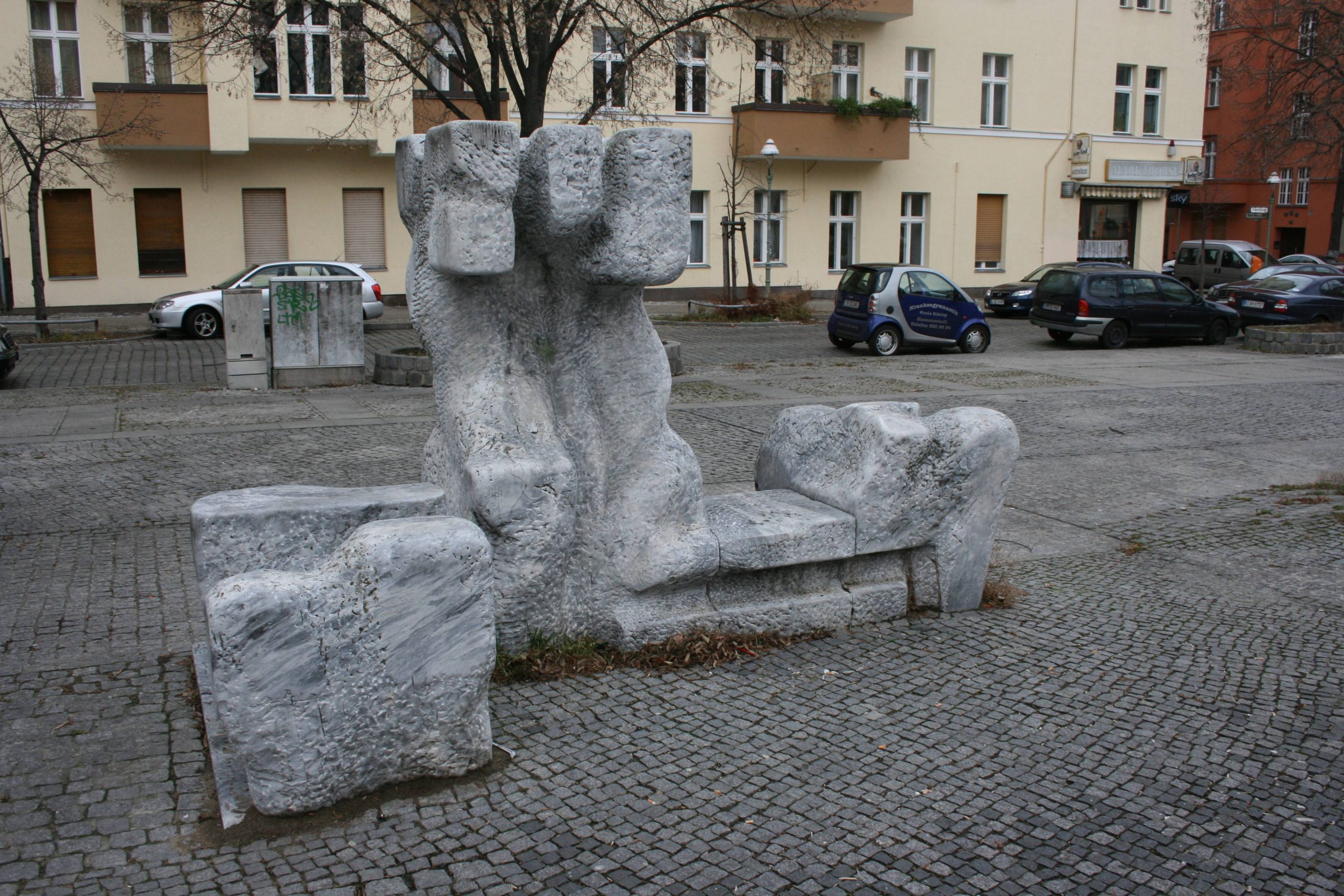 gehört zum Bildhauersymposium Kranoldplatz 1983-1986; Skulpturenensemble Brunnenlandschaft aus Bardiglio-Marmor
