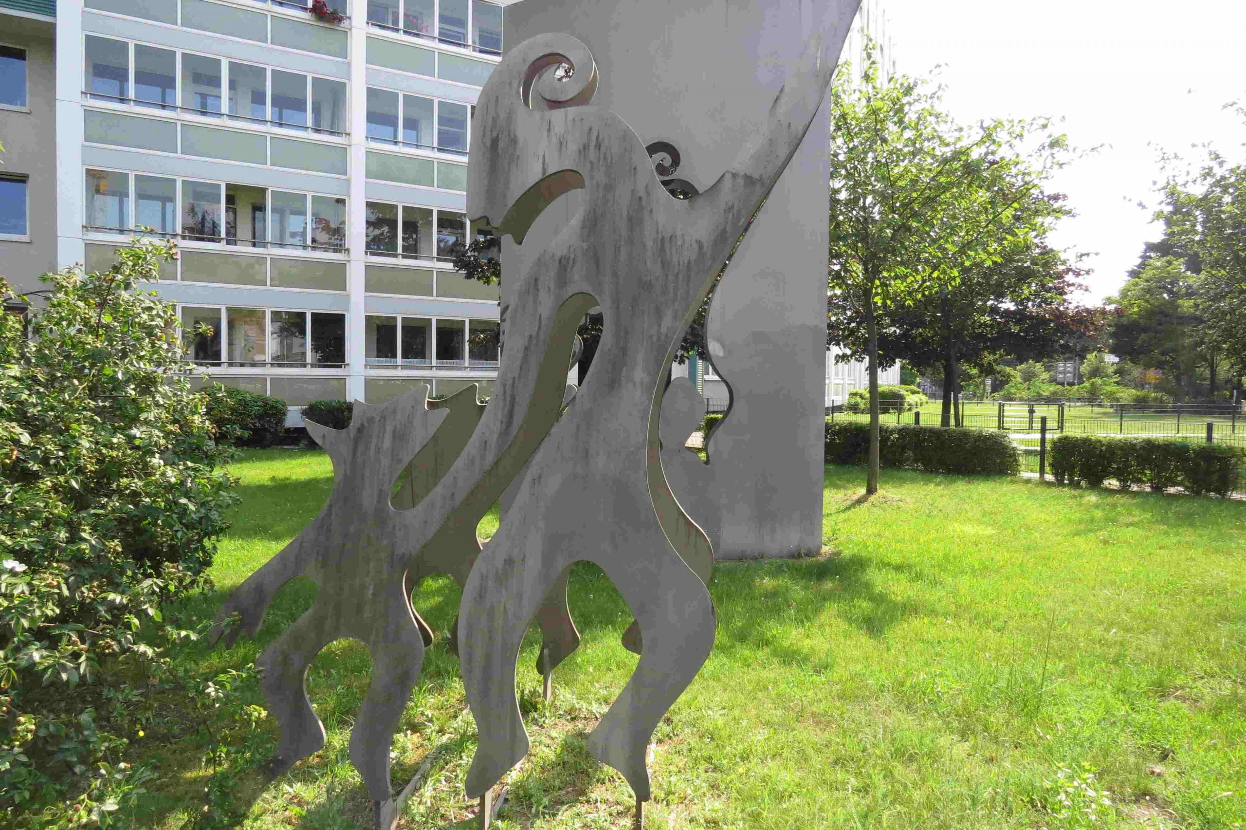 Das Objekt steht auf einer Grünflache vor einem Wohnkomplex, welches an der Frankfurter Allee, Ecke Möllendorffstraße nahe bei einem Einkaufszentrum liegt. Ähnliche Arbeiten mit dem gleichen Material und ähnlicher Verarbeitung, werden vom Künstler als „Skulptur“ benannt und haben keinen weiteren Titel. Bei diesem Objekt handelt es sich um eine dekorative Plastik weitgehend aus Stahl. Das Objekt ist zweiteilig, wobei jedes Teil ein mehr oder weniger parallel geführtes Pendant hat. Beide Teile der Plastik gehören ganz offensichtlich zusammen, denn die im Vordergrund liegende Figur, ist ein Ausschnitt der Hauptfigur. Die kleinere Plastik im Vordergrund wird durch in den Boden eingelassene Eisenstäbe gehalten. Als Fundament der großen Plastik wurde eine einfache Steinplatte verwendet. Zur zusätzlichen Befestigung und Stabilität des Objektes wurden an jeder Seite Stabilisierungen aus Stahl angeschweißt. Die größere der beiden Plastik besteht aus zwei gegenüberliegenden Eisenplatten. Links in der oberen Ecke ist ein runter Kreis ausgeschnitten. Die herausgeschnittene Figur im Vordergrund besteht ebenfalls aus zwei Eisenplatten. Dargestellt sind Wesen, die aus Mensch und Widder gebildet werden, zusammengestellt als Mutter/Vater und Kind/Jungtier. Sie halten sich an den „Händen“. Die grössere Figur von beiden streckt den linken Arm nach oben und die kleine Figur, hat den Blick nach oben zum Elternteil gerichtet (Jasmin Cevic).