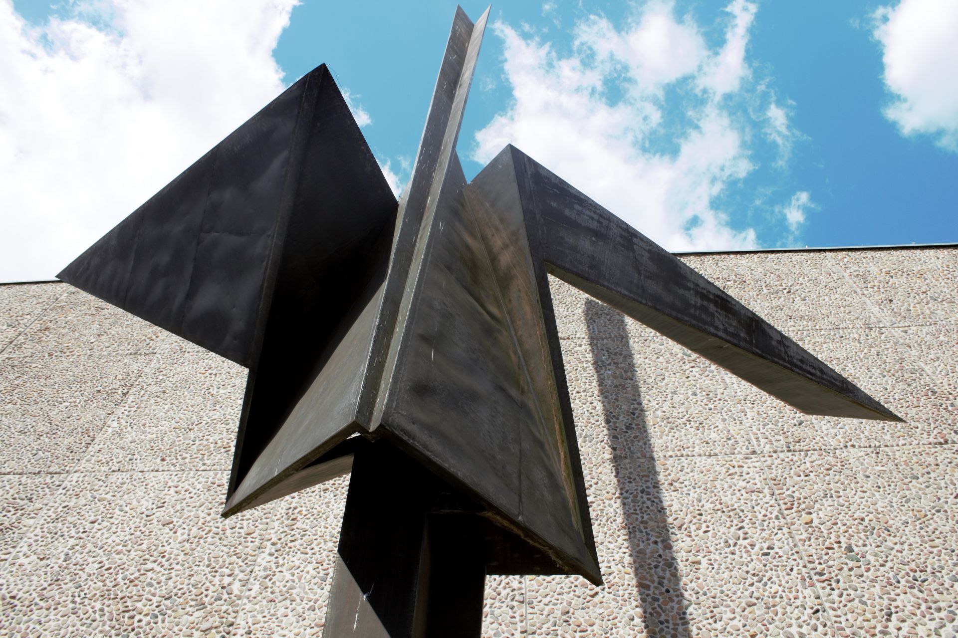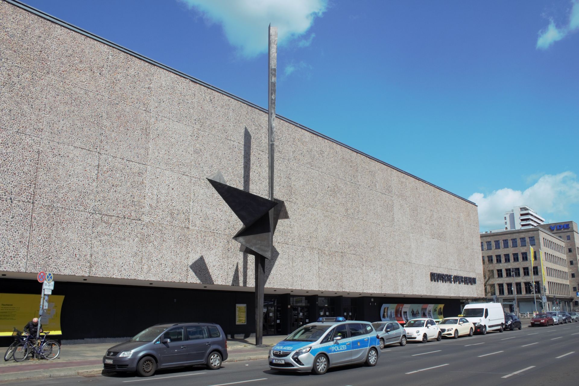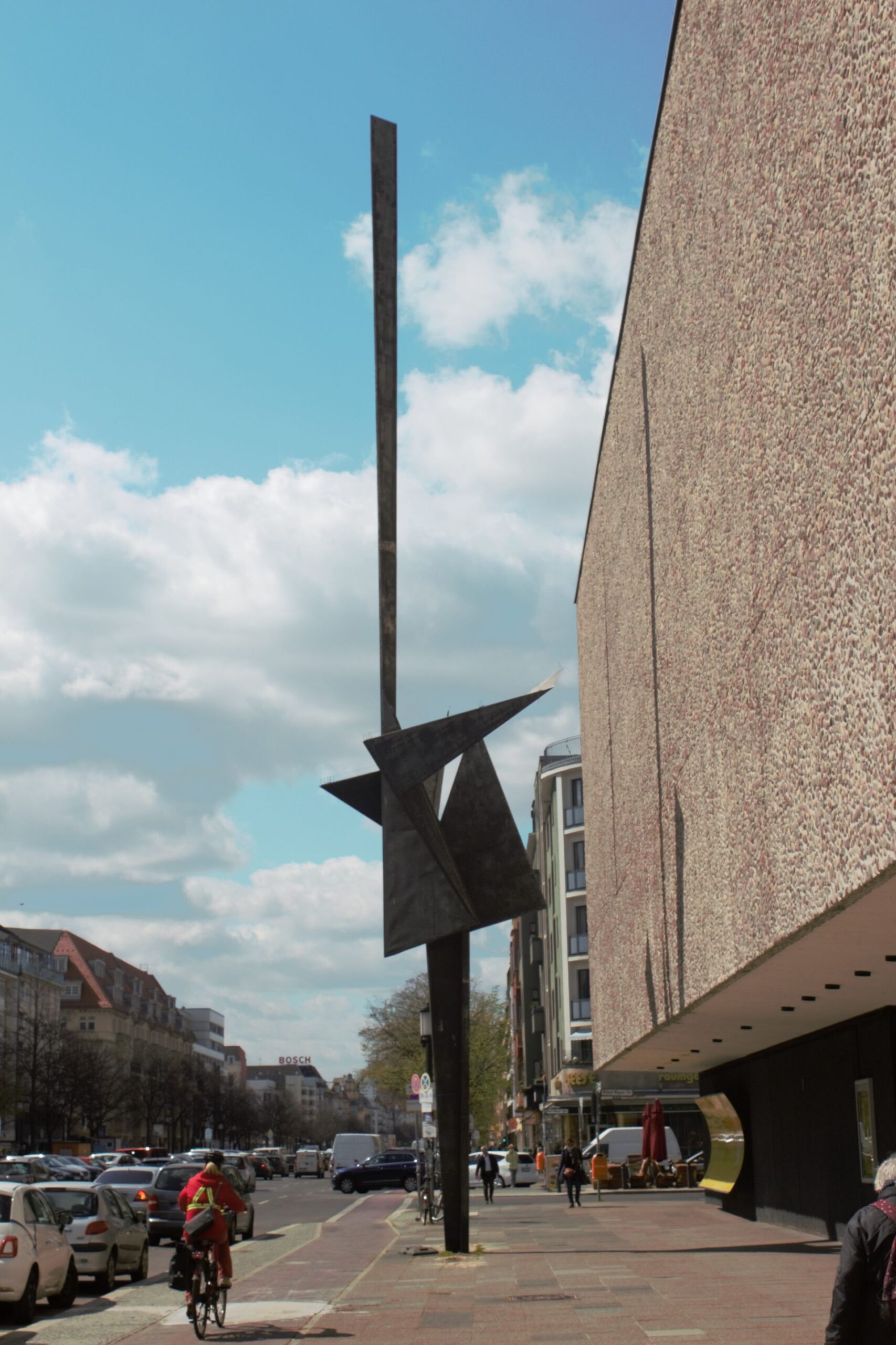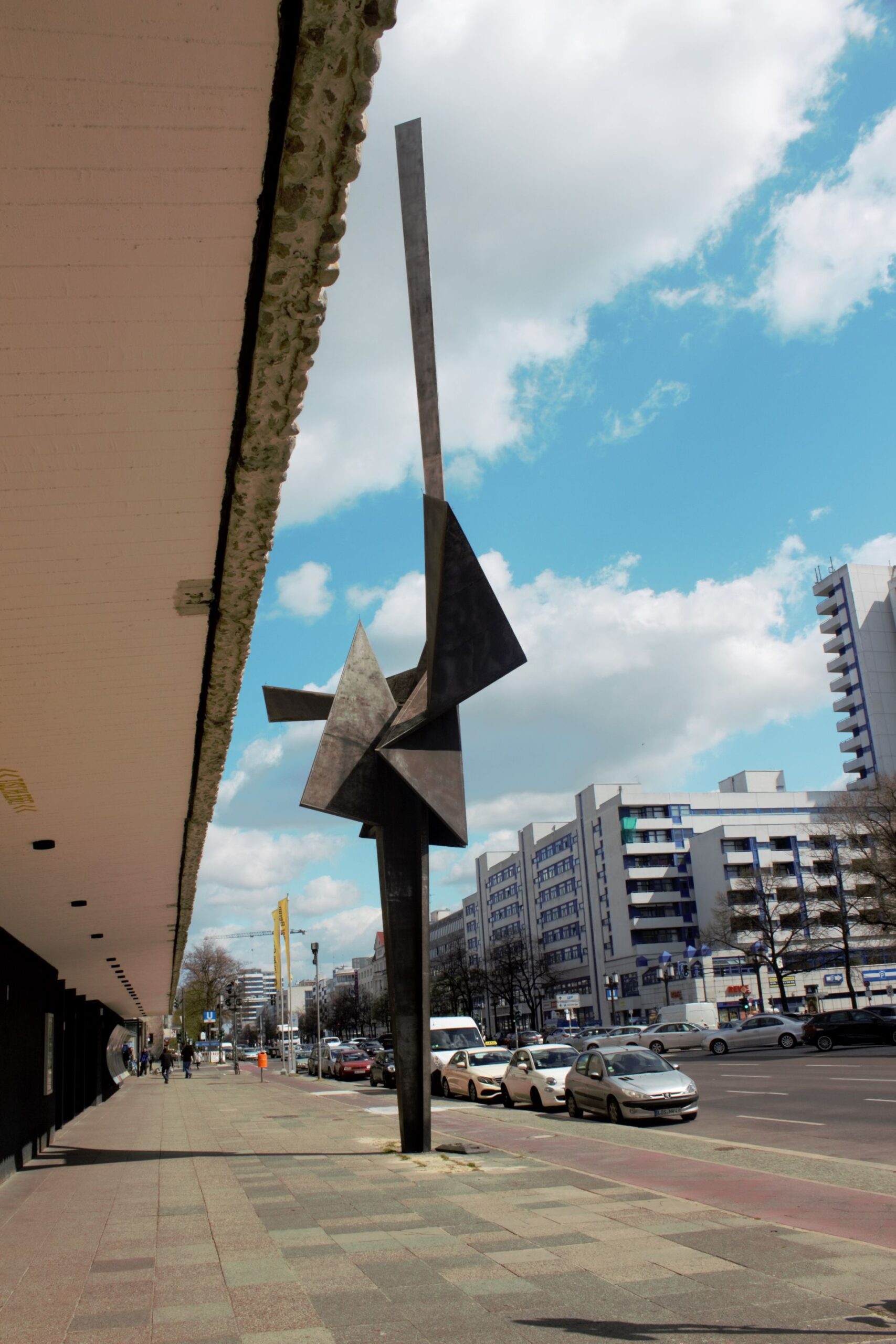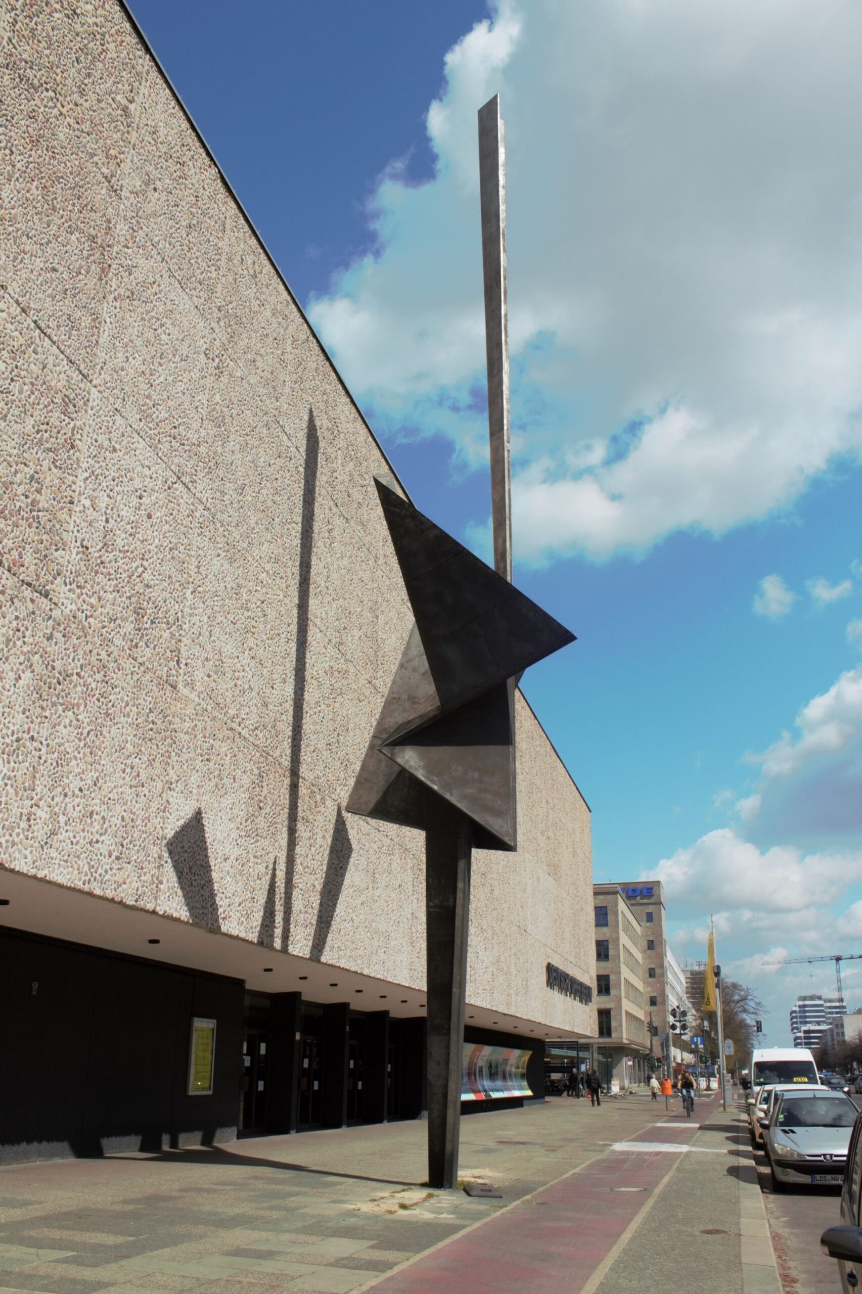 Vom Volksmund auch als "Schaschlikspieß" verballhornt. Herstellung in einem Berliner Industrie-Werk auf der Basis eines zwei Meter hohen Modells nach aerodynamischer und statischer Prüfung (Marc Wellmann). Das Kunstwerk sollte, so der Architekt Fritz Bornemann, der massiven Fassade der Deutschen Oper ein „plastisch architektonisches Gegengewicht“ zur Seite zu stellen. Er beabsichtigte die 64 x 16 Meter große Fassade mit einem Kunstwerk zu beleben. Im Jahr 1955 erfolgte die Ausschreibung hierfür als der erste große Wettbewerb der Westberliner Kunst am Bau. Es nahmen die vier Berliner Bildhauer Karl Hartung, Bernhard Heiliger, Erich Reuter und Hans Uhlmann teil. Obwohl zunächst ein Wandschmuck vorgesehen war, entschied man sich für den Beitrag Uhlmanns, der als einziger eine freistehende Plastik in Form einer Stele vorschlug und damit den Wettbewerb gewann. „Das weithin sichtbare, informelle Kunstwerk aus schwarz getöntem Chromnickelstahl mit blank geschliffenen Kanten rhythmisiert die gleichförmige Fläche und akzentuiert das eher zurückhaltende Bauwerk. Mit ihrer aufstrebenden Form erzeugt die Plastik einen dynamischen Kontrast zur Statik der Fassade und behauptet ihre Wirkung auch nachts, wenn die Lichtstrahler unterschiedliche Schattenwürfe erzeugen.“ (BBSR Online Publikation Nr. 02/201) Der Berliner Bildhauer Hans Uhlmann schuf das Werk in der zweiten Hälfte des 20 Jahrhunderts. In diesem Zeitraum setzte sich der Künstler mit den Motiven Faltung, Entfaltung, Säulen und Turme beschäftigt. Uhlmann gilt als einer der Begründer der Metallplastik in Deutschland. Sein Werk umfasst ca. 250 Skulpturen und mehr als tausend Zeichnungen. Er erhielt zahlreiche Aufträge für Skulpturen im öffentlichen Raum und nahm an internationalen Ausstellungen teil (Rula Badran).