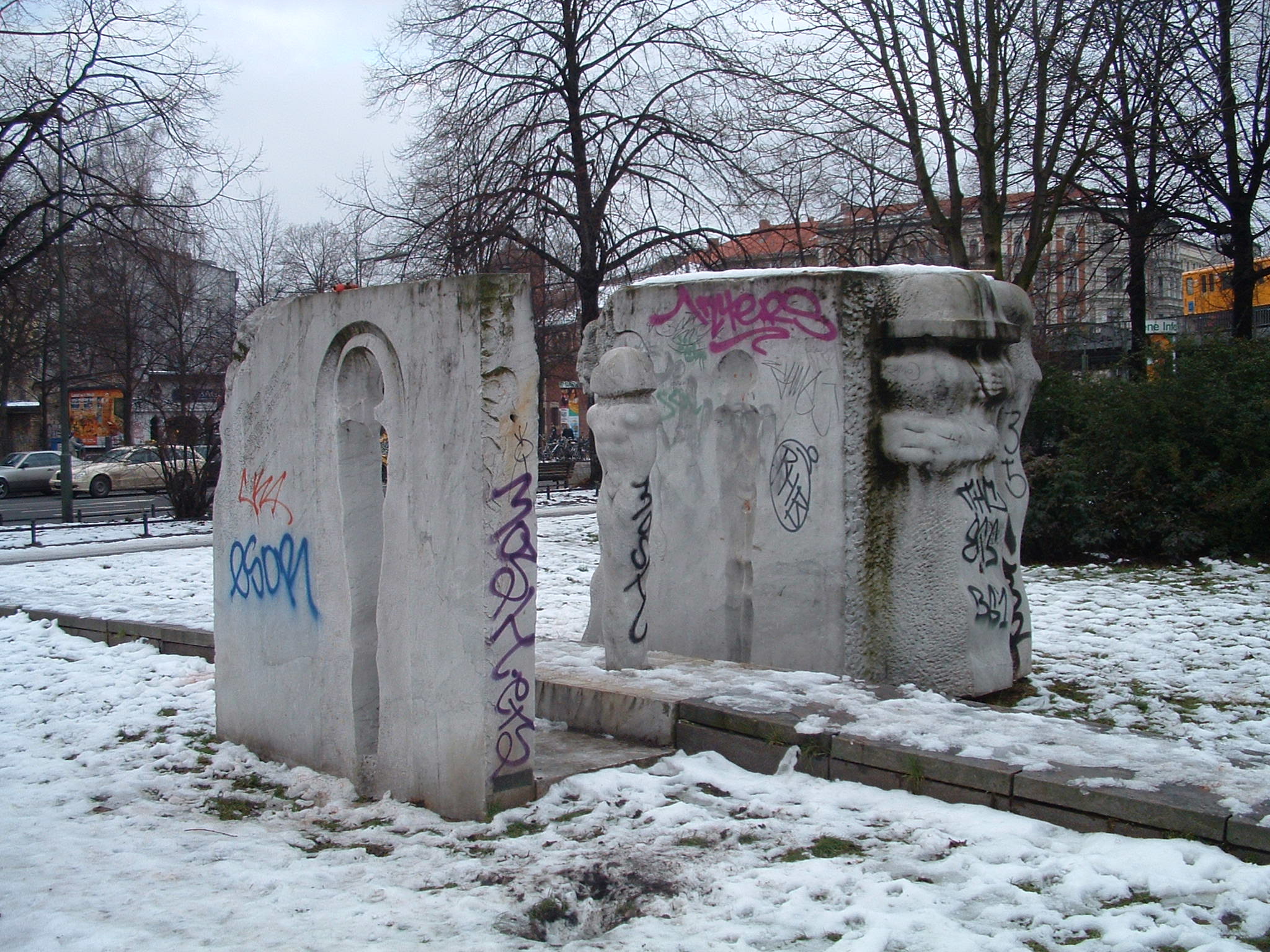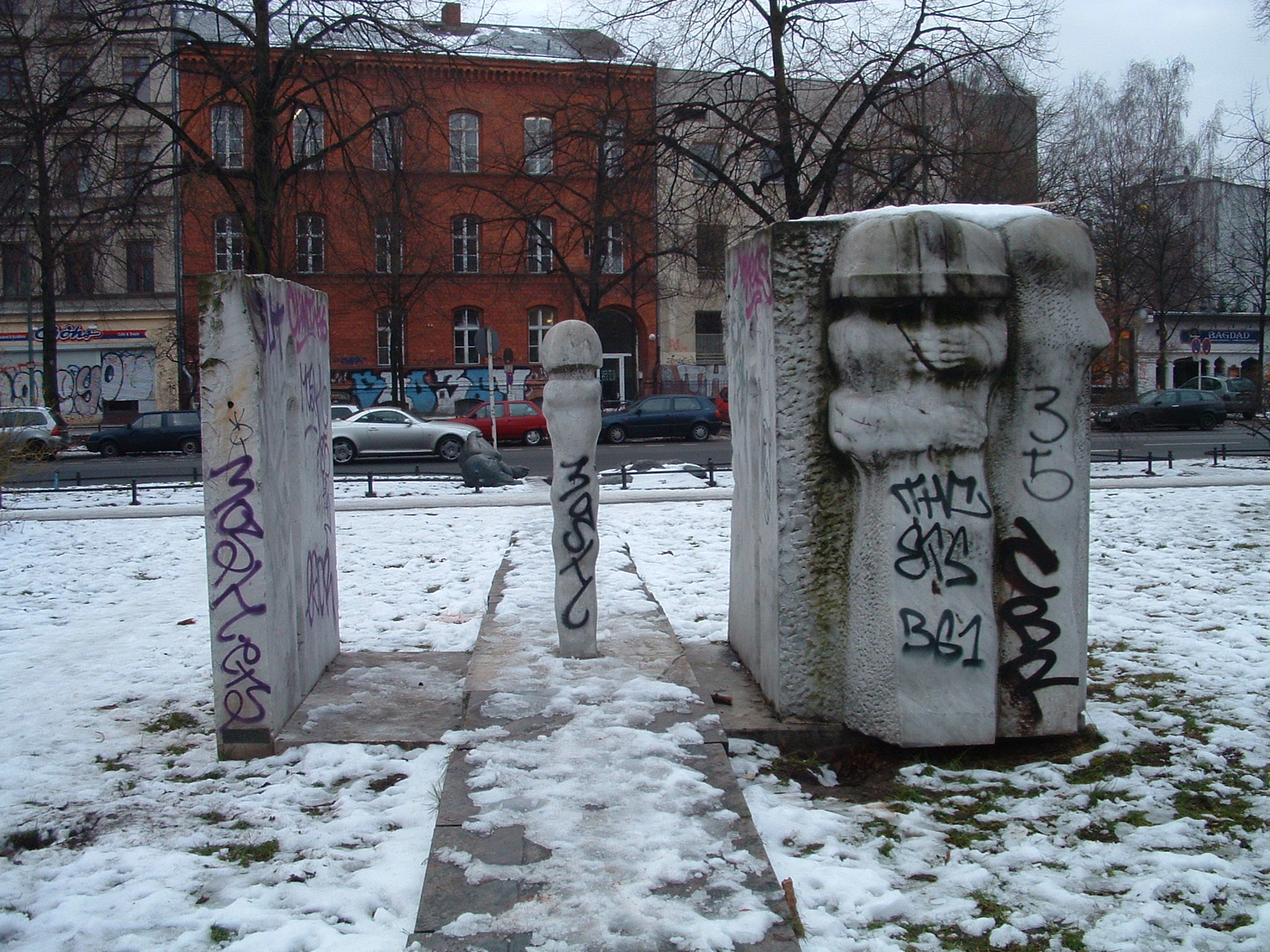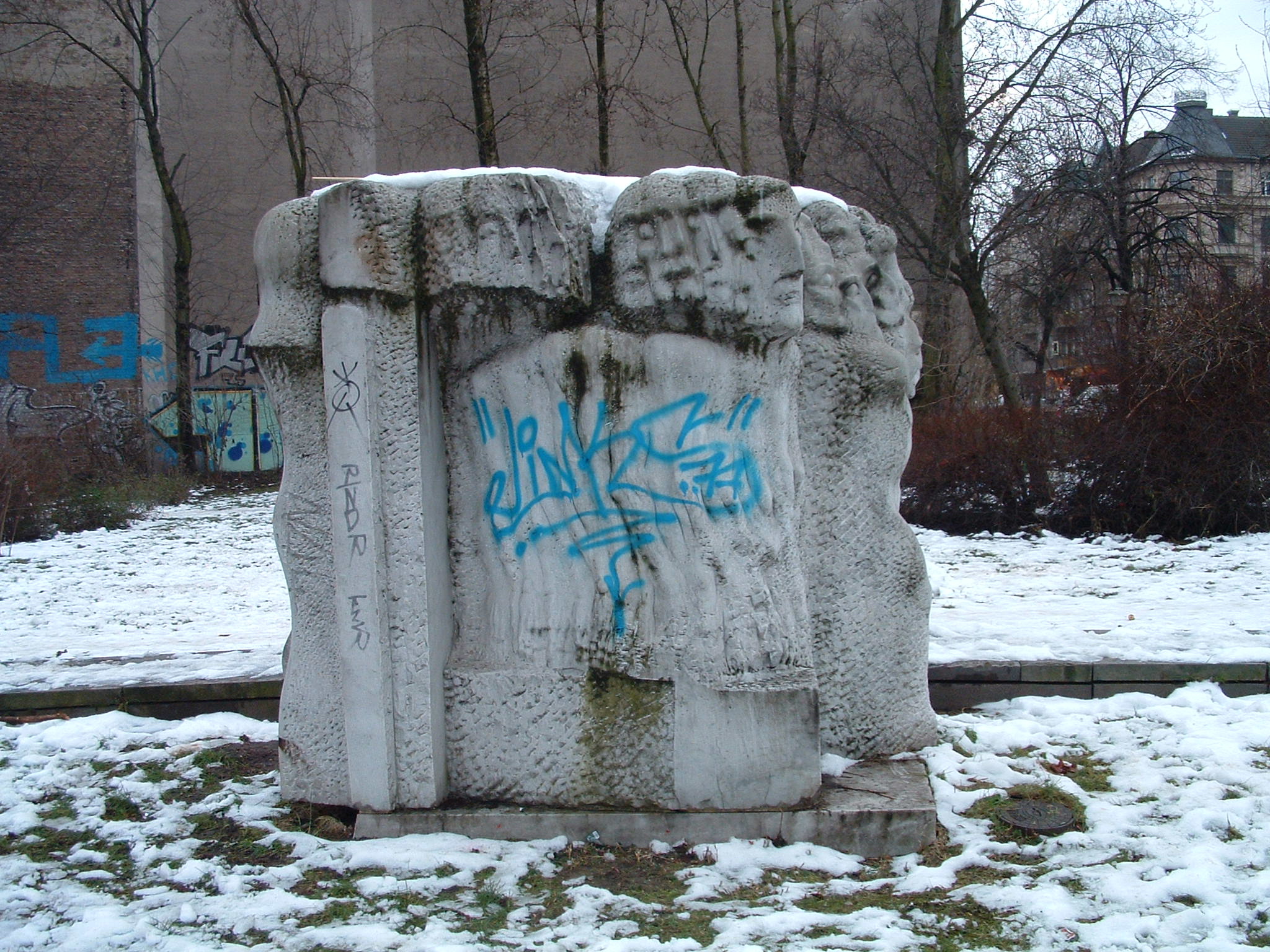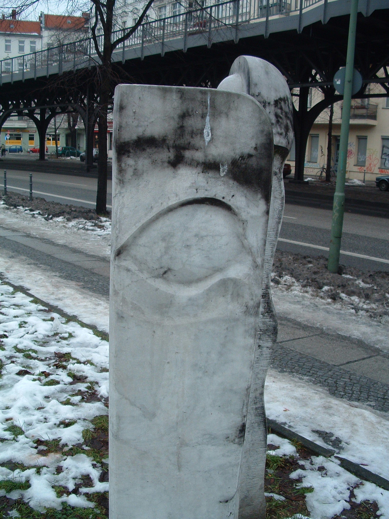 Achtteiliges Ensemble aus Figuren und einem geteilten Steinblock, bestehend aus: Fünf Marmorstelen, Teile und Sinnesorgane des menschlichen Körpers darstellend, stehen in der Nähe der Oberbaumstraße, die Oberflächen sind glatt, bzw. teilweise punktiert: 1. Direkt an der Straße, etwas abseits der Gruppe auf dem Bürgersteig steht eine Stele in Form eines Phallus, an einer Seite profiliert (Form eines Keimes) 2. Auf der Rasenfläche: Stele in Form einer flachen Hand 3. Auf der Rasenfläche: Stele in Form eines Beines mit Fuß 4. Auf der Rasenfläche: Stele mit überdimensionalem Auge und Ohr 5. Auf der Rasenfläche: Kopf und Schultern