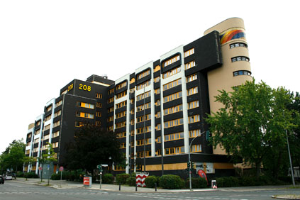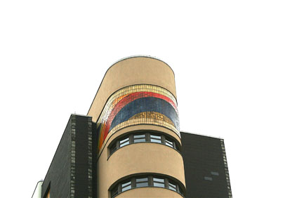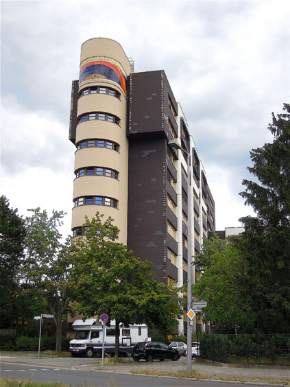 Die Turmspitze des zehngeschossigen Treppenhauses des Finanzamtes Reinickendorf markiert ein über fünf Meter breites farbiges Keramikrelief von Susanne Riée. Das abstrakte Farbbild schmückt den halbrunden Treppenturm, der am Giebel des schmalen langgestreckten Gebäudeflügels den Stadtraum am Eichborndamm dominiert. Das bandartige Relief besteht aus hochrechteckigen farbig glasierten Keramikplatten, die unterschiedlich breite Farbbögen abbilden. So entsteht das Bild eines großen in Spektralfarben aufgelösten Farbbogens, der vielfältige Assoziationen zulässt: eine auf- oder untergehende Son- ne, ein Regenbogen oder ein großes Auge. Den Farbbogen bestimmt ein breites blaues Band – die Lieblingsfarbe der Künstlerin – umgeben von roten, gelben und orangenen Farbstreifen. Jeweils zwei gelbe Plattenreihen fassen das Reliefbild oben und unten ein (Jürgen Tomisch, Barbara Anna Lutz).