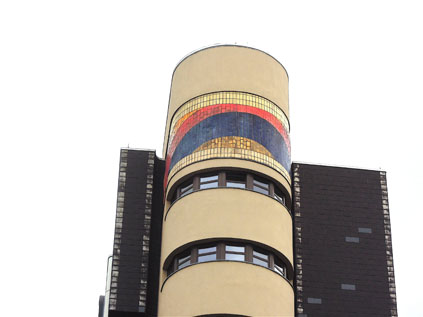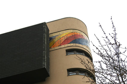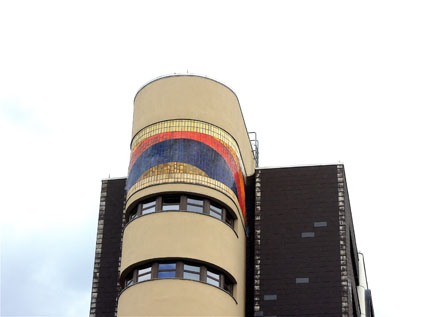 Das Keramikrelief entstand als Kunst-am-Bau-Beitrag für den Neubau des Finanzamtes Reinickendorf, der 1974 nach einem Entwurf des Baudirektors Rainer G. Rümmler fertiggestellt wurde. Die Auftragsarbeit ging an die Berliner Bildhauerin Susanne Riée. Sie ließ Brand und Glasur der farbigen Keramikplatten in den Niederlanden herstellen, in der Werkstatt struktuur 68 in Den Haag. Nach einem Werkverzeichnis soll 1978 noch ein weiteres „Rundes Relief am Turm“ von Susanne Riée angebracht worden sein. Das Finanzamt Reinickendorf besitzt mehrere Treppentürme. Im äußeren Bereich ist kein weiteres Relief auffindbar. Das Innere der Treppenanlagen konnte aufgrund der Corona- Einschränkungen nicht besichtigt werden (vgl. Ausstellungskatalog Susanne Riée Spurenlesen, 1997, S. 29). Die von Susanne Riée geschaffene Außenkeramik schmückt an einer das Stadtbild prägenden Stelle den großvolumigen Verwaltungsbau. Ein weithin sichtbares, heiteres, farbiges Leuchtzeichen am optisch frei stehenden, dekorativen Treppenturm. Im Zusammenspiel mit der spätmodernen Architektur des von Rainer G. Rümmler entworfenen Gebäudes harmonisiert Riées Keramikbeitrag stimmig. Baudirektor „Rümmler leitete von 1964-1994 die Entwurfsabteilung der Berliner Senatsbauverwaltung und entwarf in dieser Funktion u.a. über 50 U-Bahnhöfe, mehrere Feuerwachen, Polizeistationen und Verwaltungsgebäude, wobei er immer eine vom Zeitgeist durchdrungene, modische Architektur mit hohem Wiedererkennungswert schuf. Das Finanzamt Reinickendorf zählt zu seinen vom Volumen her größten Bauten und bildet an einer weitläufigen Hauptverkehrskreuzung den unübersehbaren, baulichen Auftakt des Nordberliner Verwaltungszentrums.“ (Buttlar/Witt- mann-Englert/Dolff-Bonekämper, 2013, S. 61). Susanne Riées Relief für das Reinickendorfer Finanzamt fällt in die Zeit ihres Kunstschaffens, als sie von 1964 und 1981 in dichter Folge zahlreiche Auftragsarbeiten für Kunst am Bau und Kunst im öffentlichen Raum schuf, davon sind allein 20 Werke in Berlin bekannt. Alle diese Arbeiten produzierte Riée in Keramik, die sie ab 1968 in der Werkstatt struktuur 68 in Den Haag anfertigen ließ (vgl. Ausstellungspublikation Susanne Riée, 2015, S. 127). Mit ihrer großformatigen Baukeramik erlangte sie populäre Anerkennung und nahm innerhalb des West-Berliner Kunstschaffens eine Pionierstellung ein. Ihre keramischen Werke sind authentische „Zeitzeugen für die Kunstentwicklung nach 1945.“ (Ebd., S. 13). Im Gegensatz zu ihrer Malerei verwandte sie für ihre Keramik leuchtende Signalfarben, „um Aufmerksamkeit zu wecken und Orientierung zu schaffen in einer anonymen Umwelt.“ (Ausstellungskatalog Susanne Riée Spurenlesen, 1997, S.10). Motive schöpfte sie – wie für den „Regenbogen“ am Finanzamt – aus dem Farbspektrums des Lichts und des Kosmos. Stilistische Vorbilder fand sie im Expressionismus und bei den Bauhaus-Meistern, wie bei der Farbenlehre von Johannes Itten (Jürgen Tomisch, Barbara Anna Lutz).