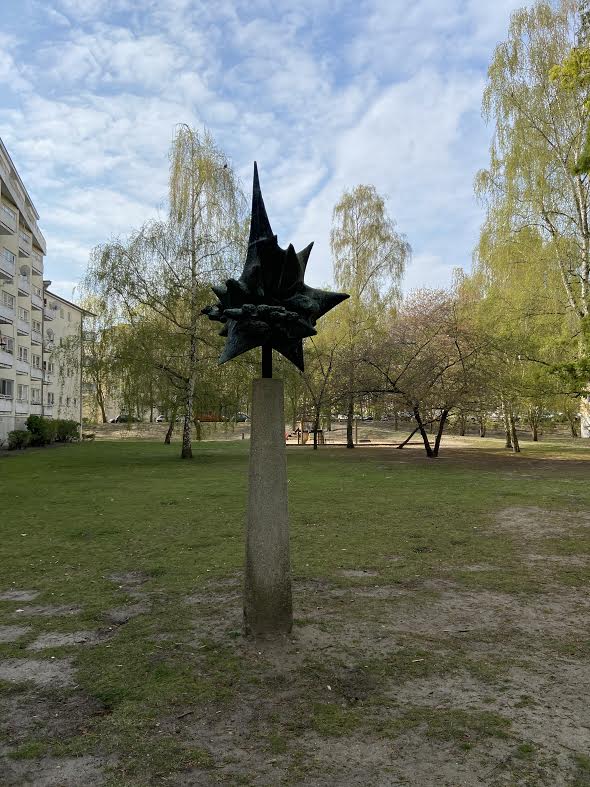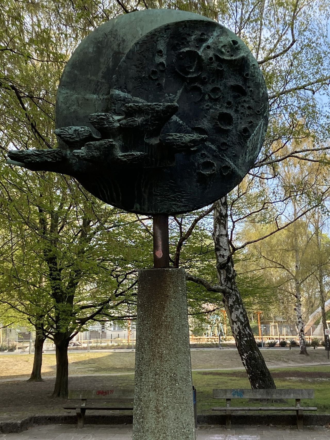 „Vier Bronzeskulpturen auf stelenartigen Betonsockeln mit stilisierter Darstellung von Mond (Halbmond, Vollmond, Andeutung von Mondkratern) und Sternen (kristalline Gebilde), auf unterschiedliche Standorte in der von Scharoun erbauten Wohnsiedlung verteilt“ (Stefanie Endlich, 1990).
