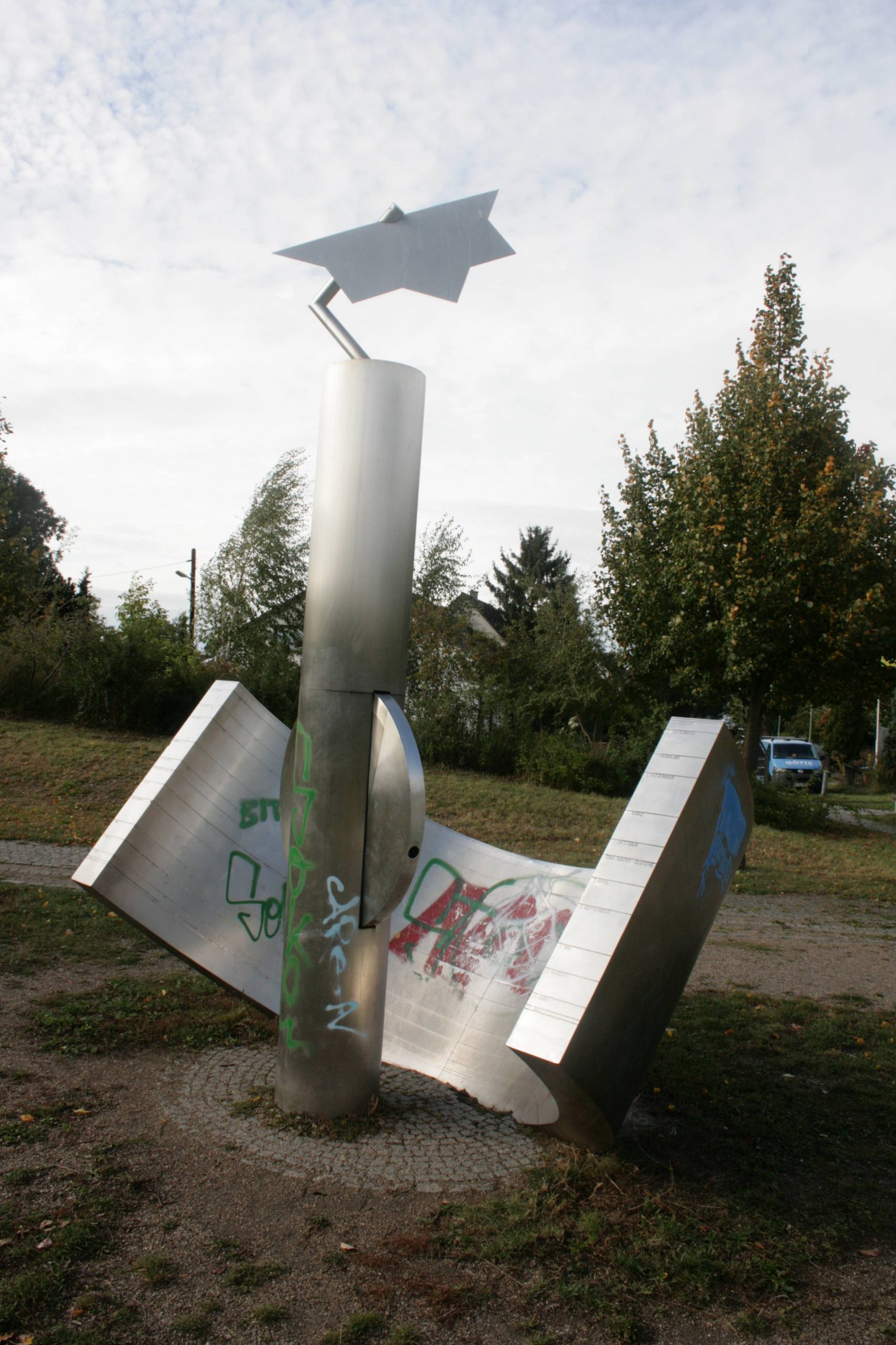 Die aus matt geschliffenem Edelstahl recht stabil konstruierte Sonnenuhr besteht aus einer hohen Säule mit integriertem vertikal drehbar gelagertem Rad, darauf ein Aufsatz in Gestalt eines halben Sterns, der Schatten wirft. Um die Säule ist eine einen Halbkreis beschreibende Wand schräg aufgestellt, auf der vertieft und schwarz oder rot hinterlegt Linien und astronomische Angaben zu finden sind. Eine rechteckige Platte aus Edelstahl mit vertieften Lettern gibt Auskunft über die Funktion (Jörg Kuhn, Susanne Kähler).