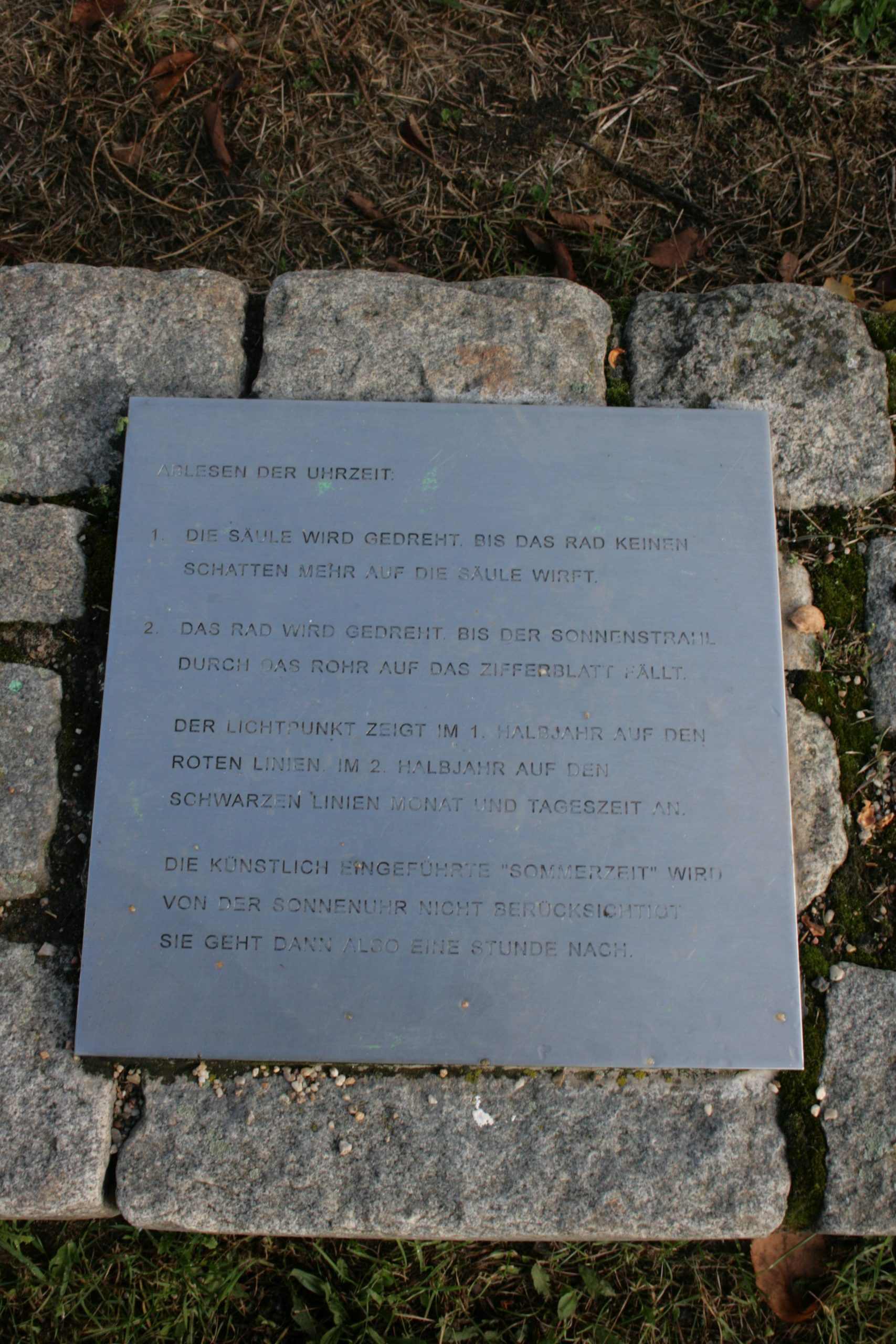 »ABLESEN DER UHRZEIT / 1. DIE SÄULE WIRD GEDREHT, BIS DAS RAD KEINEN / SCHATTEN MEHR AUF DIE SÄULE WIRFT / 2. DAS RAD WIRD GEDREHT BIS DER SONNENSTRAHL / DURCH DAS ROHR AUF DAS ZIFFERBLATT FÄLLT / DER LICHTPUNKT ZEIGT IM 1. HALBJAHR AUF DEN / ROTEN LINIEN, IM 2. HALBJAHR AUF DEN / SCHWARZEN LINIEN MONAT UND TAGESZEIT AN. / DIE KÜNSTLICH EINGEFÜHRTE SOMMERZEIT WIRD / VON DER SONNENUHR NICHT BERÜCKSICHTIGT / SIE GEHT DANN ALSO EINE STUNDE NACH.«