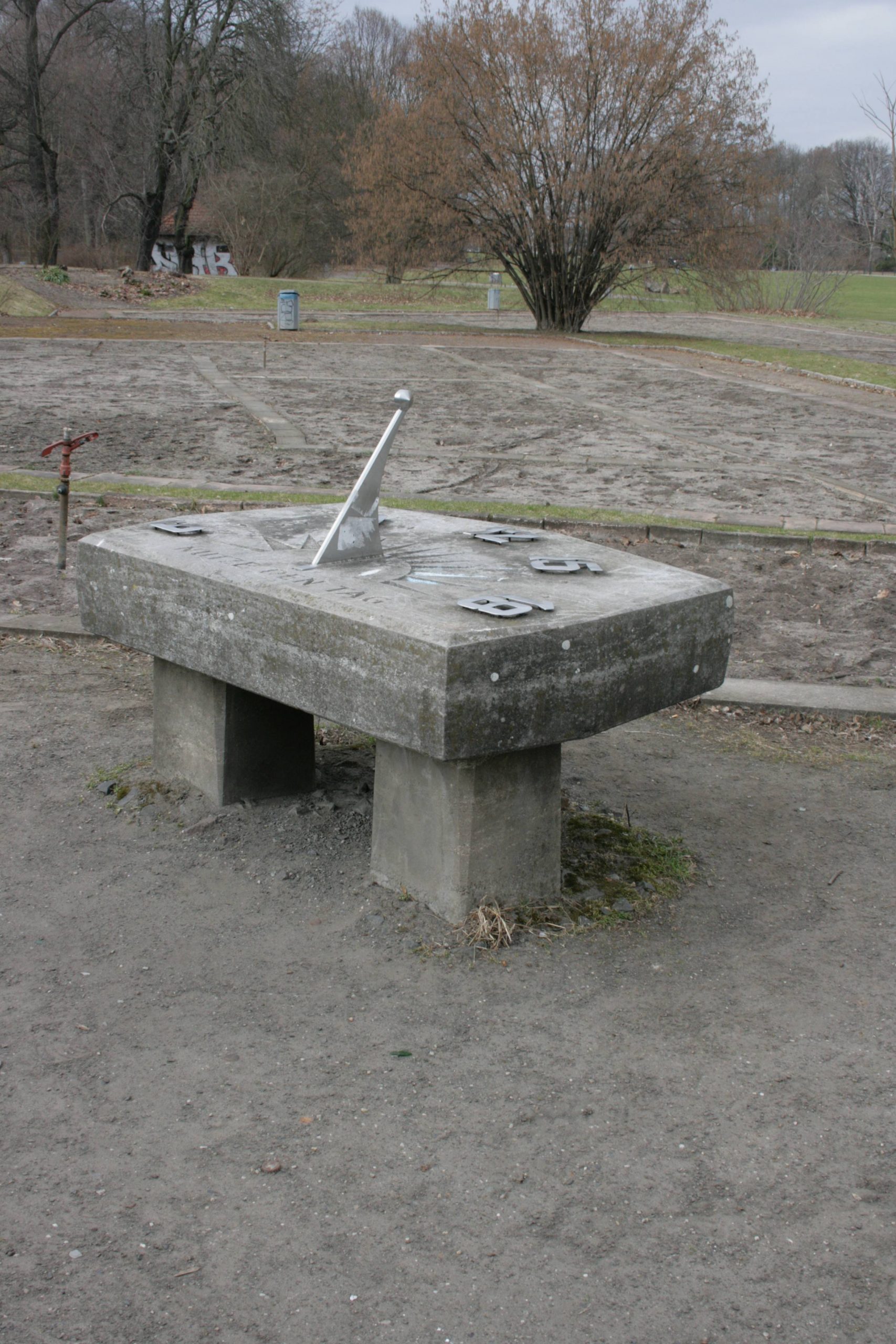 Beschreibung: Die Sonnenuhr besteht aus einer polygonal geformten Platte aus Muschelkalkstein, die auf drei Vierkantpfosten aufliegt. Auf die Platte ist ein Zeiger aus Edelstahl aufmontiert. Die Zahlen 6, 9, 13, 15, und 18 sind ebenfalls aus Edelstahl und appliziert, die Zahlen dazwischen werden durch Einkerbungen markiert. Im Halbrund um den Zeiger markieren vertieft stilisierte Sonnenstrahlen die Stunden, in die Platte ist vertieft die Inschrift NUTZE DEN TAG eingearbeitet (Susanne Kähler).