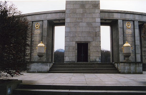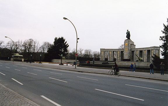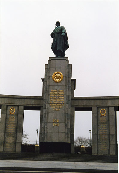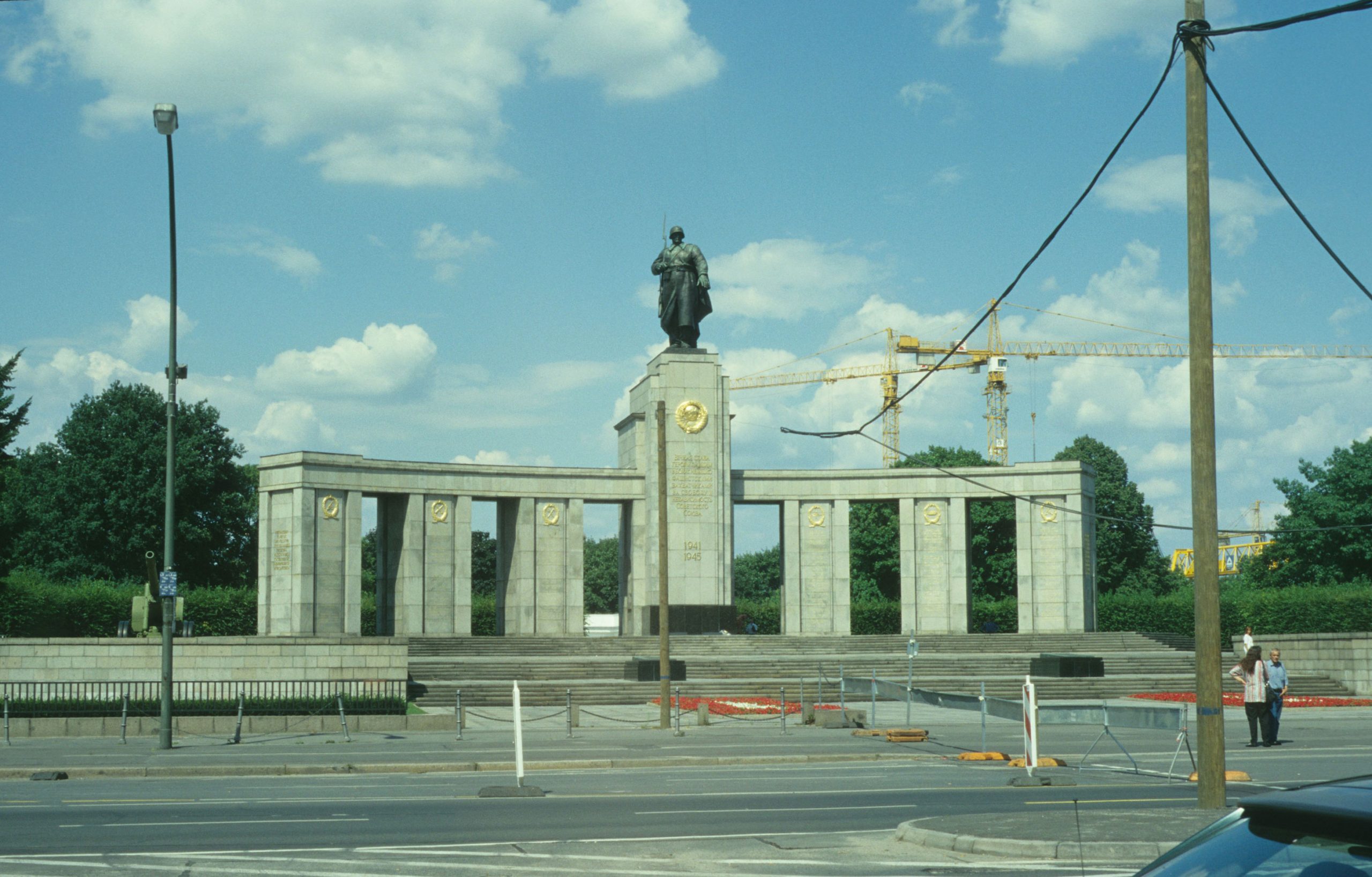 Das Sowjetische Ehrenmal im Tiergarten ist auf Befehl der Roten Armee nach Beschluss des Kriegsrates der Gruppe sowjetischer Besatzungstruppen im Mai 1945 unmittelbar nach dem Ende des 2. Weltkrieges errichtet worden. Die extrem kurze Entstehungszeit lässt darauf schließen, dass es keinen Wettbewerb gegeben hat, sondern die Wahl der Künstler und die Gestaltung kurzfristig angeordnet worden sind. Die Bildhauer Lew E. Kerbel und Wladimir E. Zigal und der Architekten Nikolai W. Sergijewski sind von dem Befehlshaber Georgi K. Shukow zum Entwurf Denkmals beauftragt worden. Es handelt sich um das erste sowjetische Ehrenmal in der Stadt. Die Anlage wurde mit deutschen Arbeitskräften aufgebaut. Die Errichtung fand von Juli bis November 1945 statt. Das Standbild wurde zunächst in provisorischer Form aus Gips aufgestellt. Am 11.11.1945, am Tag der Oktoberrevolution, wurde das Denkmal mit einer feierlichen Zeremonie, gemeinsam mit den Alliierten, eingeweiht. Im Frühjahr 1946 konnte schließlich die bei der Gießerei Hermann Noack in Friedenau gegossene Bronzefigur auf dem Mittelpfeiler des Anlage platziert werden. Die applizierten Sterne, Embleme, Schrifttafeln und Buchstaben sind ebenfalls hier entstanden, sie waren in der Zeit bis zum Ende der 1960er Jahre nicht goldfarben gefasst. Auch war die aus Ziegelsteinen gemauerte Architektur der Anlage in den ersten Jahrzehnten nicht mit Granit, sondern mit Travertin verkleidet, die Herkunft des Materials ist nicht geklärt, die häufig in der Literatur geäußerte Vermutung, es handele sich um Material aus der für Hitler nach Plänen Albert Speers errichteten (Neuen) Reichskanzlei, entbehrt jeder Grundlage. Die das Denkmal umgebenden Mauern und Podeste der Panzer waren ebenfalls mit Travertin verkleidet. Die Brunnenelemente aus Granit, die sich im rückwärtigen Teil der Anlage befinden, sind 1945 aus einem anderen architektonischen Zusammenhang entnommen worden. Die Herkunft ist ungeklärt. Pläne, weitere Denkmalsgruppen dort (vermutlich anstelle der Geschütze) aufzustellen sind nicht zuende geführt worden. In der Gießerei Noack wurde aber 1948 daran gearbeitet. 1951 bis1953 erfolgten bereits kleinere Restaurierungsmaßnahmen am Denkmal. 1961 gab es dann konkrete Pläne zu einer Generalrestaurierung der Anlage, die schließlich ab 1966 durchgeführt wurde: Neuverkleidung des Monuments durch VEB Stuck und Naturstein mit Granit (vorher Travertin), Neubau der Wachhäuser, Vergoldung der Embleme, Erneuerung des schwarzen Syenitsockels am Mittelpfeiler. 1969 wurde das Gelände mit einem Gitterzaun eingefriedet. Die rückwärtige Architektur (Bau am Tor) wurde um 1970 abgerissen und in der alten Form neu aufgebaut. Die Gesamtanlage bekam nun einen rechteckigen Grundriss. Nach einem Anschlag auf die ständig vor dem Ehrenmal postierte Ehrenwache wurde das Denkmal und der sich davor befindliche Fußweg von 1970 bis 1987 gesperrt. 1990 übergab die bisherige Denkmalverwaltung das Denkmal schließlich in schlechtem baulichen Zustand an den Senat von Berlin. Seitdem wurden zahlreiche restauratorische Maßnahmen durchgeführt. In den 1990er Jahren übernahm das Berliner Büro von Christina Petersen und Knud Peter Petersen die Sanierung des Monuments. Im Mai 1995 kam es zur Wiederaufstellung der restaurierten Bronzeskulptur. 2001 restaurierte man die Panzer und Geschütze. Die beiden runden Brunnen im hinteren Bereich wurden nach 2003 wieder hergestellt (Susanne Kähler, Jörg Kuhn).