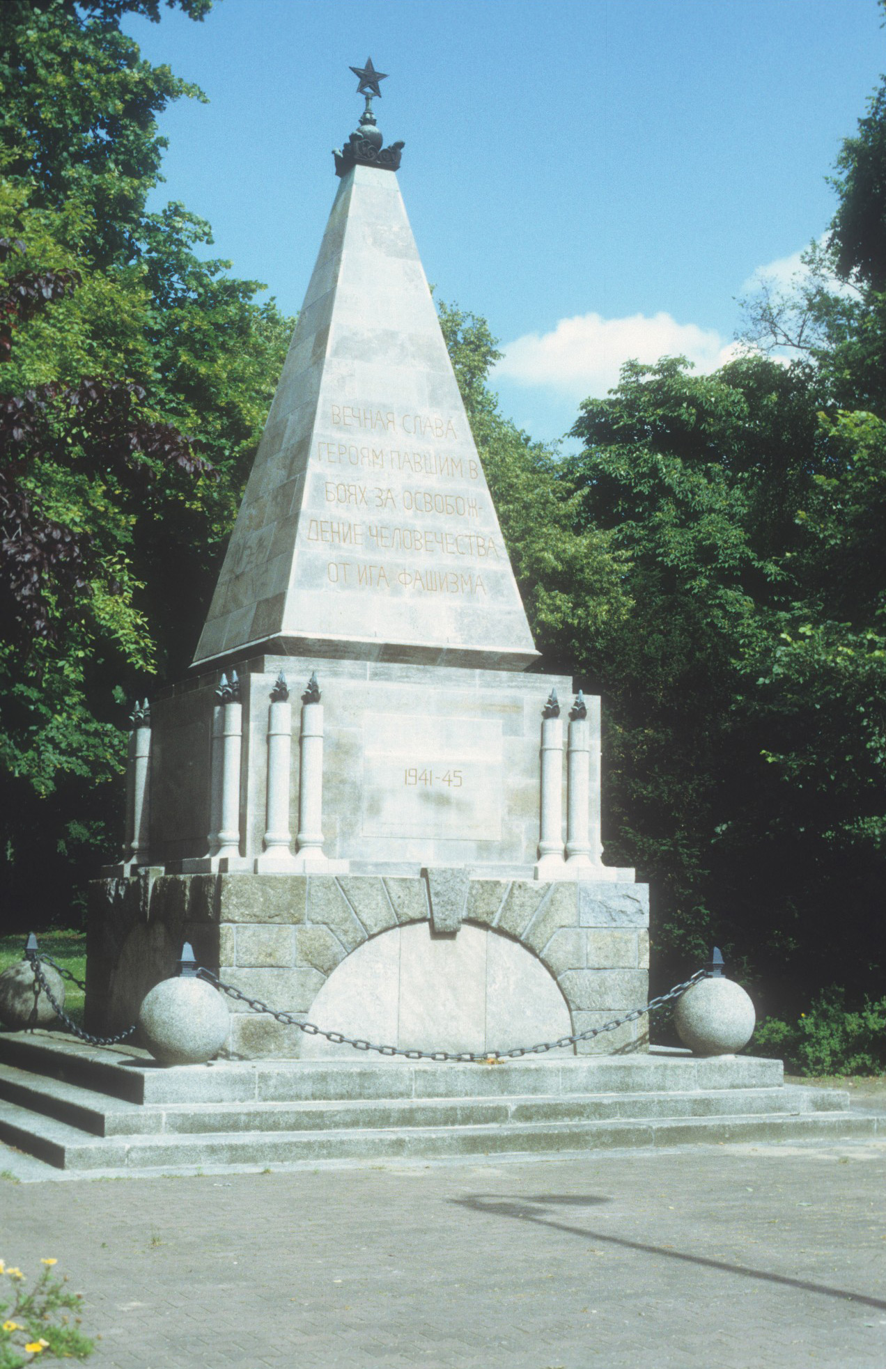 »ВЕЧНАЯ СЛАВА / ГЕРОЯМ ПАВШИМ В / БОЯХ ЗА ОСВОБОҖ- / ДЕНИЕ ЧЕЛОВЕЧЕСТВА / ОТ ИГА ФАШИЗМА / 1941-45«