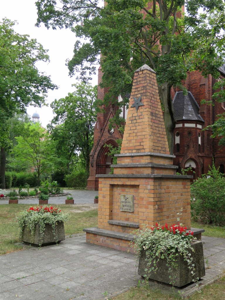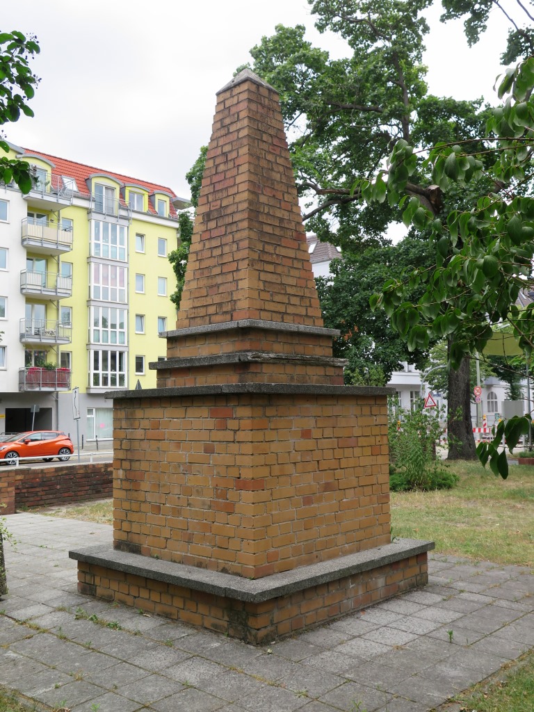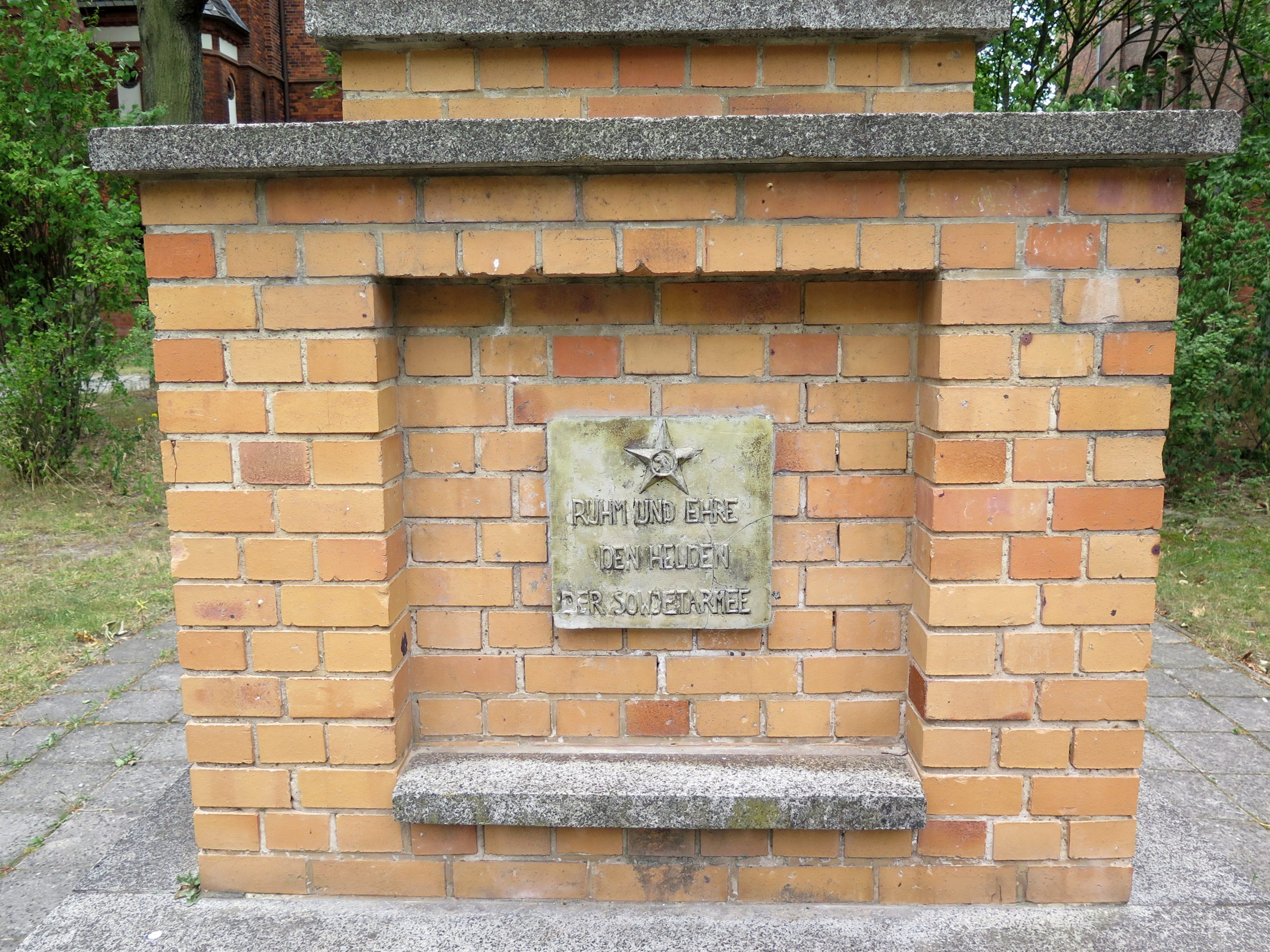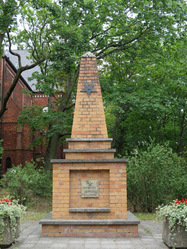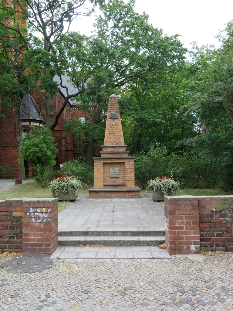Von der Nöldnerstraße gelangt der und die Besucher*In über zwei Stufen auf eine leicht erhöhte, mit Kunststeinplatten belegte Fläche. Darauf steht das Ehrenmal, bestehend aus einem flachen Unterbau, einem breiten Sockel und dem darauf aufruhenden, gleichfalls gemauerten Obelisken. Das Zwischenglied ist dreifach gestuft. Die einzelnen Zonen sind durch Kunststeinplatten von einander optisch getrennt. Ansonsten dominiert das warme Gelb der Klinker. An der Front ist eine Inschriftentafel mit abgerundeten Ecken und einem Sowjetstern in erhabenem Relief und der darunter befindlichen, ebenfalls erhaben gearbeiteten Inschrift angebracht. Im oberen Bereich der Obeliskenfriont ist ein Sowjetstern aus Metall angebracht. Zwei rechteckige Waschbetonpflanzkübel seitlich vor dem Monument sind mit Efeu und rot blühenden Pflanzen bestückt (Nicola Vösgen).