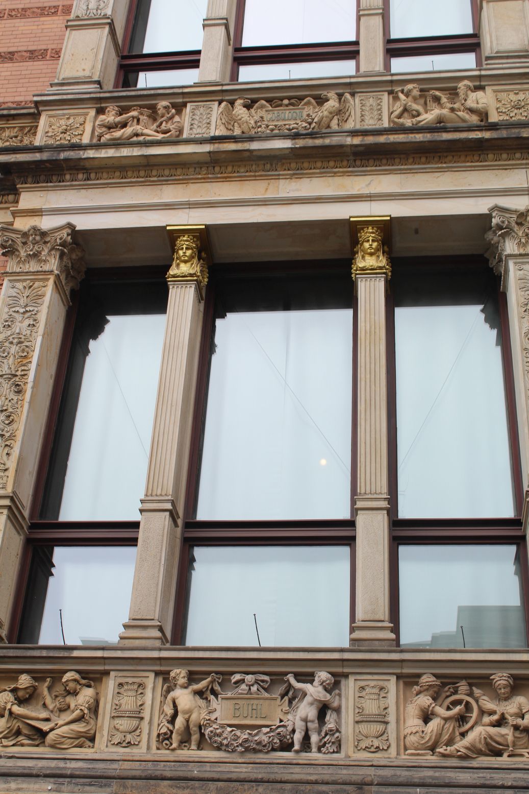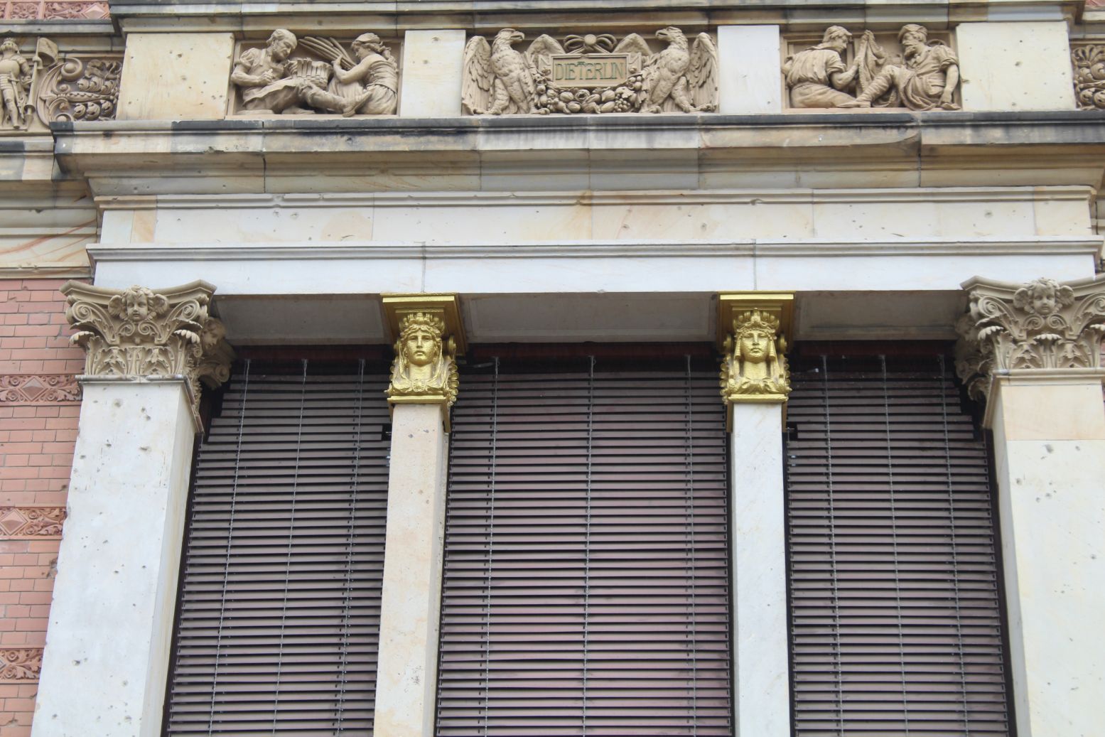 Die Fenster im zweiten und dritten Geschoss der Nord-, Ost- und Westfassade des Martin-Gropius-Baus werden durch je zwei schmale kannelierte Pfeiler geteilt, die mit Kapitellen in Form von vergoldeten Sphingen-Köpfen enden. Es sind insgesamt vier verschiedene Modelle, die abwechselnd Verwendung fanden (Nicola Vösgen).