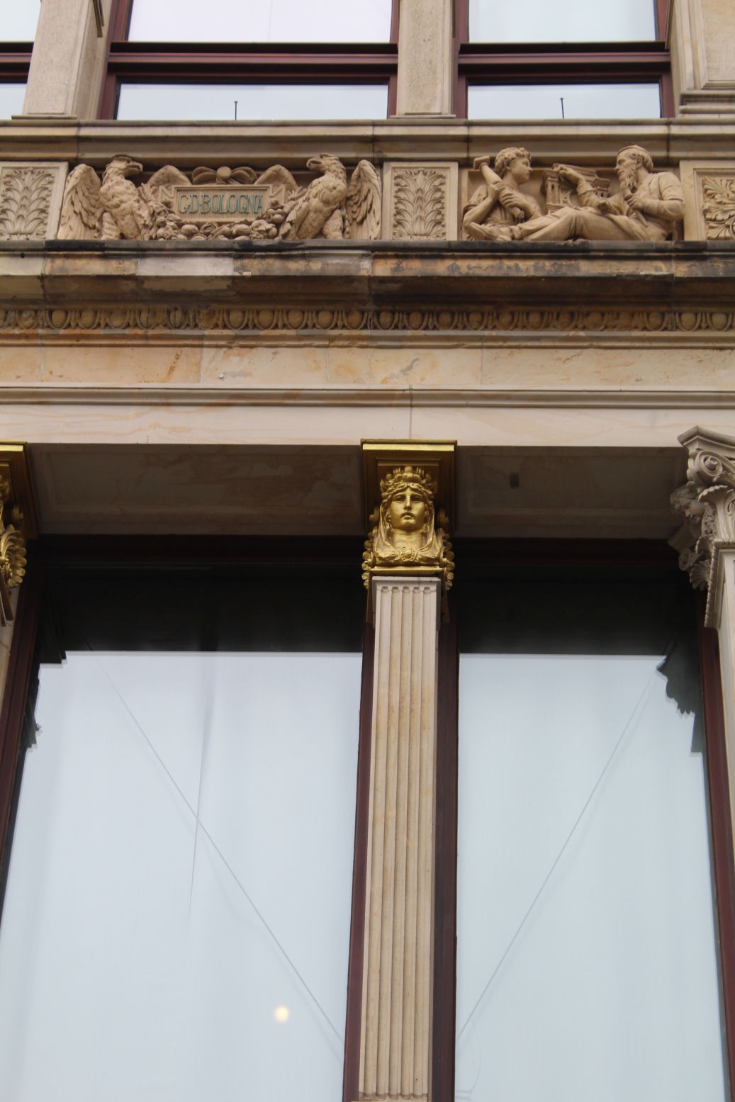Die Fenster im zweiten und dritten Geschoss der Nord-, Ost- und Westfassade des Martin-Gropius-Baus werden durch je zwei schmale kannelierte Pfeiler geteilt, die mit Kapitellen in Form von vergoldeten Sphingen-Köpfen enden. Es sind insgesamt vier verschiedene Modelle, die abwechselnd Verwendung fanden (Nicola Vösgen).
