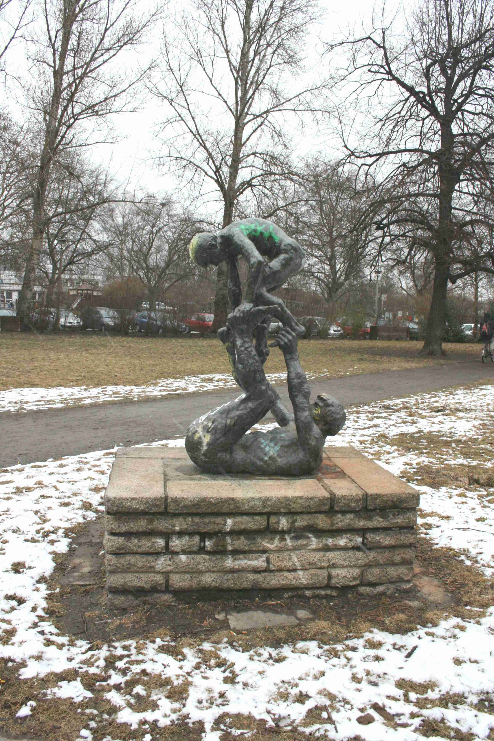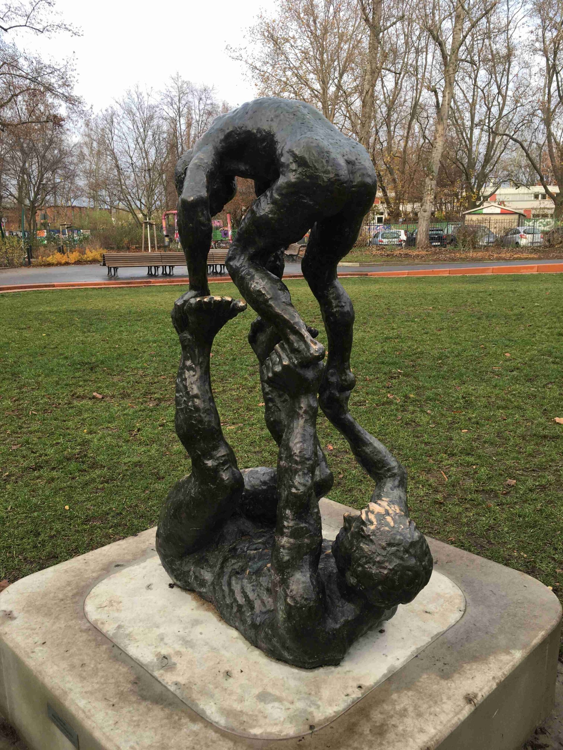 Auf einem breiten, rechteckigen Sockel aus Kunststeinblöcken ruht die harmonisch aufgebaute Bronzegruppe eines jungen Mannes mit einem Knaben, wohl Vater und Sohn, beim Spielen. Naturnahe Formulierung der unbekleideten Körper. Der junge, ideal gebildete Mann liegt auf dem Rücken, die nach innen angewinkelten Beine nach oben gestreckt. Auf seinen Füßen stützt der Knabe mit den Händen ab, währen des Knaben Füße vom Liegenden mit den Händen umfasst und gestützt werden. Durch die komplizierte sportliche Stellung hindurch halten die beiden Figuren Blickkontakt. Die Gestaltung der Oberflächen ist bei aller Naturnähe der Darstellung modern aufgelockert (Jörg Kuhn).
