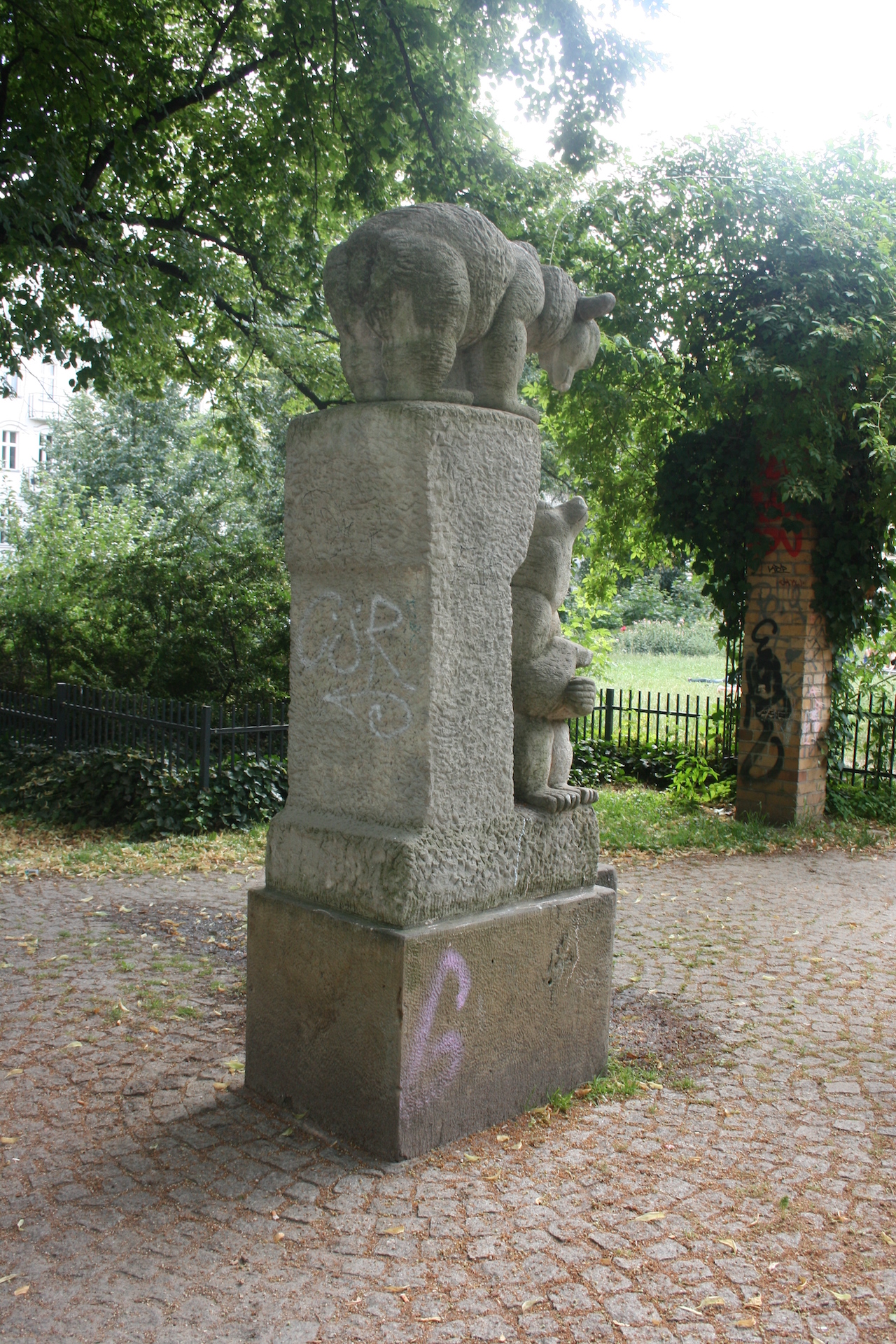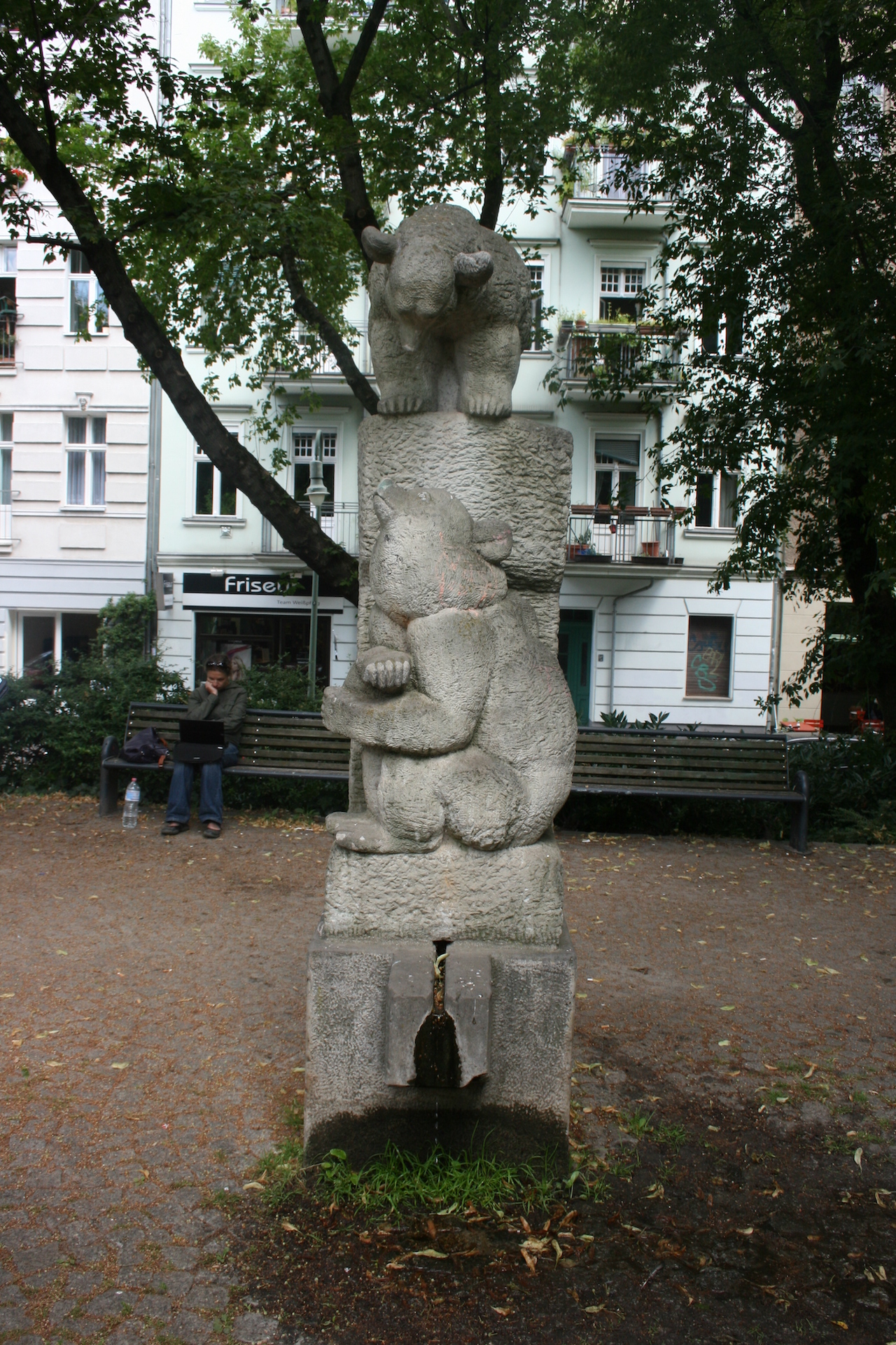 Auf einem rechteckigen Sandsteinsockel mit gestockten Oberflächen ruht ein in etwa L-förmiger Aufsatz, ebenfalls aus gestockt bearbeitetem Sandstein, der zwei naturnah formulierten Bärenfiguren als Standfläche dient. Auf dem längeren Unterbalken sitzt ein Bär mit nach oben gewandtem Kopf, die Arme fast menschenähnlich vor die Brust gelegt. Deutlich ist die Blockform des Ausgangssteins zu erkennen. Der andere Bär steht auf dem vorne auskragend gebildeten vertikalen Steinbalken. Er steht auf seinen vier Beinen. Den Kopf hält er dem unter ihm sitzenden anderen Bären herab geneigt zugewandt. Der untere Sockel weißt zum Park hin eine blockhaft stehen gelassene Nase auf, in die eine schmale Rinne geschnitten ist, die einem feinen, tröpfelnden Wasseraustritt als Laufrinne dient. Das Wasser rinnt den Sockel entlang zum gepflasterten Boden, wo das Wasser zwischen den Steinritzen versickert (Jörg Kuhn).
