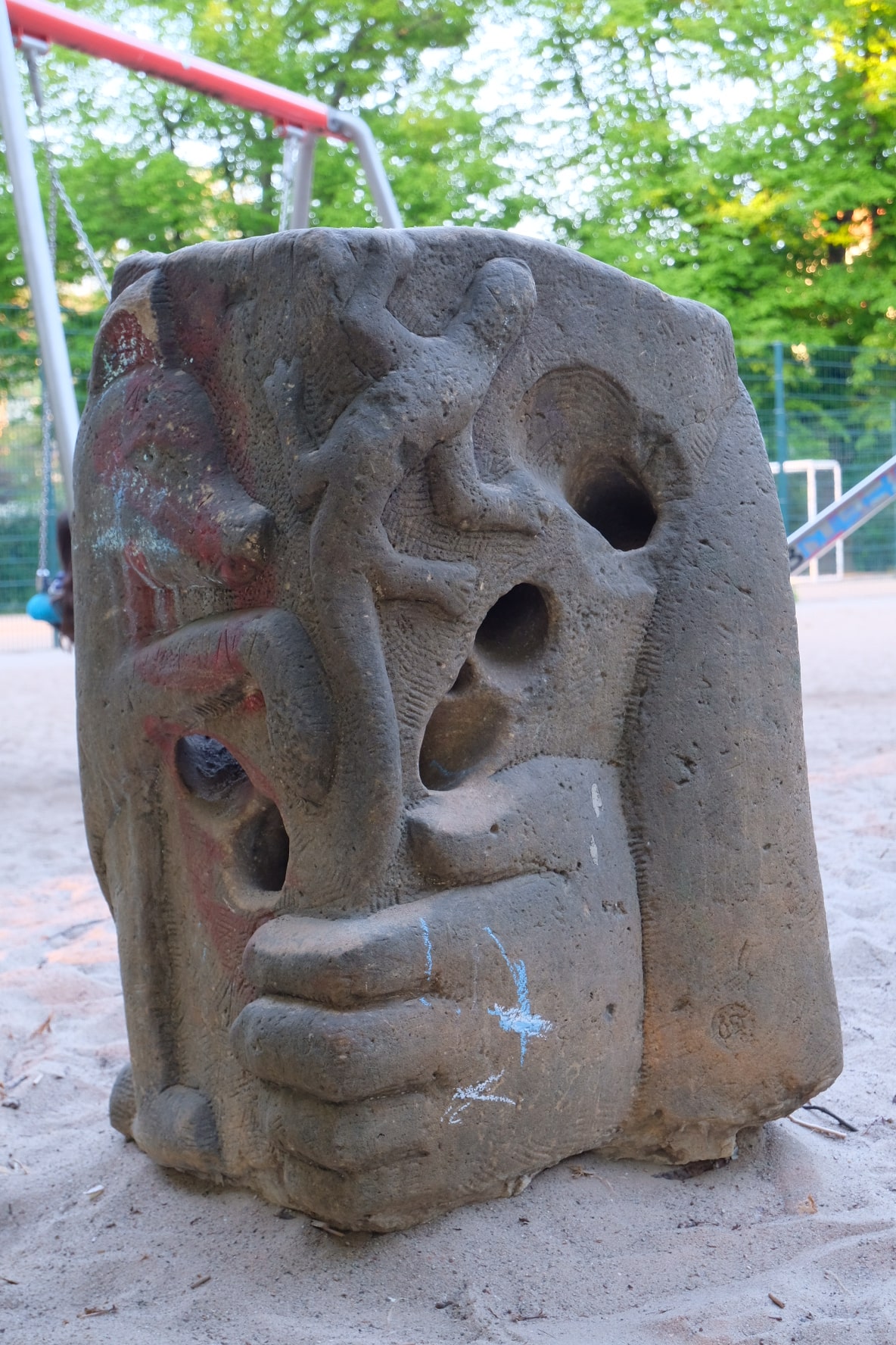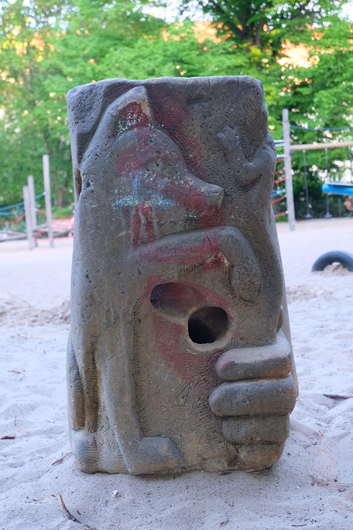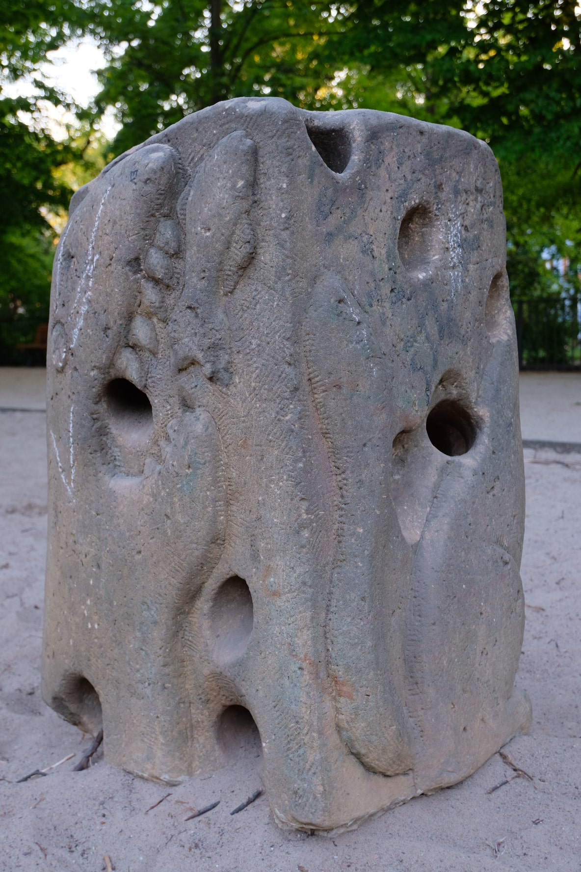 Die Sandsteinskulptur von Christine Dewerny hat eine quaderförmige Grundform, wobei diese nicht symmetrisch oder ebenmäßig geformt ist. So gibt es z.B. runde Ausbuchtungen an den Seiten der Skulptur. Die Skulptur hat vier reliefierte Ansichtsseiten, welche verschiedene Tiermotive zeigen, sowie eine menschliche Hand, die den Spielstein zum Teil umschließt. Dargestellt sind ein Fuchs, ein Salamander, und zwei Fische, von denen ein großer, haiähnlicher Fisch einen kleineren zu fressen scheint. Auffällig an der Gestaltung ist einerseits, dass die Figuren sich rundum auf die verschiedenen Ansichten erstrecken und andererseits die runden, tunnelähnlichen „Löcher“ in der Skulptur, die die verschiedenen Ansichtsseiten miteinander verbinden.