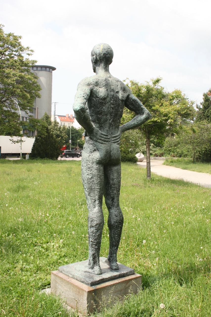Auf einem rechteckigen, an den oberen Kanten abgeschrägten Sockel aus poliertem grauem Granit steht auf rechteckiger Plinthe ein überlebensgroß dargestellter, unbekleideter Mann. Beide Hände hat er auf Hüfthöhe in die Seiten gestützt. Die Oberflächengestaltung zeigt das für die Zeit typische, unruhige Erscheinungsbild. Die Vermeidung glatter Oberflächen zugunsten einer neoimpressionistischer Modellierung ist als Hinweis auf die gewollte Modernität zu verstehen, ist jedoch eine zeittypische Erscheinung bei der figuralen und auch bei der abstrakten Plastik in Ost und West. Die Figur ist in Bronze gegossen und ist patiniert. Eine Bezeichnung hat sich nicht finden lassen, was im Übrigen bei der in der DDR in dieser Zeit entstandenen Plastik die Regel ist (Susanne Kähler).