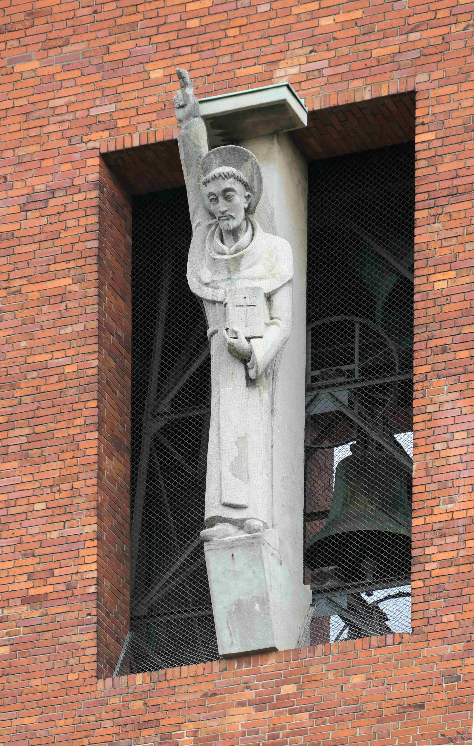 In dem 36 Meter hohen Portalturm der St.-Bernhard-Kirche steht auf einer Plattform in dem großen Rechteckausschnitt des Glockengeschosses die überlebensgroße Figur des Zisterzienserabtes und Kirchenpatrons Bernhard von Clairvaux. Der Heilige hält in seiner linken Hand ein mit einem Kreuz verziertes Buch, die rechte Hand weist im Segensgestus gen Himmel (Nicola Vösgen).