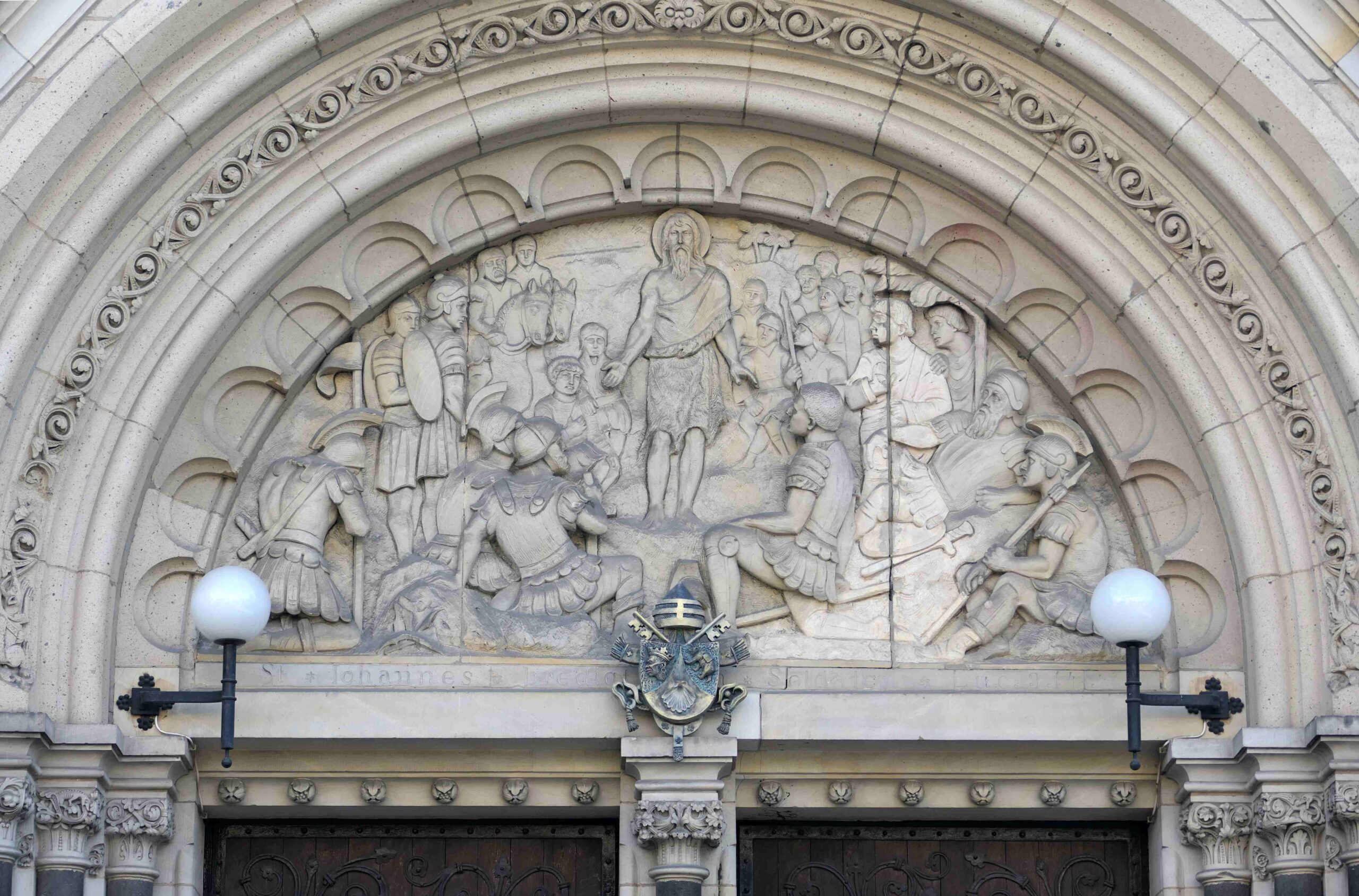 Ein halbkreisförmiges Relief aus hellem Sandstein schmückt das Tympanon am Haupt-Eingangsportal der Johannes-Basilika. Es zeigt die Szene aus dem Lucas Evangelium, in der Johannes der Täufer den in den Diensten von Herodes stehenden römischen Soldaten predigt.