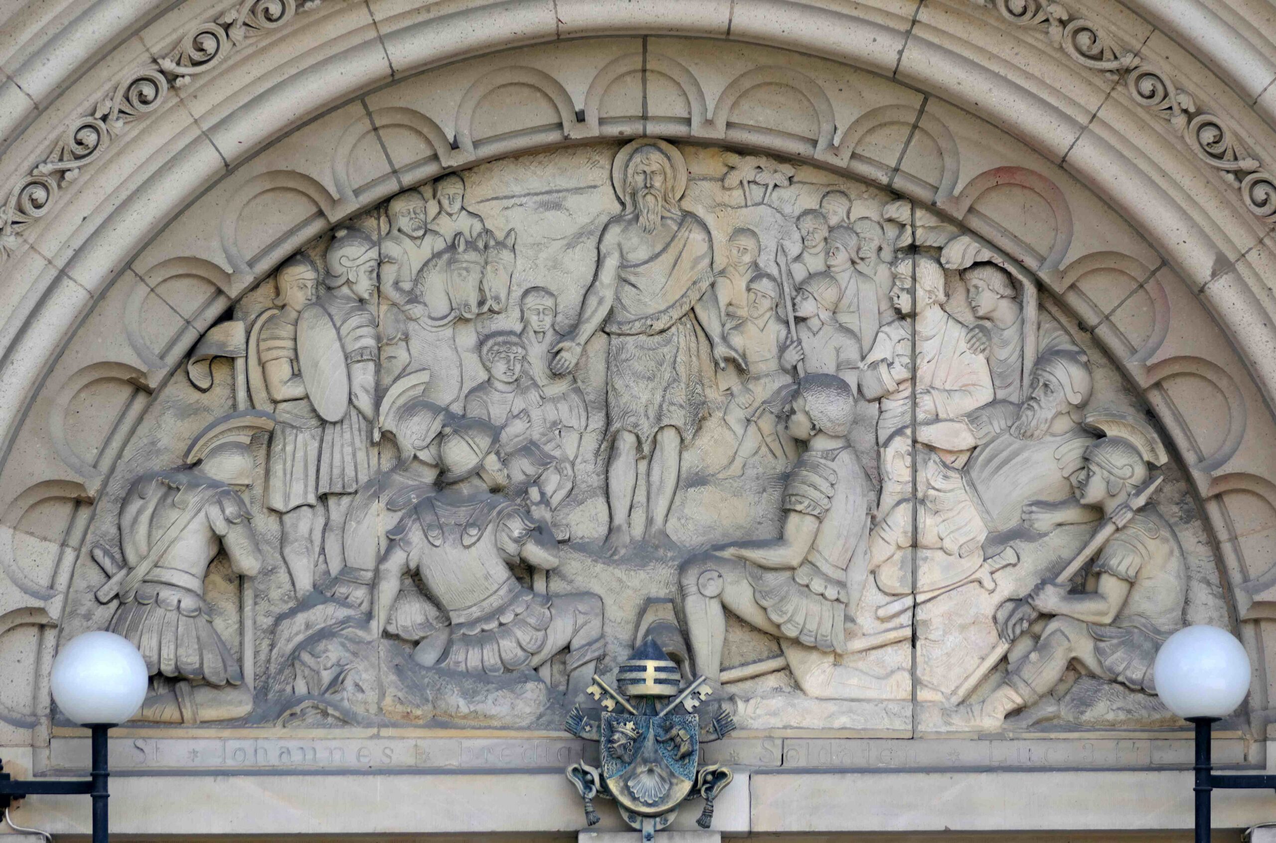Ein halbkreisförmiges Relief aus hellem Sandstein schmückt das Tympanon am Haupt-Eingangsportal der Johannes-Basilika. Es zeigt die Szene aus dem Lucas Evangelium, in der Johannes der Täufer den in den Diensten von Herodes stehenden römischen Soldaten predigt.