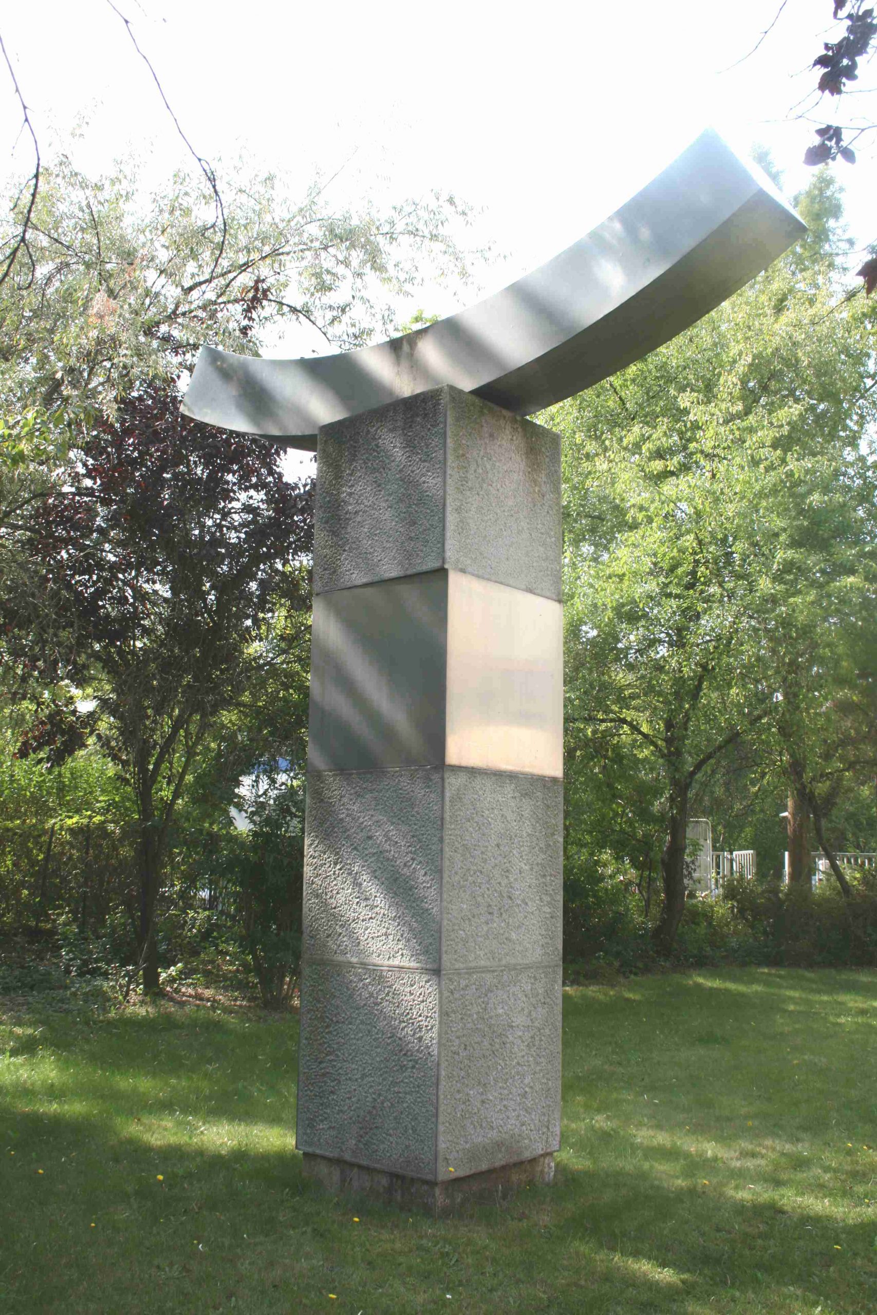Über quadratischem Grundriss steht eine pfeilerartige Vierkantstele aus drei gestockt gearbeiteten grauen Marmorwürfeln und einem mattierten Stahlwürfel. Der über dem Stahlwürfel folgende Marmorwürfel ist gegenüber den unteren Würfeln leicht verschoben. Auf dem obersten Würfel ruht ein Bogensegment aus Edelstahl.