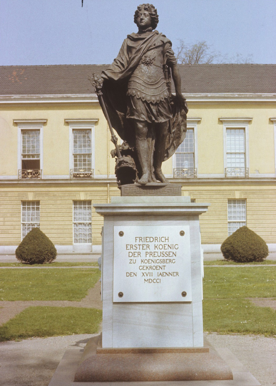 Das Original zu diesem (ursprünglich für das barocke Berliner Zeughaus geschaffenen) Standbild aus dem Jahre 1698 stand zwischen 1802 und 1945 in Königsberg und ist seitdem verschollen. Der sich im Bodemuseum befindliche Gipsabguss diente 1971/1972 der Wiederherstellung der alten Statue unter Beteiligung von Waldemar Grzimek. Mit Unterstützung von Gerhard Marcks konnte so ein bedeutendes barockes Herrscherstandbild mit der idealisierten Darstellung des Monarchen für die Öffentlichkeit wieder gewonnen werden. Die Aufstellung auf einer Kopie des 1802 von Schadow für Königsberg/Ostpreußen geschaffenen Sockels fand 1979 statt. Am 19. Mai 1983 wurde die linke Sockelplatte, geschaffen von dem Bildhauer Fritz Becker mit einer Ansprache von Herrn Prof. Dr. Martin Sperlich enthüllt (Susanne Kähler).