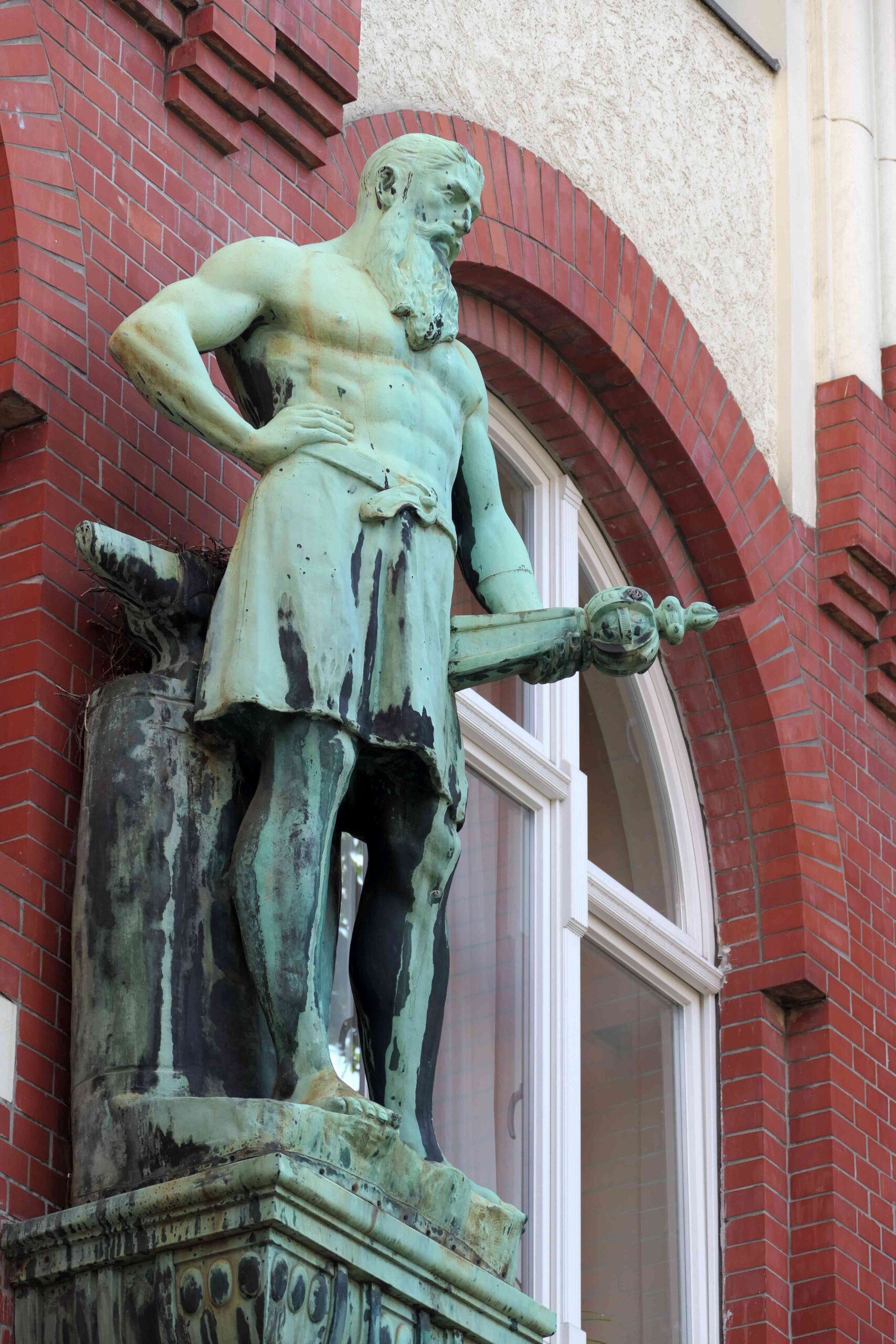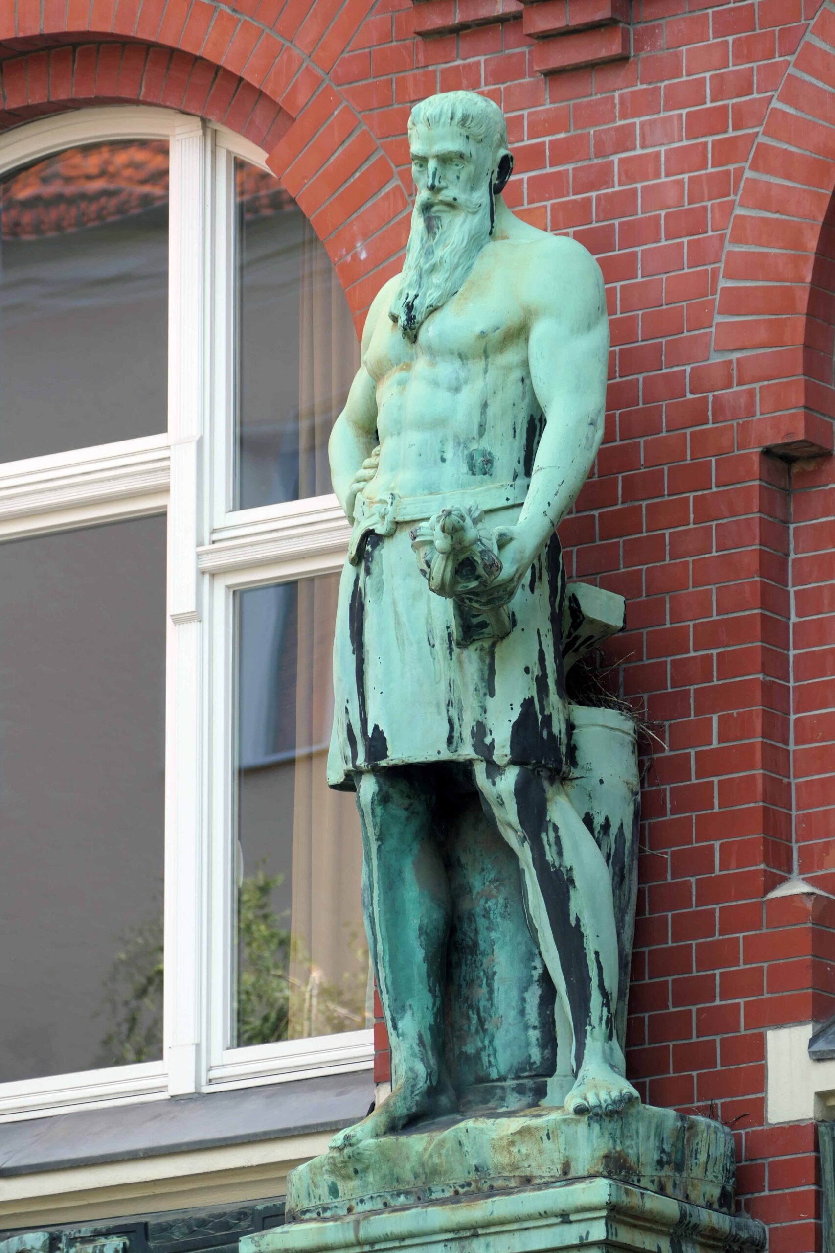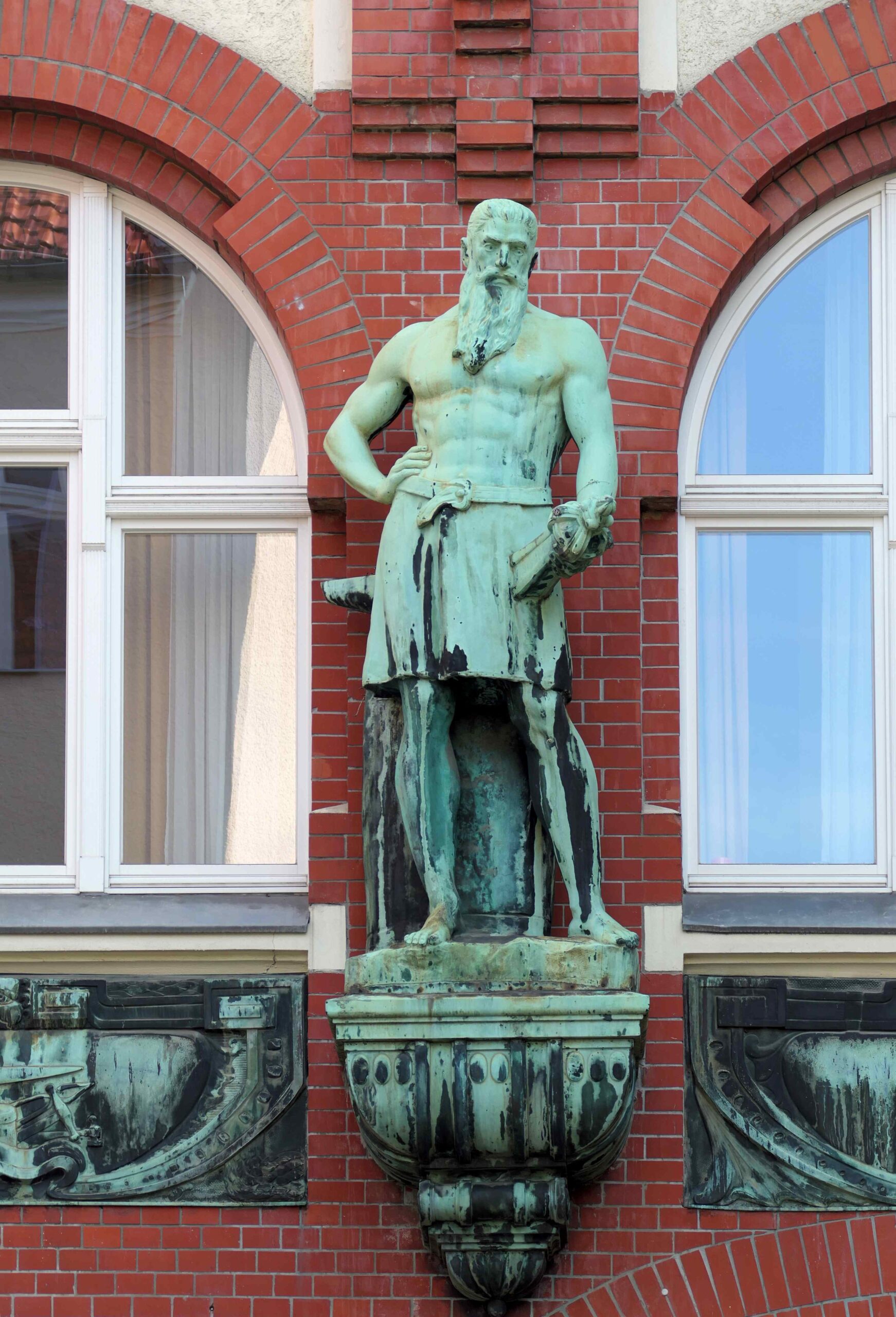 An der Fassade des im zweiten Bauabschnitt errichteten Gebäudes der Bauklempnerei Paul Thom steht in Höhe des ersten Obergeschosses auf einer Konsole ein idealtypisch gestalteter Schmied. Die überlebensgroße Statue zeigt einen bärtigen Mann im mittleren Alter mit nacktem Oberkörper, der nur mit einem knielangen Schurz bekleidet ist. Die rechte Hand ist in die Hüfte gestützt, in der linken hält er ein fertiggestelltes Werkstück. Links hinter der Figur ist ein Amboss zu erkennen (Nicola Vösgen).