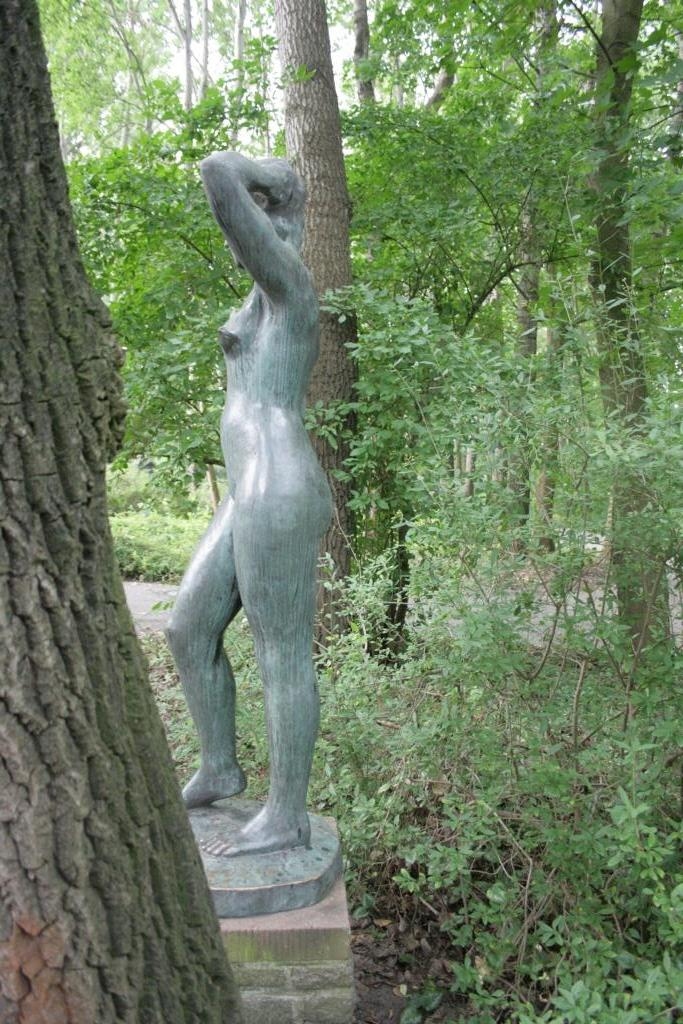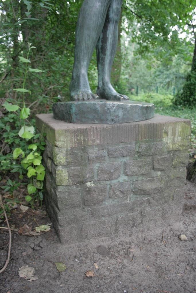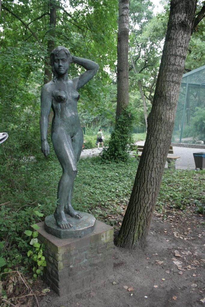 1960 modelliert und 1961 im Volkseigenen Bretrieb in Lauchhammer gegossen. Aufgestellt im Tierpark Friedrichsfelde 1962. "Ehe wir uns aber zu einem Kaffeestündchen niederlassen, machen wir schnell einen Abstecher zum Reiherflugkäfig, wo an einem idyllischen Ruheplatz ein Mädchenakt mit dem von Künstlern 'selten' vergebenen Namen 'Stehende' von Otto Maerker uns erfreut. Diese Bronze, 1961 angekauft und 1962 aufgestellt, läuft bei den Tierparkmitarbeitern unter dem Namen 'Uschi', mutmaßlich wegen einer gewissen Ähnlichkeit. Der VEB Schwermaschinenbau Lauchhammerwerk, der viele unserer Plastiken goss, spendete dankenswerterweise dem Tierpark im Rahmen des Nationalen Aufbauwerks den Kunstguß im Werte von 5400,- Mark" (Heinrich Dathe, 1980, S. 57-60) (Jörg Kuhn).