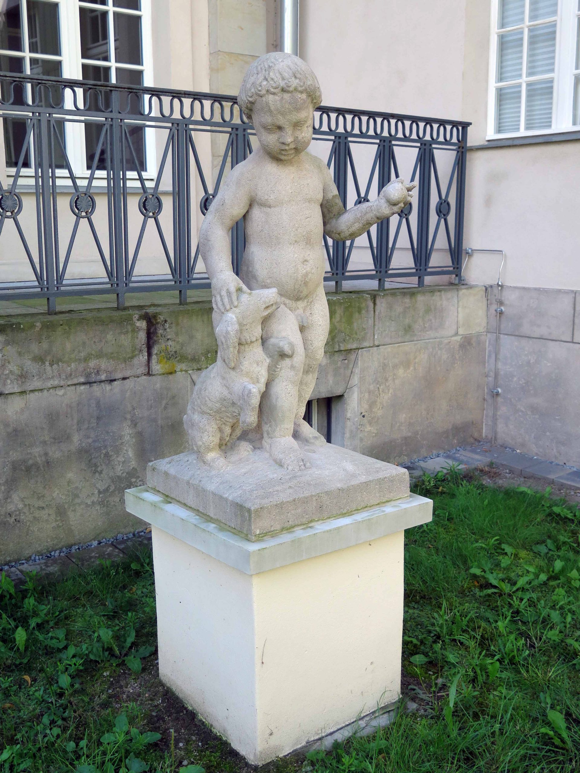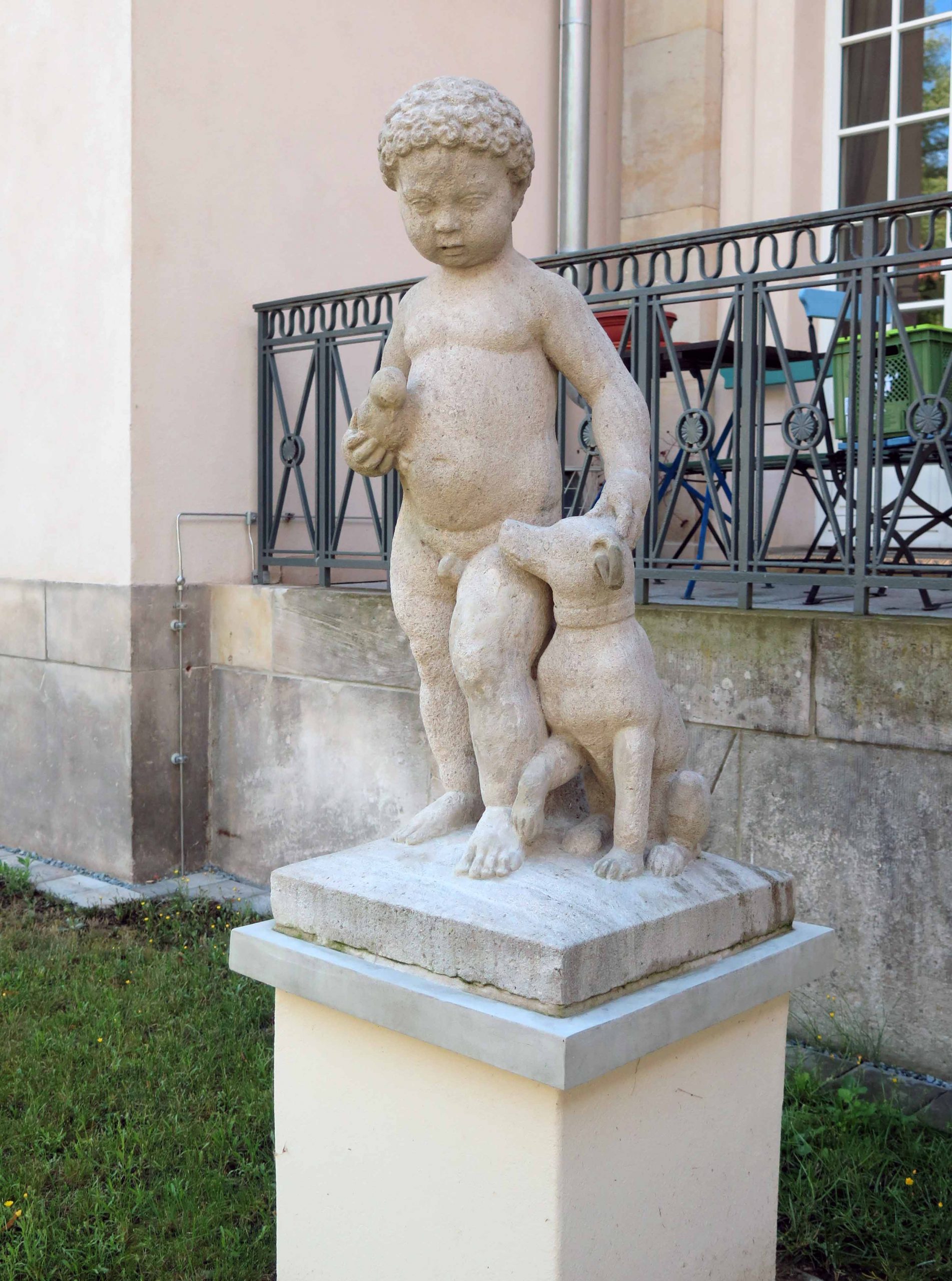 Die beiden Knabenskulpturen bekrönten einst die Torpfeiler der abschließenden südwestlichen Mauer zwischen den Häusern 5 und 6. Dem Knaben auf dem rechten Torpfeiler ist ein springender Hund, dem des linken Pfeilers ein sitzender Hund beigegeben. Beide Knaben lehnen sich rückseitig an Baumstümpfe (Jürgen Tomisch).