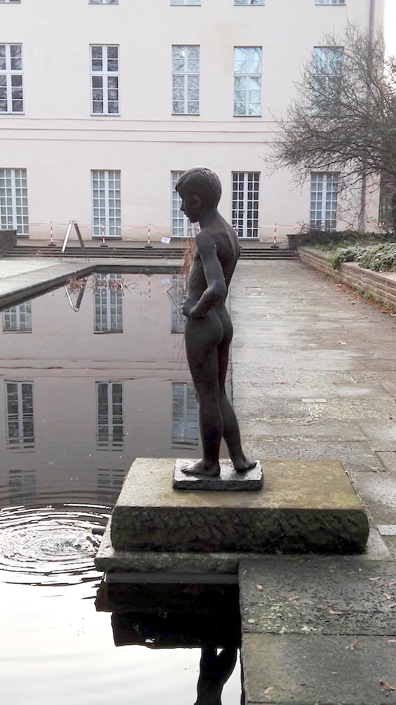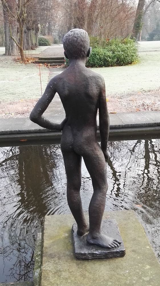 Auf einem Sockel mit rechteckiger Grundfläche steht die Standfigur eines nackten Knaben. Der Sockel ist an den Seiten grob behauen und bossiert. Die Oberseite wurde poliert. Die Plinthe der Figur hat eine quadratische Grundfläche, ist in ihrer Grundfläche jedoch deutlich kleiner als der Sockel. Der dargestellte Knabe dreht den rechten Fuß nach außen, stemmt seinen linken Arm in die Hüfte und lässt den rechten Arm locker neben dem Körper hängen. Es entsteht eine Pose, die stark an das antike Gestaltungsprinzip des Kontrapostes erinnert. Der Miene des Jungen ist ein leichtes Lächeln zu entnehmen. Der Blick ist nach vorne gerichtet. (Matthias Gegner)