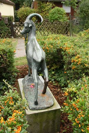 Die Bronzefigur eines Steinbocks steht über irregulär geformter Plinthe auf einem Sockel aus Beton (Kunststein). Der Sockel trägt auf seiner schmalen Frontseite eine Bronzeplakette mit einer Inschrift. Der Steinbock hat den Kopf zur Seite gewendet. Die Vorderläufe stehen auf einer kleinen Erhebung, die durch das kaum näher zu bestimmende Naturrelief als Stein- oder Felsbrocken zu deuten wäre. Dieser Teil der Plinthe zeigt eine vertiefte Inschrift (Jörg Kuhn).
