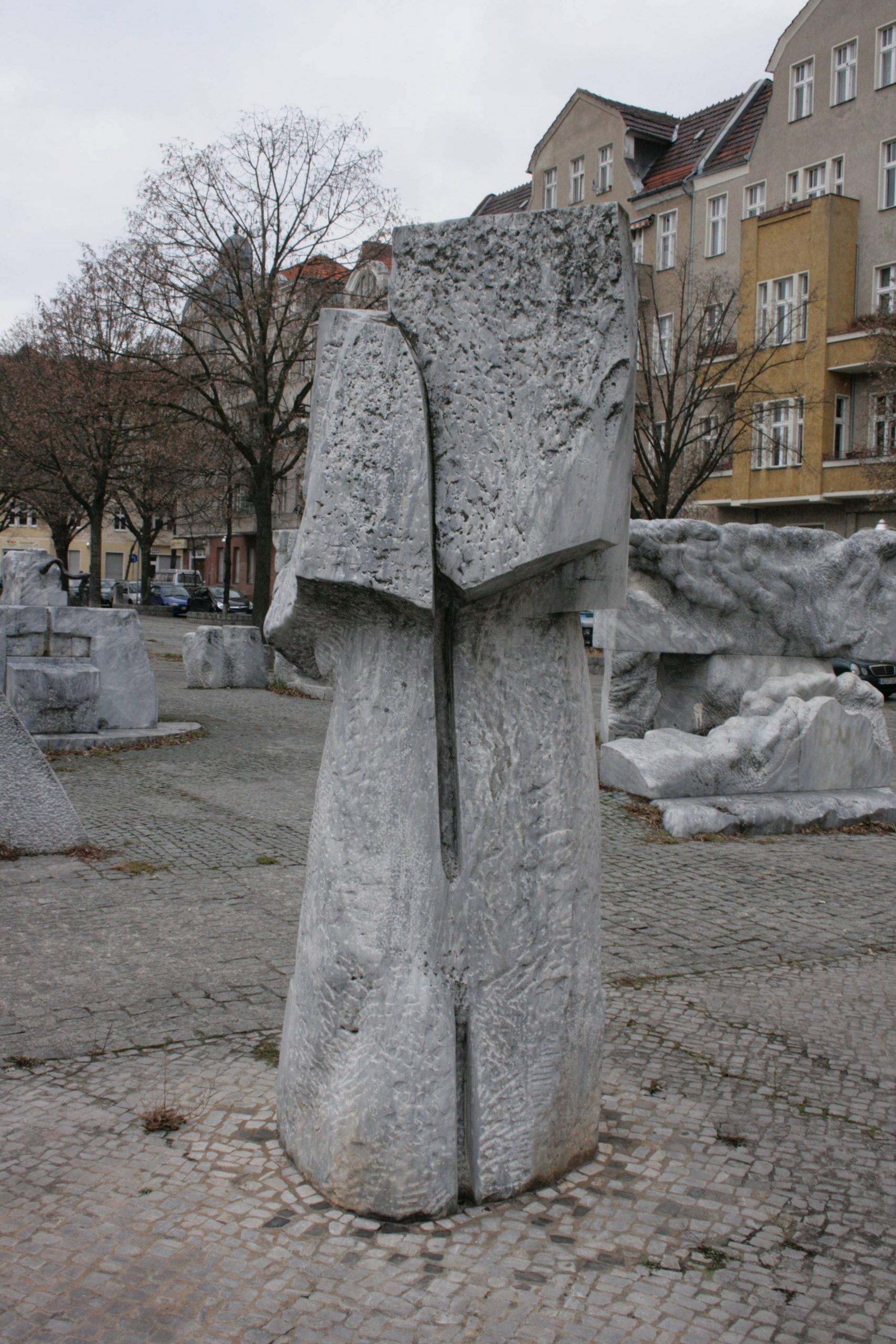 Die abstrakte Skulptur aus hellgrau geädertem Bardiglio-Marmor, möglicherweise das von Justus Chrukin geschaffene Werk, hat die Form einer Stele, bzw. einer Säule mit einem stark ausgeprägten, aber nicht ornamental gestaltetem Kapitell. An der Südseite ist in die „Säule“ ein vertikaler Spalt eingearbeitet, der die Figur in zwei Teile zu trennen schein. Der Grundriss des Objekts hat eine irreguläre Form. Im unteren Bereich ist eine Basis angedeutet, darüber erhebt sich der „Säulenschaft“, dessen Oberfläche gestockt ist. Das obere Drittel der Skulptur ist verdickt und wird von abstrakten, teils kubischen Formen dominiert (Susanne Kähler).