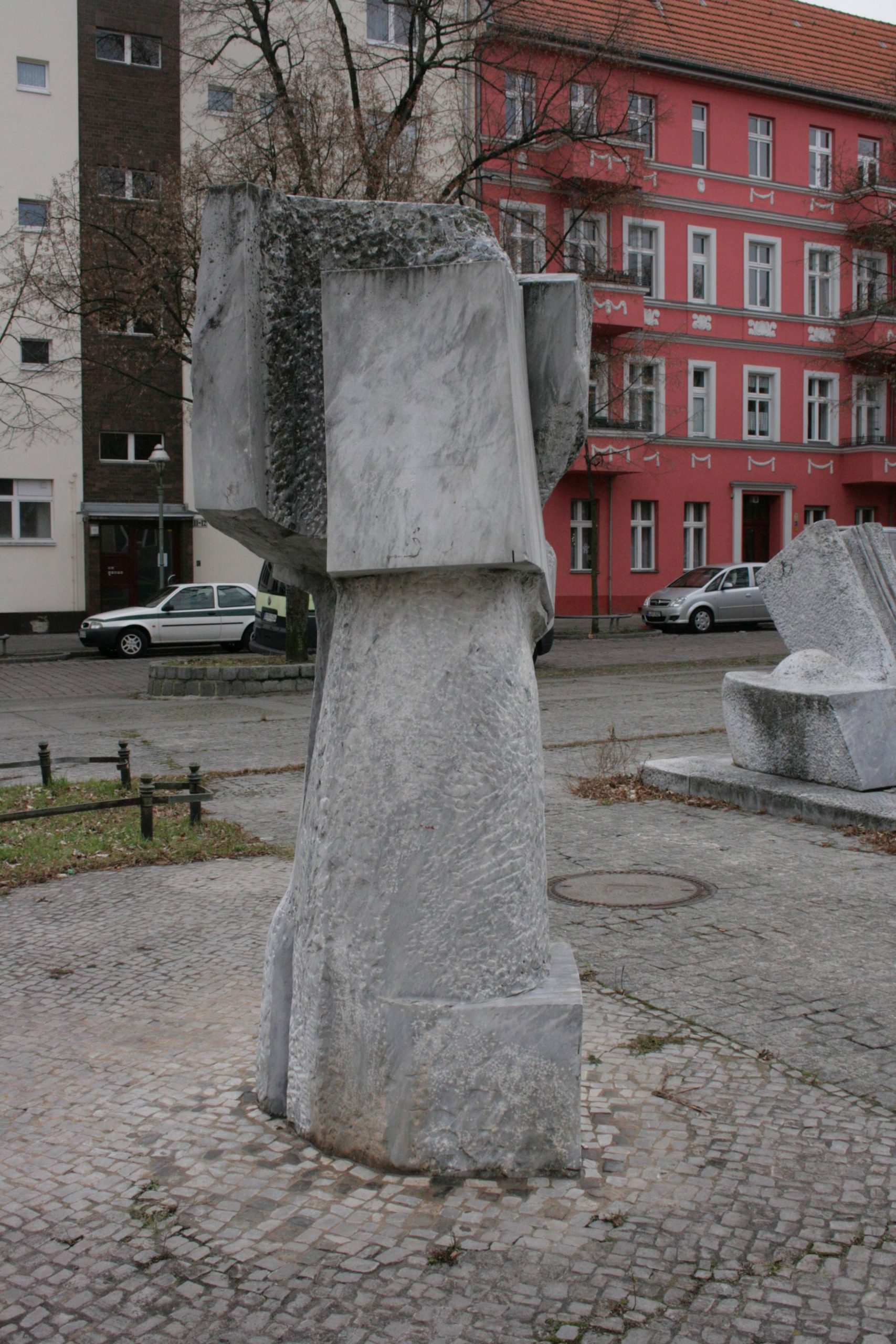 Die abstrakte Skulptur aus hellgrau geädertem Bardiglio-Marmor, möglicherweise das von Justus Chrukin geschaffene Werk, hat die Form einer Stele, bzw. einer Säule mit einem stark ausgeprägten, aber nicht ornamental gestaltetem Kapitell. An der Südseite ist in die „Säule“ ein vertikaler Spalt eingearbeitet, der die Figur in zwei Teile zu trennen schein. Der Grundriss des Objekts hat eine irreguläre Form. Im unteren Bereich ist eine Basis angedeutet, darüber erhebt sich der „Säulenschaft“, dessen Oberfläche gestockt ist. Das obere Drittel der Skulptur ist verdickt und wird von abstrakten, teils kubischen Formen dominiert (Susanne Kähler).
