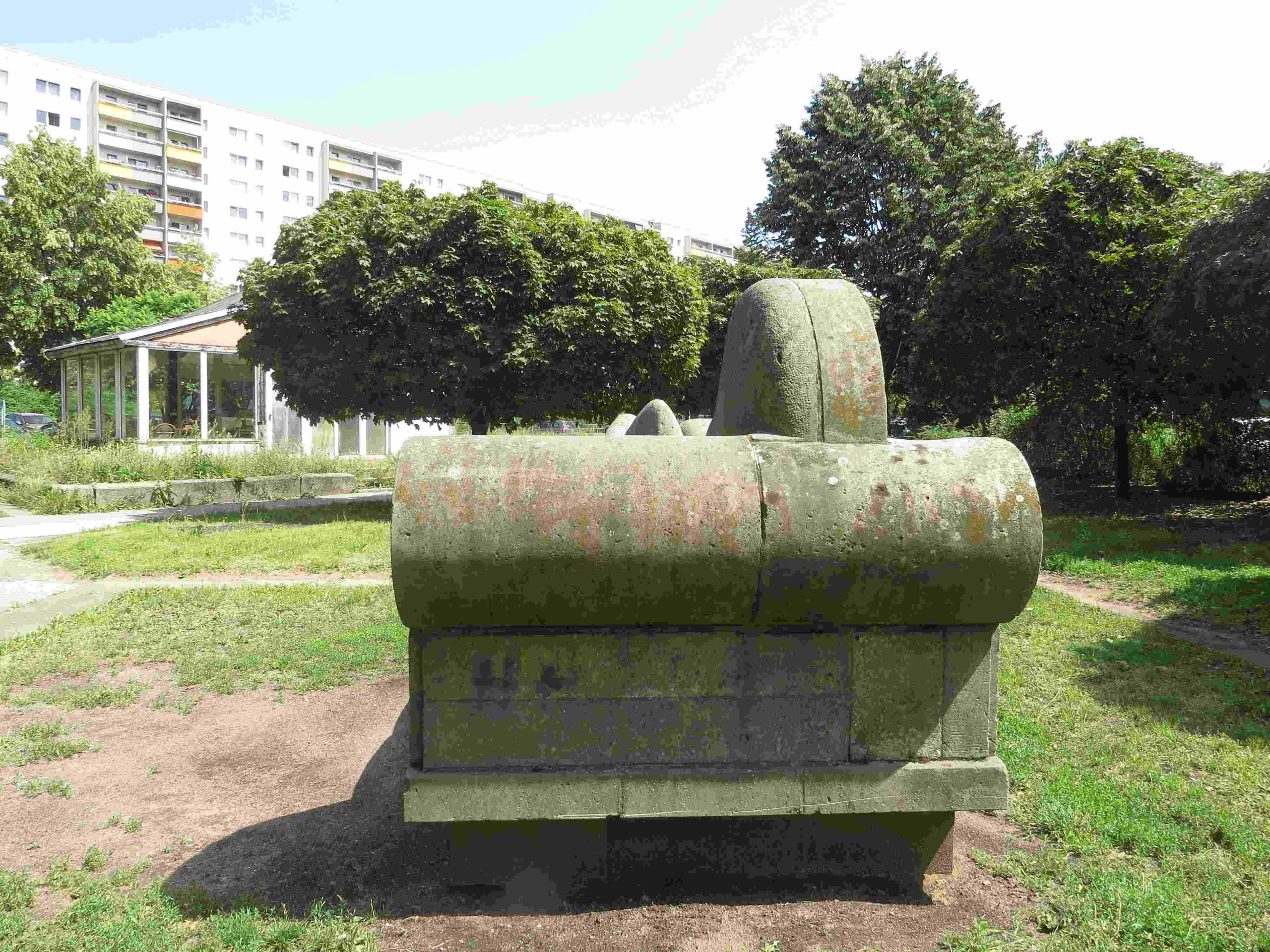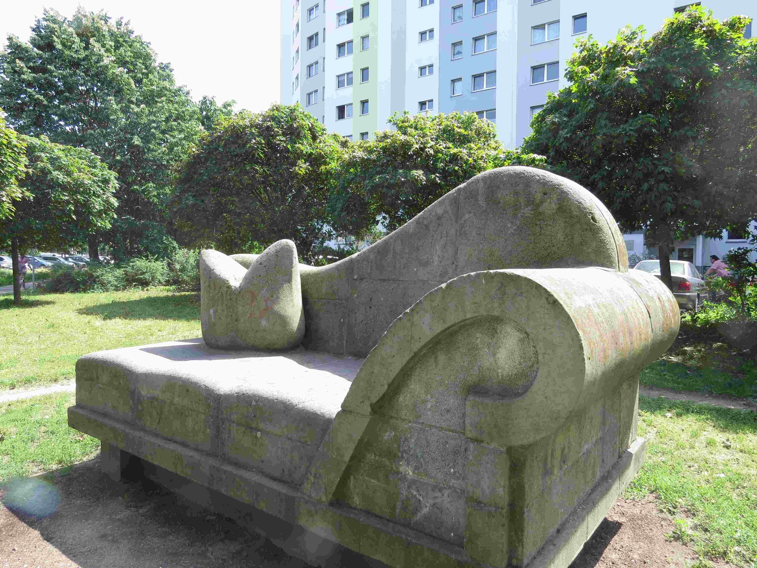 ein wenig vom eigentlichen Sockel absteht und so ein eher dekoratives als tragendes Element darstellt.Gleich darüber liegt eine Sockelplatte auf. Auf ihm ruht das eigentliche Sofa, das drei Polsterelemente in der Sitzfläche darstellt. Es gibt eine einseitig positionierte – rechts, in Frontalansicht,gelegene – Armlehne, die eine abgerundete Dreiecksform aufweist und aus zwei massiven Teilen zusammengesetzt ist. Frontal ist eine dekorative Aussparung eingelassen, die die Form der Lehne in minimierter Größe imitiert. Die Rückenlehne beginnt linksseitig in einer Rundung, die in eine deszendente Schwingung mündet und somit in ein „Tal“ führt, welches sich anschließend exponentiell in eine weitere, wesentlich erhöhte Rundung – rechtsseitig – aufschwingt. Die Lehne ist deutlich sichtbar aus fünf Einzelteilen zusammengesetzt. Die dazwischen sitzenden Fugen sind ebenfalls deutlich sichtbar. Exakt im linken Drittel der Sitzfläche ist einrechteckigessteinernes Kissen arrangiert, auf dessen Oberseite mittig eine dekorative Falz eingelassen ist. Rückseitig dehnt sich der Sockel etwa 50 Zentimeter über die Länge des eigentlichen Sofas aus und bietet damit Platz für drei – posterior betrachtet – linksseitig installierte Stufen, die in die überstehende Armlehne münden. Die Stufen nehmen exakt die linke Hälfte des Sockels in Beschlag; die rechte Seite ist komplett frei und gibt somit den Blick auf die Sockelplatte frei. Durch diesen freistehenden Bereich fällt auf, dass der Sockel – und insbesondere die Sockelplatte – eine wesentlich glattere Struktur aufweist, als der Rest der Skulptur. Unter dem letzten Stufenabsatz ist zudem eine hellere Stelle sichtbar, die bei genauerer Betrachtung aus Beton besteht. Hier wurde also vermutlich die Ausbesserung einer bestehenden Beschädigung des Ursprungsmaterials vorgenommen.An der Armlehne sind auchhier Aussparungen vorgenommen, wie sie auch auf der Frontalansicht der Lehne beobachtbar sind, nur das hier die Form der Stufen einbezogen wurde. Die gleiche Art von Aussparungziert zudem die Rückseite der Rückenlehne. An dieser fällt zudem auf, dass sie aus mindestens sechs weiteren rechteckigen Steinen besteht, als frontal vorerst sichtbar sind (Fabian Stammen).